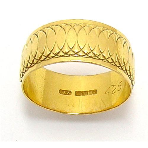 22 Kt yello gold wedding band with timeless design of interlaced circles. Fully marked on inside with maker's mark S&W and marks for London, 1968. 10.5mm wide, 6dwt (9g)