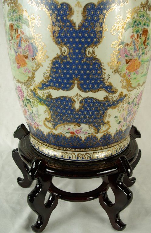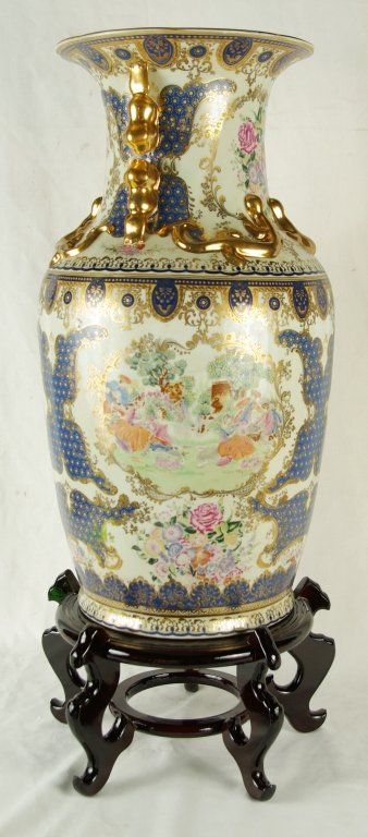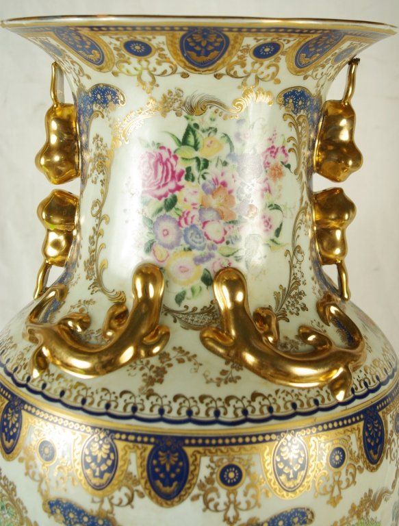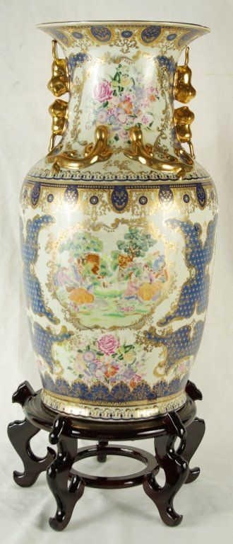 Large 24 " Chinese Porcelain Famille Rose / Canton Vase, with foliate rims and moulded Buddhist lion handles, foliate lappet and kui dragons to the shoulder, decorated and gilt with panels of pheasants, flowering branches and rockwork, surrounded by scattered flower sprays, auspicious objects. Measures approx 24" x 12" Condition: Excellent