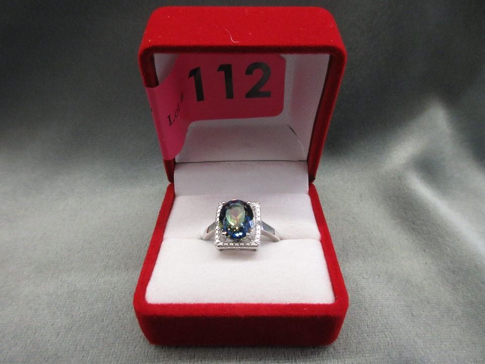Oval cut ocean blue topaz. 2 Side diamonds. Sterling silver. Includes $350 Certificate