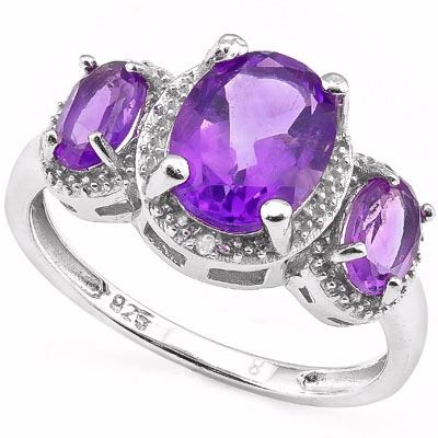 Genuine Amethyst gemstone ring with center 9x7mm and side stones 6x4mms. Set in Platinum over Sterling Silver with 0.01ctw genuine Diamond accent. Size 7. 3.1g