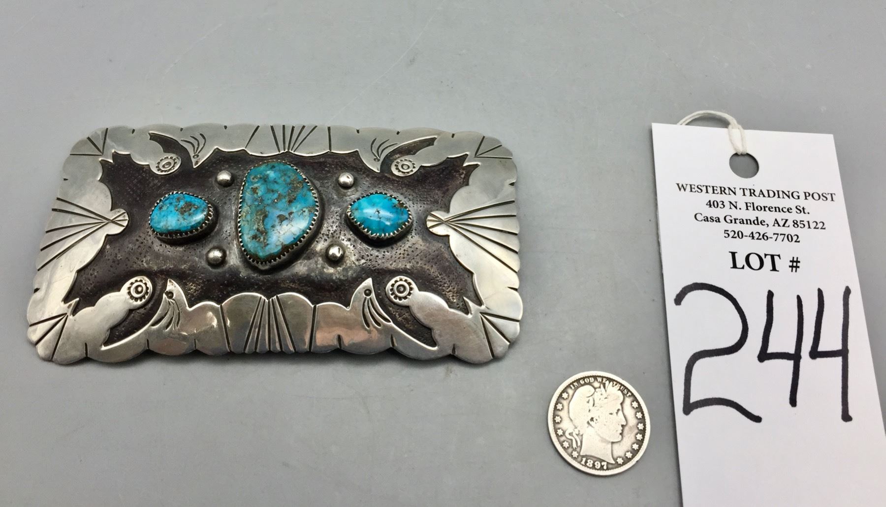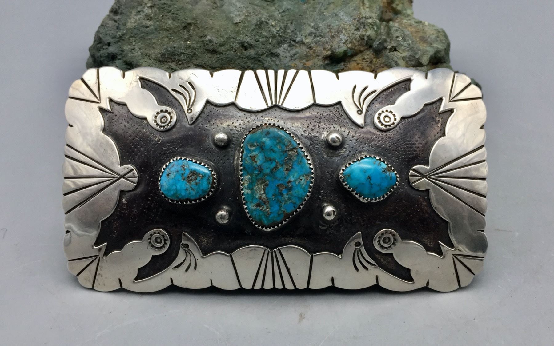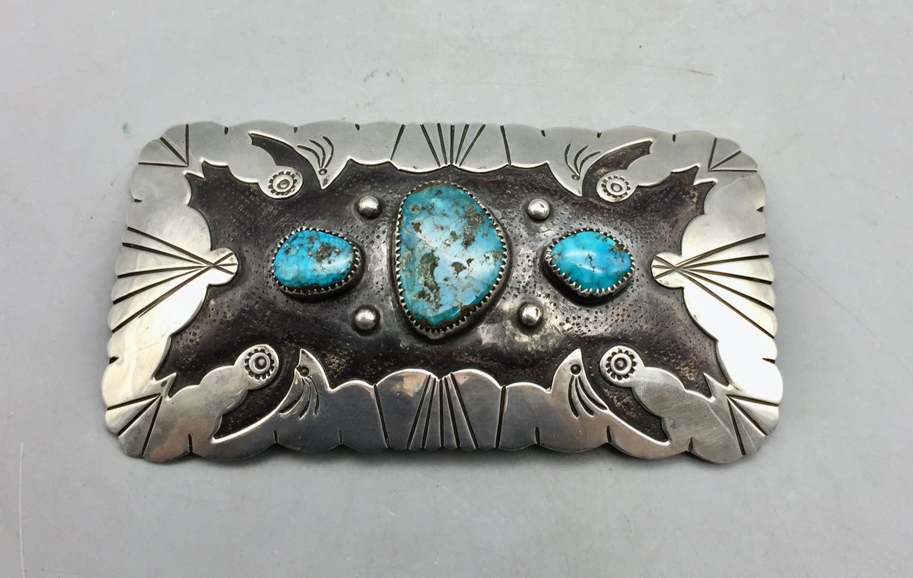 Description: For sale in this lot is a stunning, large size, 3 stone turquoise belt buckle. Features a unique overlay design with three great turquoise stones set in sterling silver. Maker: Hallmarked KE. Approx. Age: Vintage to modern. Size: Measures 4-7/8†wide X 2-1/2†tall. Fits a 1-1/2†belt. Weighs 89 grams. Condition: Good for its age, normal wear expected. Please look closely at the pictures - they are an important part of our description. Shipping: There will be a $5 handling / packaging fee for shipping this lot. The actual cost of postage will be added on top of that.