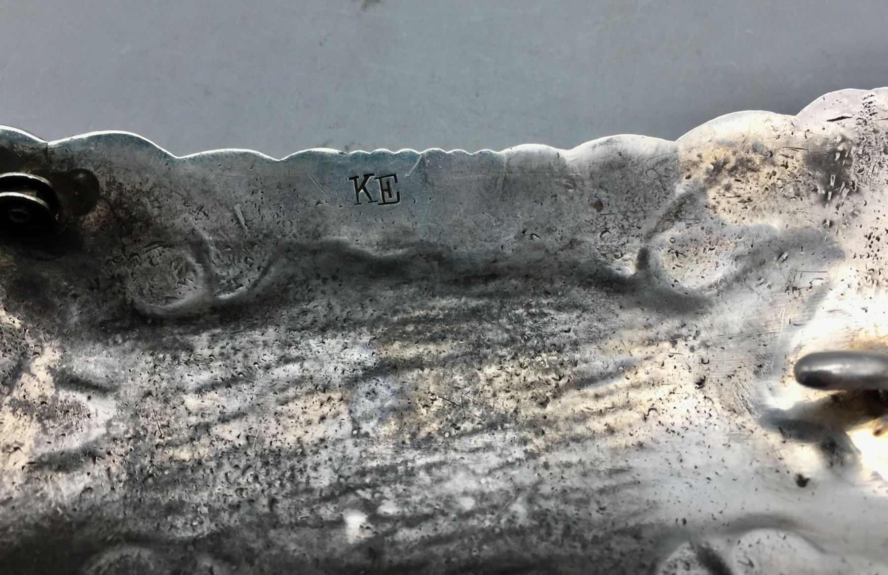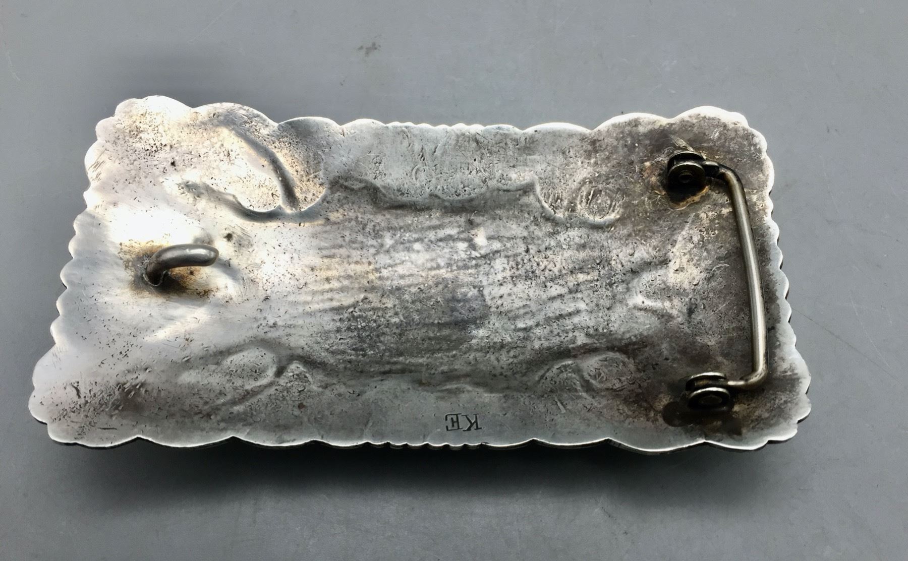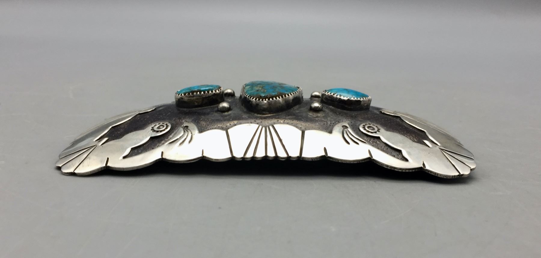 Description: For sale in this lot is a stunning, large size, 3 stone turquoise belt buckle. Features a unique overlay design with three great turquoise stones set in sterling silver. Maker: Hallmarked KE. Approx. Age: Vintage to modern. Size: Measures 4-7/8†wide X 2-1/2†tall. Fits a 1-1/2†belt. Weighs 89 grams. Condition: Good for its age, normal wear expected. Please look closely at the pictures - they are an important part of our description. Shipping: There will be a $5 handling / packaging fee for shipping this lot. The actual cost of postage will be added on top of that.