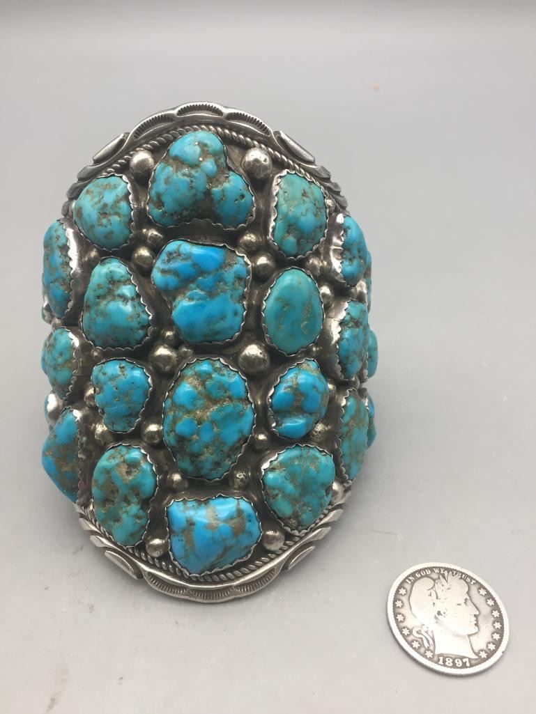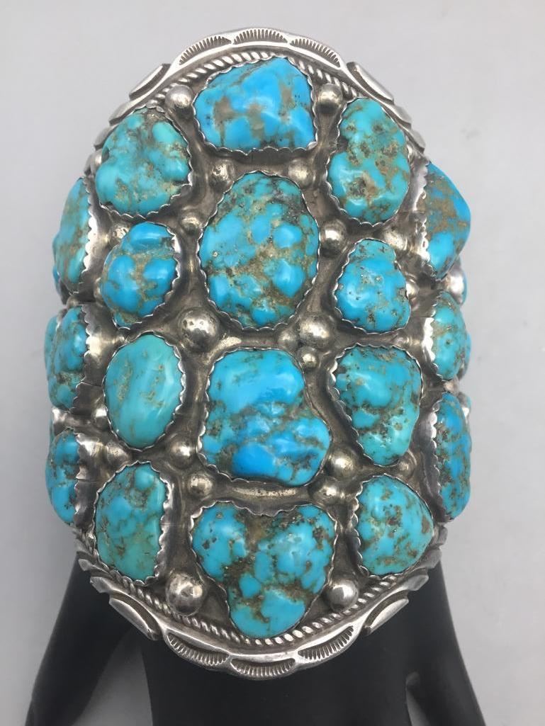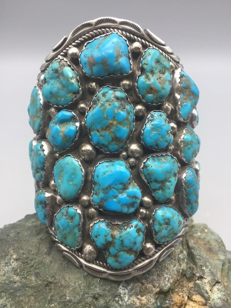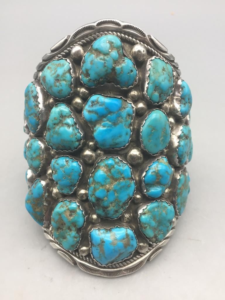 Presented for sale in this lot is a large, 30 stone, blue turquoise cluster bracelet featuring sterling silver accents. It's huge! Maker: Unmarked. Approx. Age: Contemporary. Size: Measures 6" with a 1-1/8" opening, fits a 7-1/8" wrist. Is 4" wide and weighs 182.4 grams. Condition: Good for its age, normal wear expected. Please look closely at the pictures - they are an important part of our description. Shipping: There will be a $5 handling, packaging fee for shipping this lot. The actual cost of postage will be added on top of that.