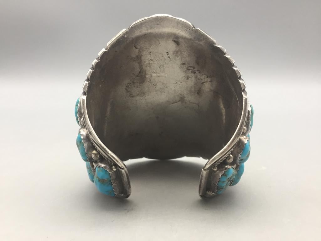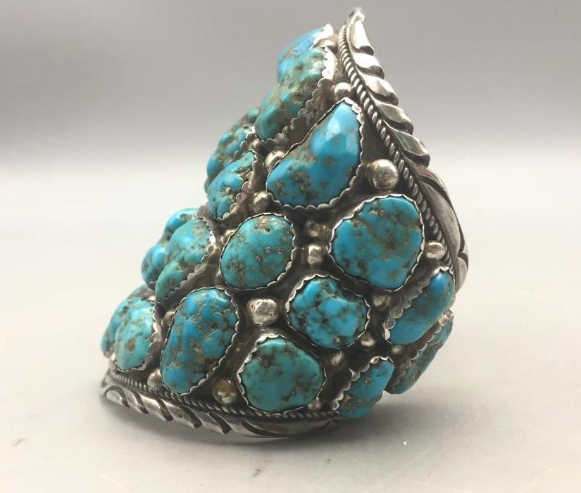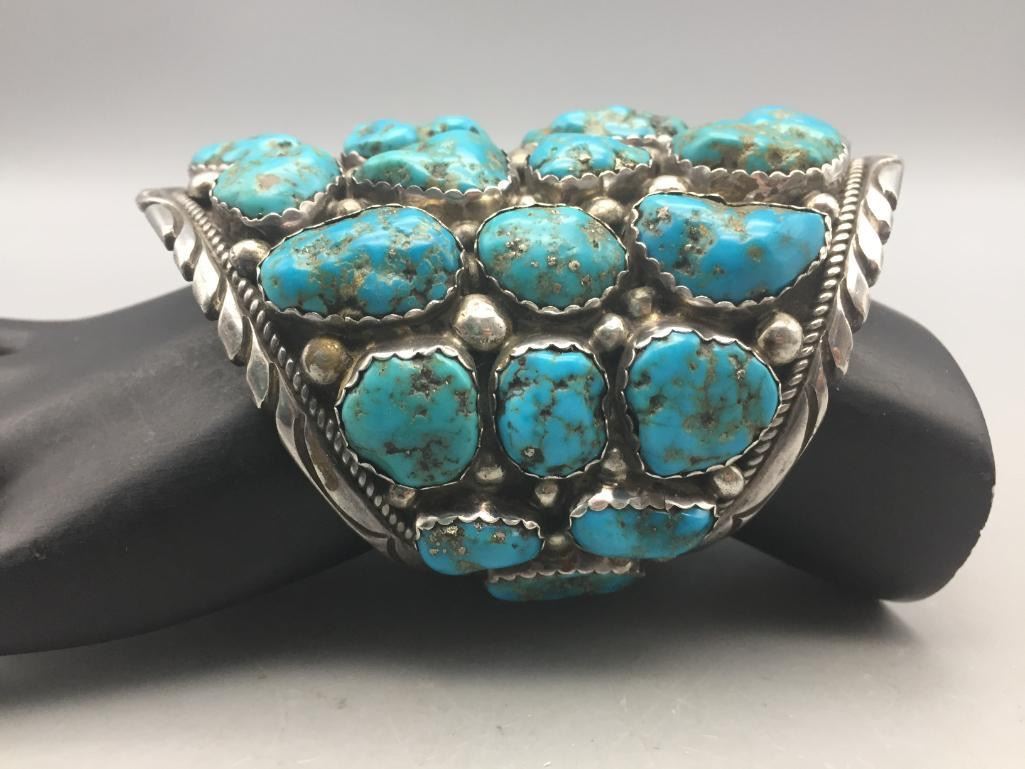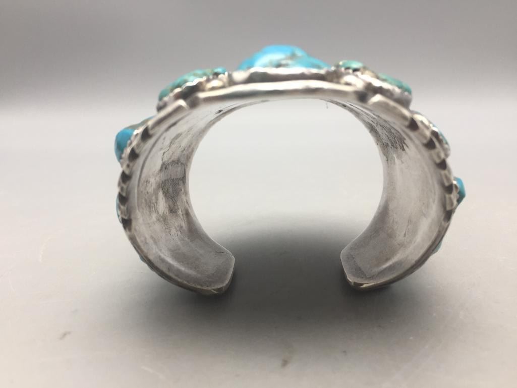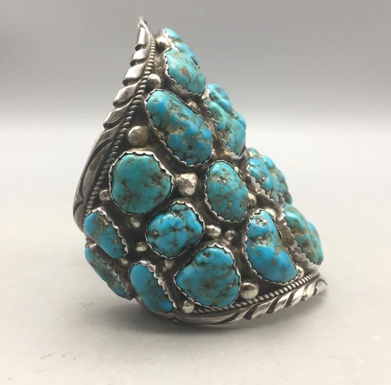 Presented for sale in this lot is a large, 30 stone, blue turquoise cluster bracelet featuring sterling silver accents. It's huge! Maker: Unmarked. Approx. Age: Contemporary. Size: Measures 6" with a 1-1/8" opening, fits a 7-1/8" wrist. Is 4" wide and weighs 182.4 grams. Condition: Good for its age, normal wear expected. Please look closely at the pictures - they are an important part of our description. Shipping: There will be a $5 handling, packaging fee for shipping this lot. The actual cost of postage will be added on top of that.