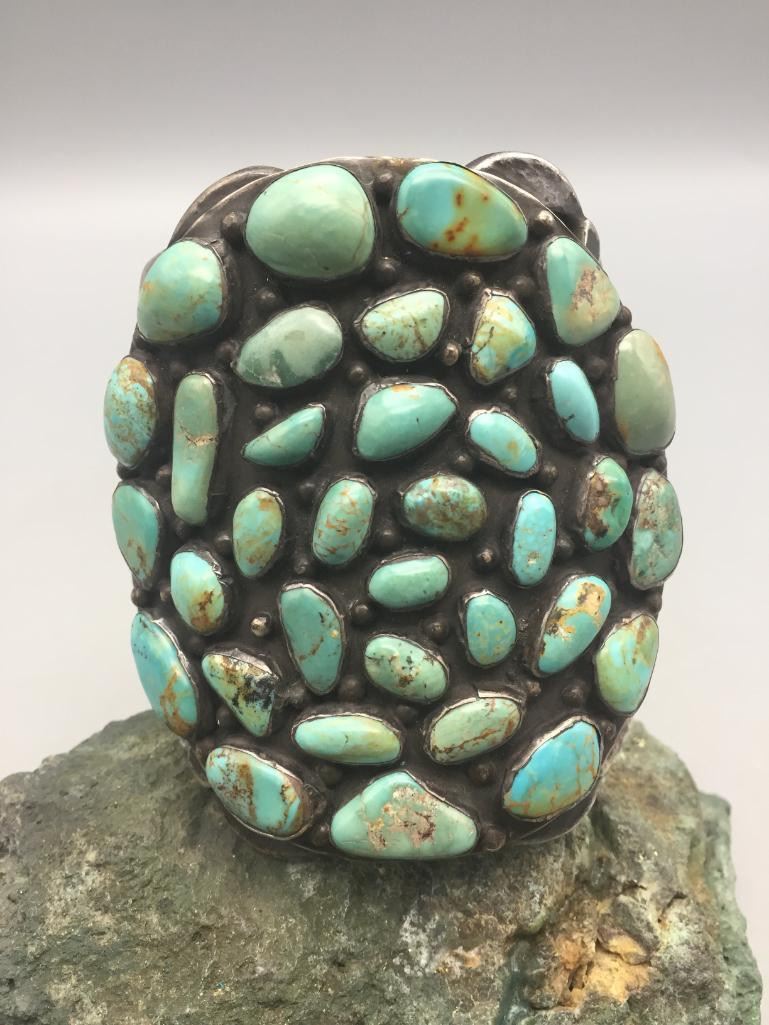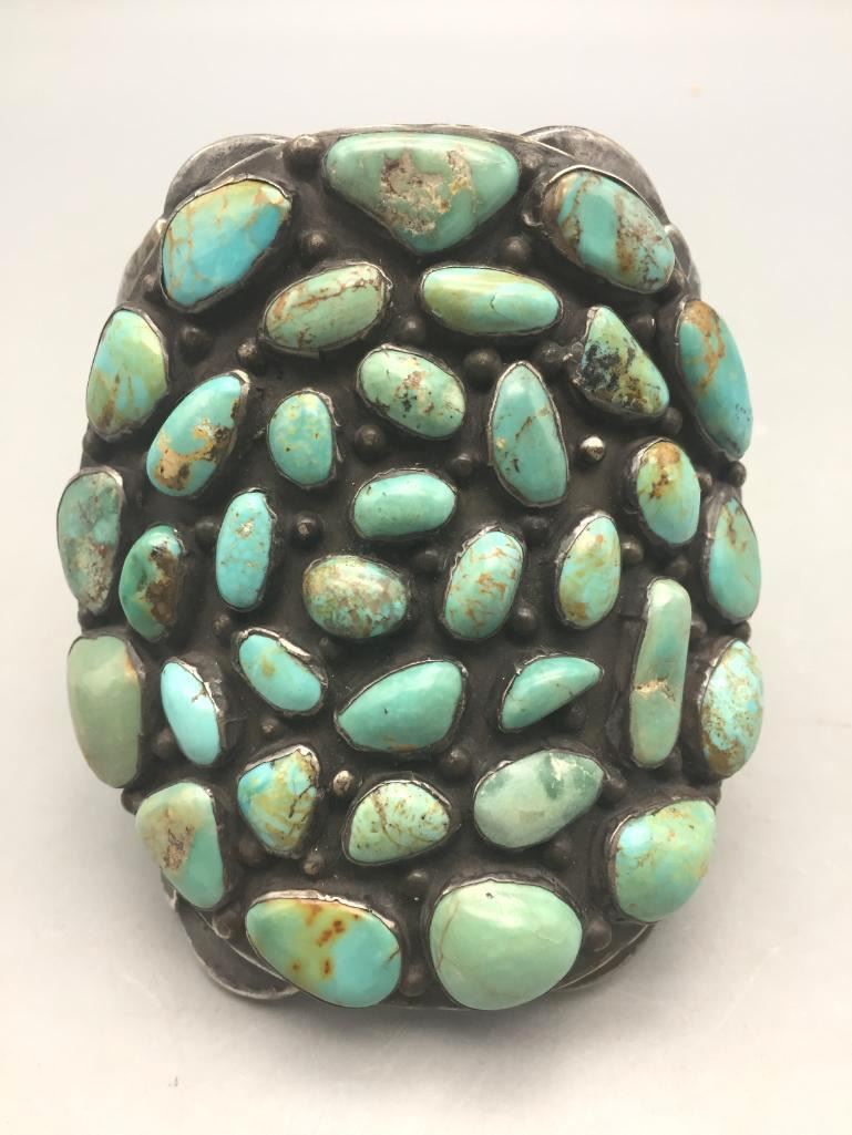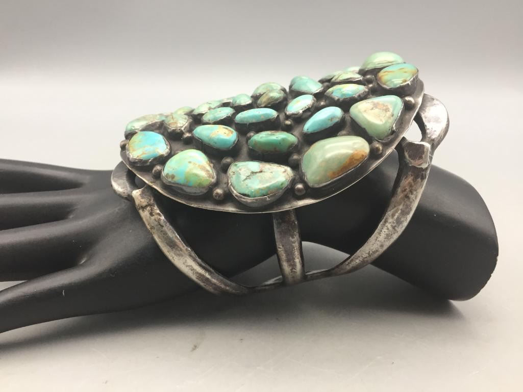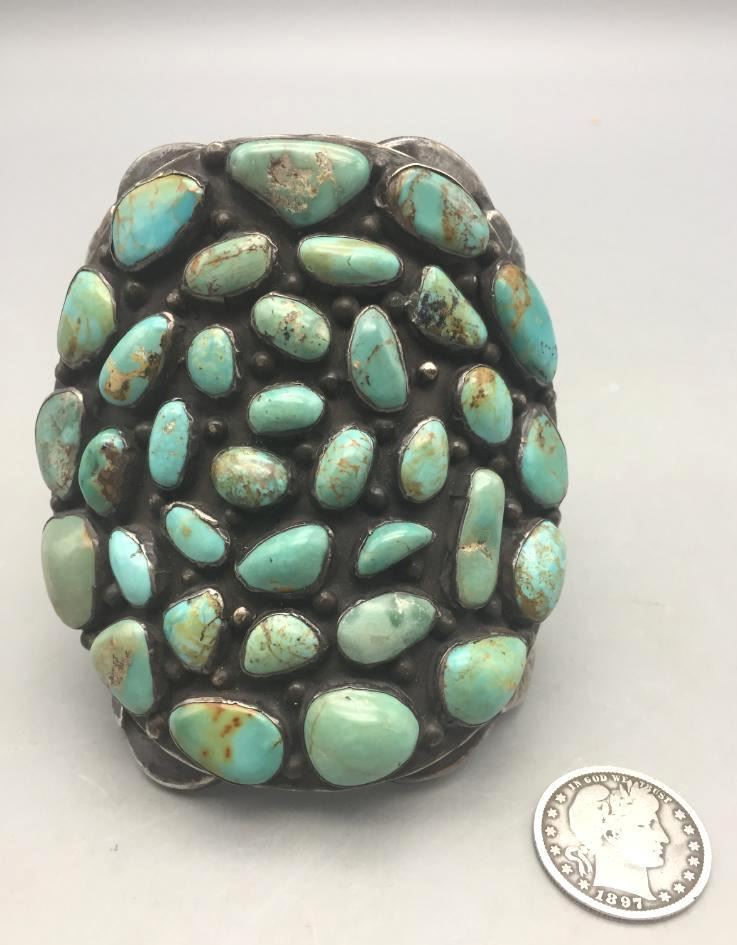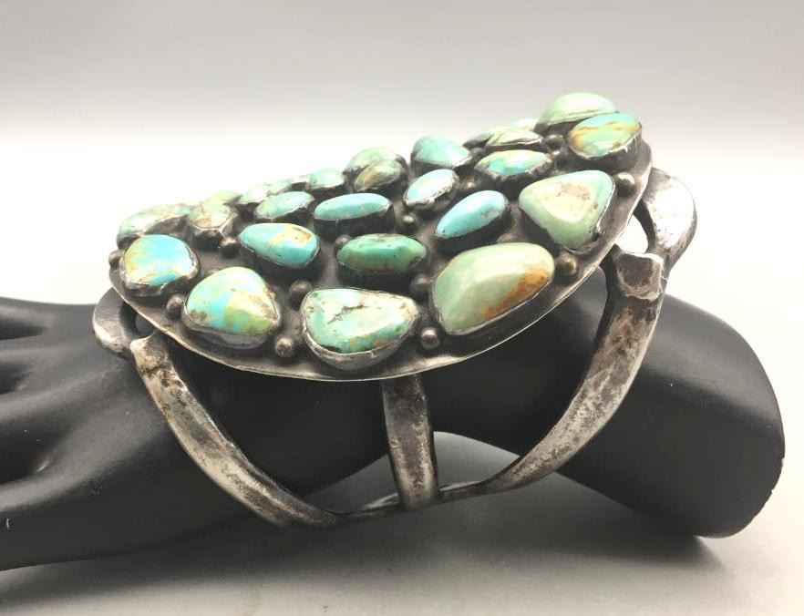 Offered for sale in this lot is a nice, large, 35 stone, green turquoise cluster bracelet with sterling silver accents. This is another statement kind of bracelet! Maker: Unmarked. Approx. Age: Fairly Contemporary. Size: Measures 6-1/8" with a 1" opening, fits a 7-1/8" wrist. It is 3-3/4" wide and weighs 224.2 grams. Condition: Good for its age, normal wear expected. Please look closely at the pictures - they are an important part of our description. Shipping: There will be a $5 handling, packaging fee for shipping this lot. The actual cost of postage will be added on top of that.