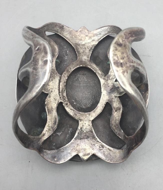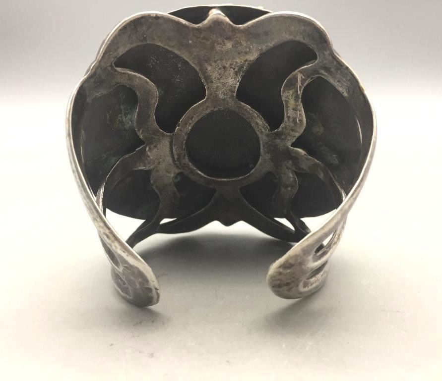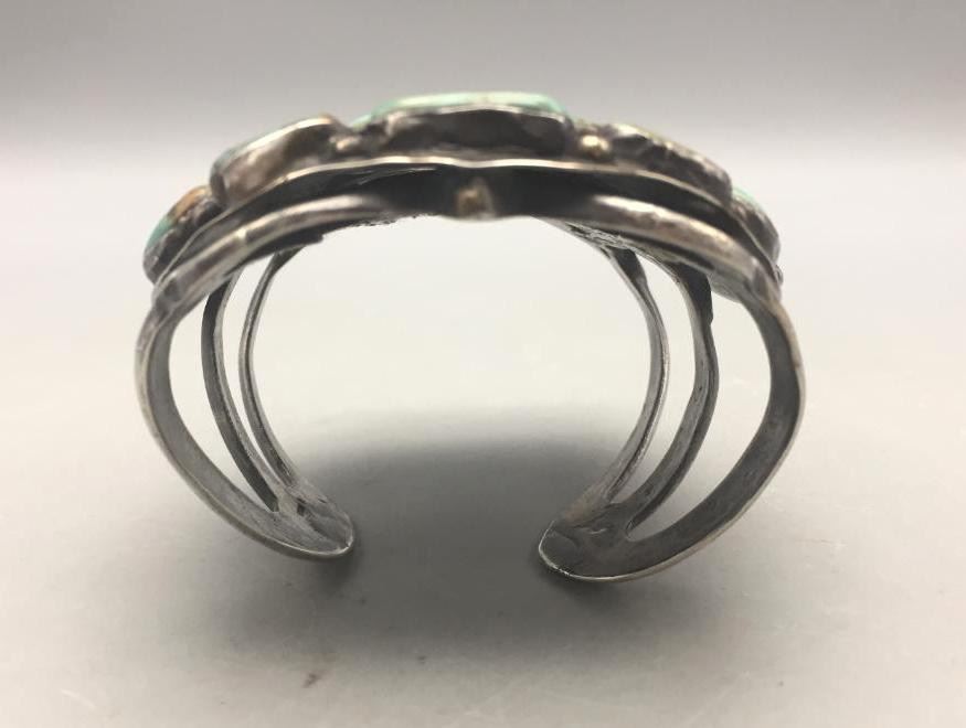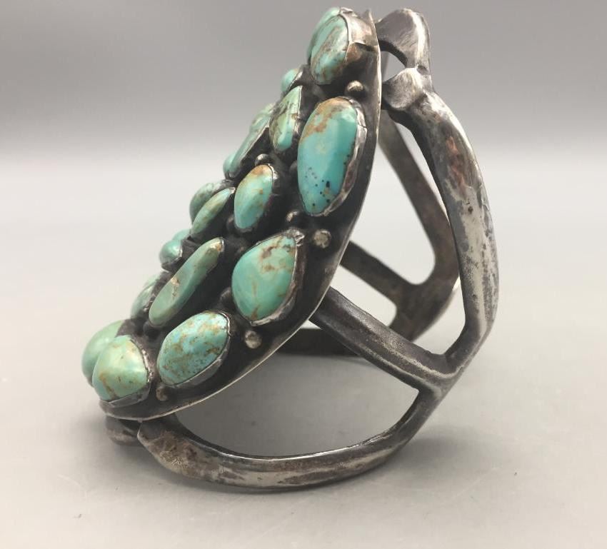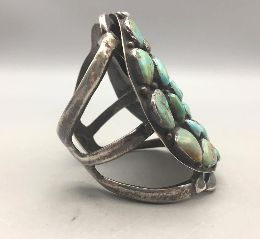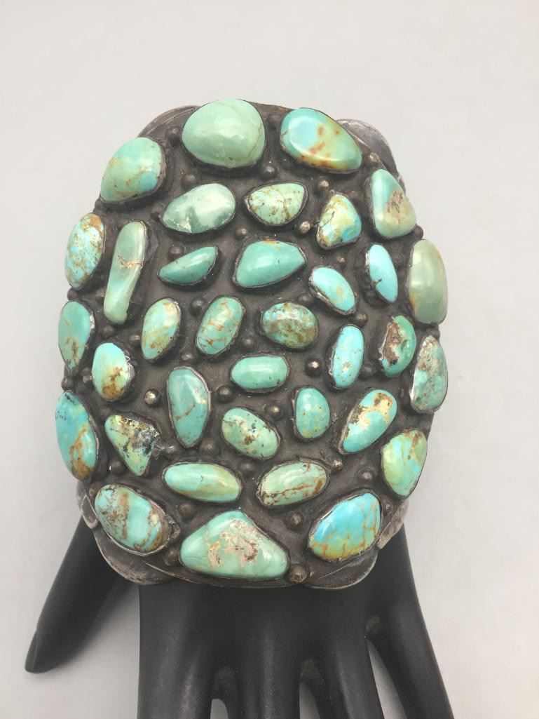 Offered for sale in this lot is a nice, large, 35 stone, green turquoise cluster bracelet with sterling silver accents. This is another statement kind of bracelet! Maker: Unmarked. Approx. Age: Fairly Contemporary. Size: Measures 6-1/8" with a 1" opening, fits a 7-1/8" wrist. It is 3-3/4" wide and weighs 224.2 grams. Condition: Good for its age, normal wear expected. Please look closely at the pictures - they are an important part of our description. Shipping: There will be a $5 handling, packaging fee for shipping this lot. The actual cost of postage will be added on top of that.