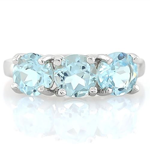 Classic 3CTW Baby Swiss Blue Topaz gemstone ring set in Platinum over Sterling Silver for added brilliance. Blue Topaz has excellent color and clarity, approx. 6mm each gem. Size 7. 2.5g