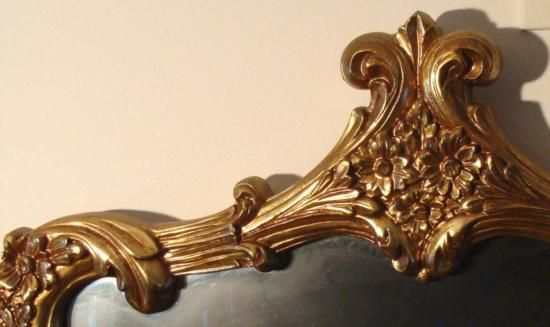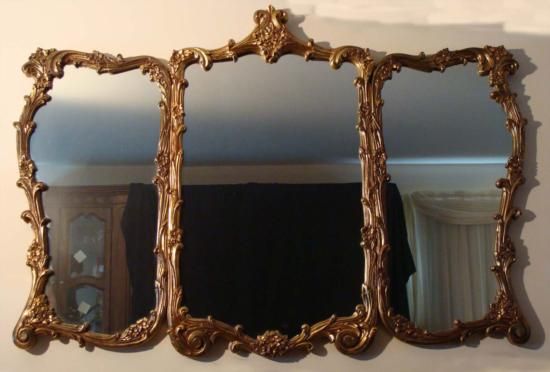 This three piece gilded mirror set was custom made for a man in Chicago in the 1960's. He never picked up his order, and the mirrors sat unclaimed in the shop for a long time, until they were eventually sold to another man. Now they are for sale again. * The frames are gold painted wood, with an ornate design. The entire set is 6 feet 3 inches wide, and 4 feet 2 inches tall. Their condition is very good. * * This is a grand set of mirrors that will bring an openness and elegance to any room. * * If you are bidding on furniture or other extremely heavy/large items, please be aware that it is the BUYER'S responsibility to arrange for pick-up and/or shipping of the item from either our Chicago, Illinois warehouse or other location, depending on where the item is being stored. * * If you are unable to pick up the item yourself, please contact a local carrier (such as a trucking or moving company) to arrange for pick-up and shipping of the item. For purchases where we must meet you or your carrier outside our Chicago area warehouse, and/or where large multiple items are moved out of our warehouse, there will be a small handling fee. * * We strongly suggest you contact the carrier of your choice and inquire as to the approximate cost for shipping prior to placing your bid.