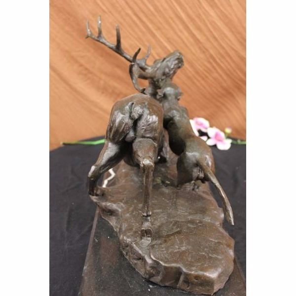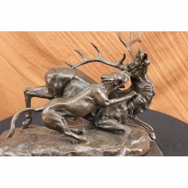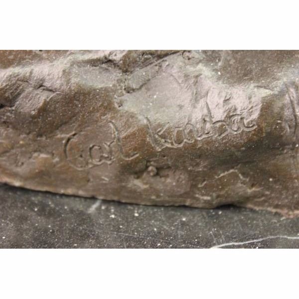 They lurk in the shadows. Their eyes see all. Their movements are lethally stealth. You won't know you're being hunted until they pounce. This poor moose discovered just that as he took a lazy moment to graze in what he thought was a deserted field. A fast moving Jaguar strategically slips beneath the moose and curls its massive paws on the moose's back. He sinks his canines into its ear. His face pulls back in a vicious snarl and his ears flatten. The moose begins to loose his balance but if he does he is lunch. A wild cat's bite can crush its prey's bones, leaving the victim helpless. The moose will still be alive when the Jaguar begins to feed. 100% bronze and handmade, this carefully detailed brown patina sculpture was cast using the "Lost Wax Method" and signed by the artist Carl Kauba. Condition : This sculpture is in perfect condition. Bronze Dimensions with Marble Base:Height 13" x Width 16.5" Marble Dimensions:16,5" X 8". Height without base: 12" Weight : 39 LBS Inventory : 53X219110535