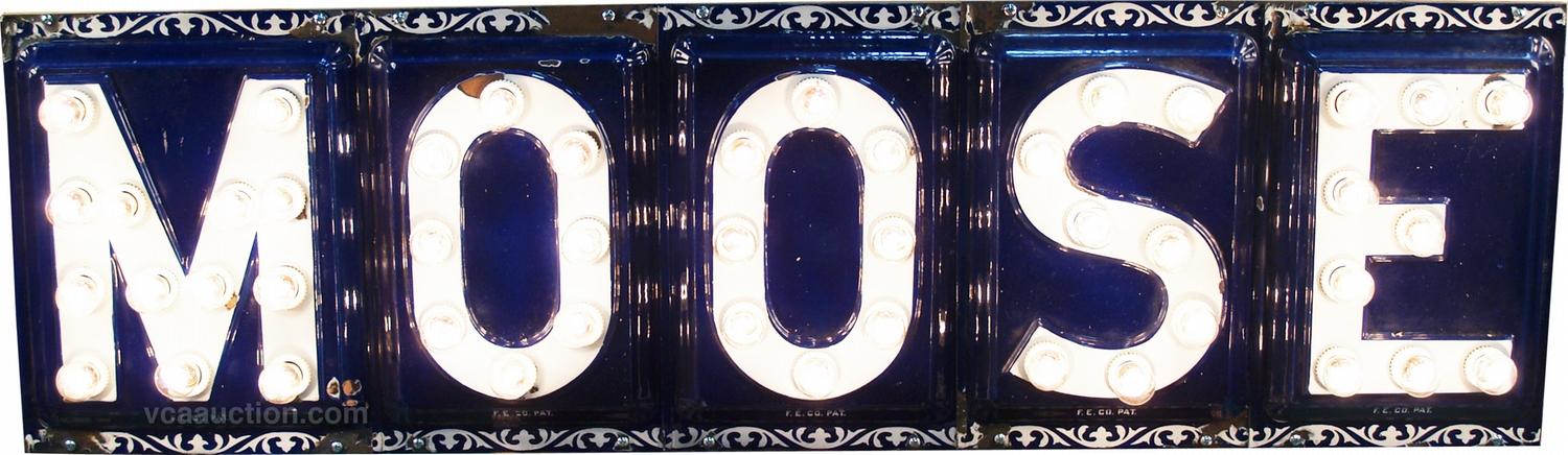 One of a Kind "Moose" Light bulb Lit Porcelain Squares Sign from 1 of the 2 Original Moose Lodges in Crawfordsville Indiana.. Sign from 1903. Completely Rewired and New Frame each piece - 13" x 19" & all piece's together approx. - 67" x 19"