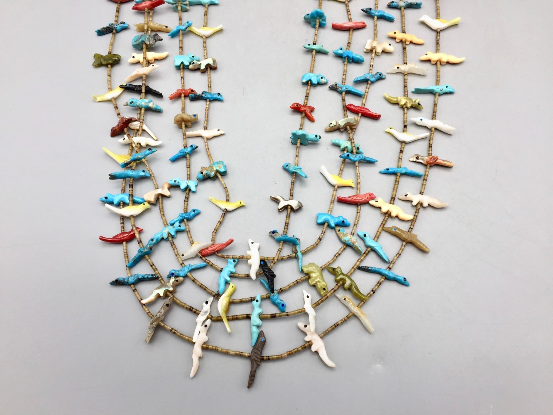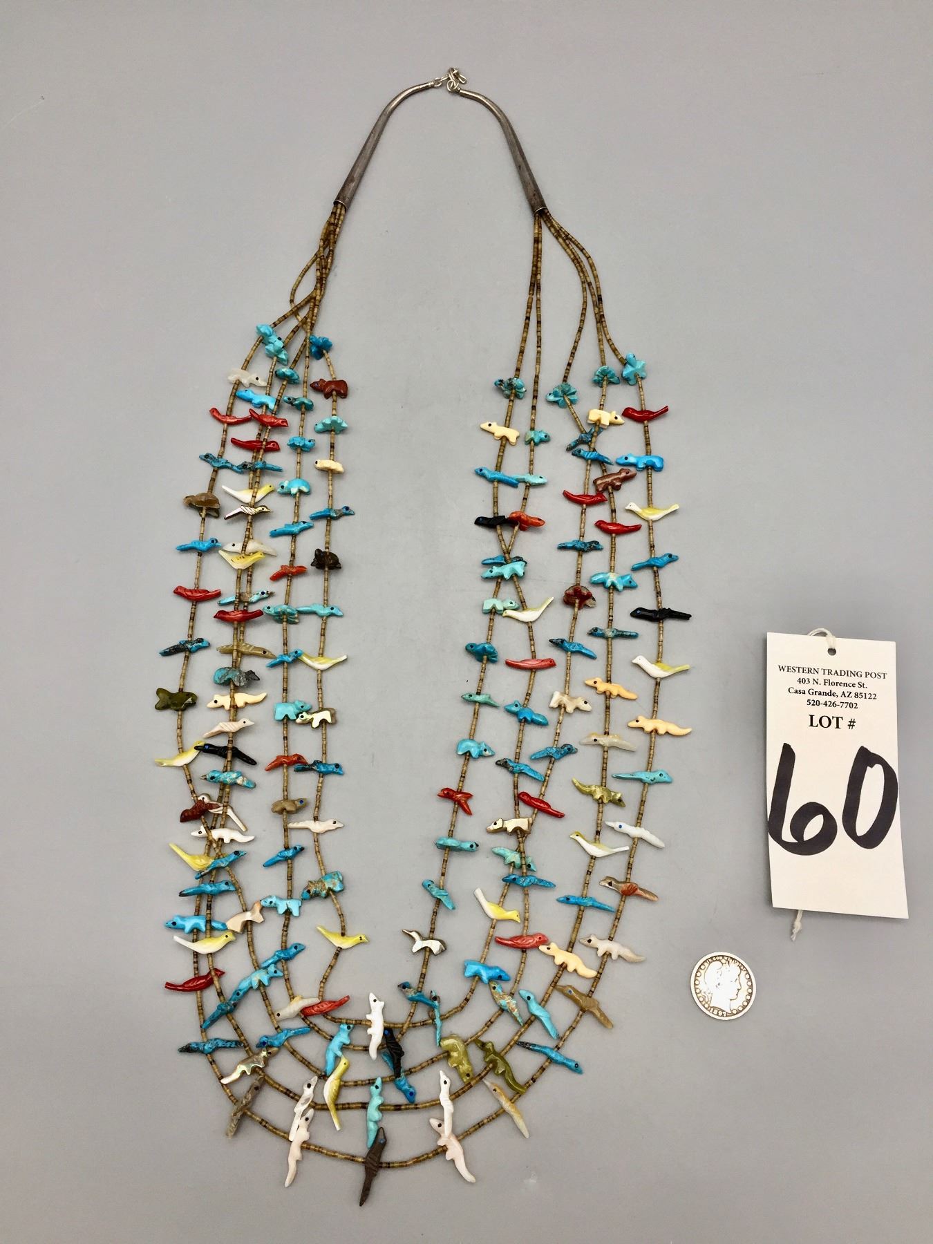 Description: Offered in this lot is a large, five-strand fetish necklace featuring a variety stones in various animal shapes. It has sterling silver findings. A fetish expert looked at it and said there was a mixture of various carvers strung on this necklace. Maker: Various Zuni artists. Approx. Age: Vintage, circa 1970s. Size: Fits a 34” neck. Weighs 111.7 grams. Condition: Good for its age, normal wear expected. Please look closely at the pictures - they are an important part of our description. Shipping: There will be a $5 handling / packaging fee for shipping this lot. The actual cost of postage will be added on top of that.