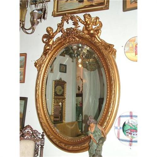 PERIOD large French Empire mirror , beveled oval glass, wood heavily carved with cherubim?s, acanthus leaves and other carvings to Louis XVI style,and gilt.Very important dimensions 63"high/ 43"wide. compare with the size of the chair (left side)