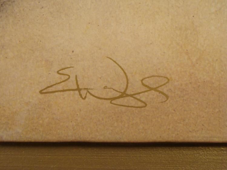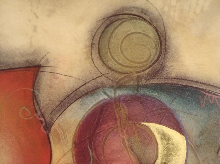 This large art print portrays abstract figures in a rich setting, including gold foil. It is laminated on board, with gold painted frame, and makes an attractive and impressive piece. * Artist: Not known, but signed with the initials EWG.Frame size: 40 x 57 inchesCondition: Excellent