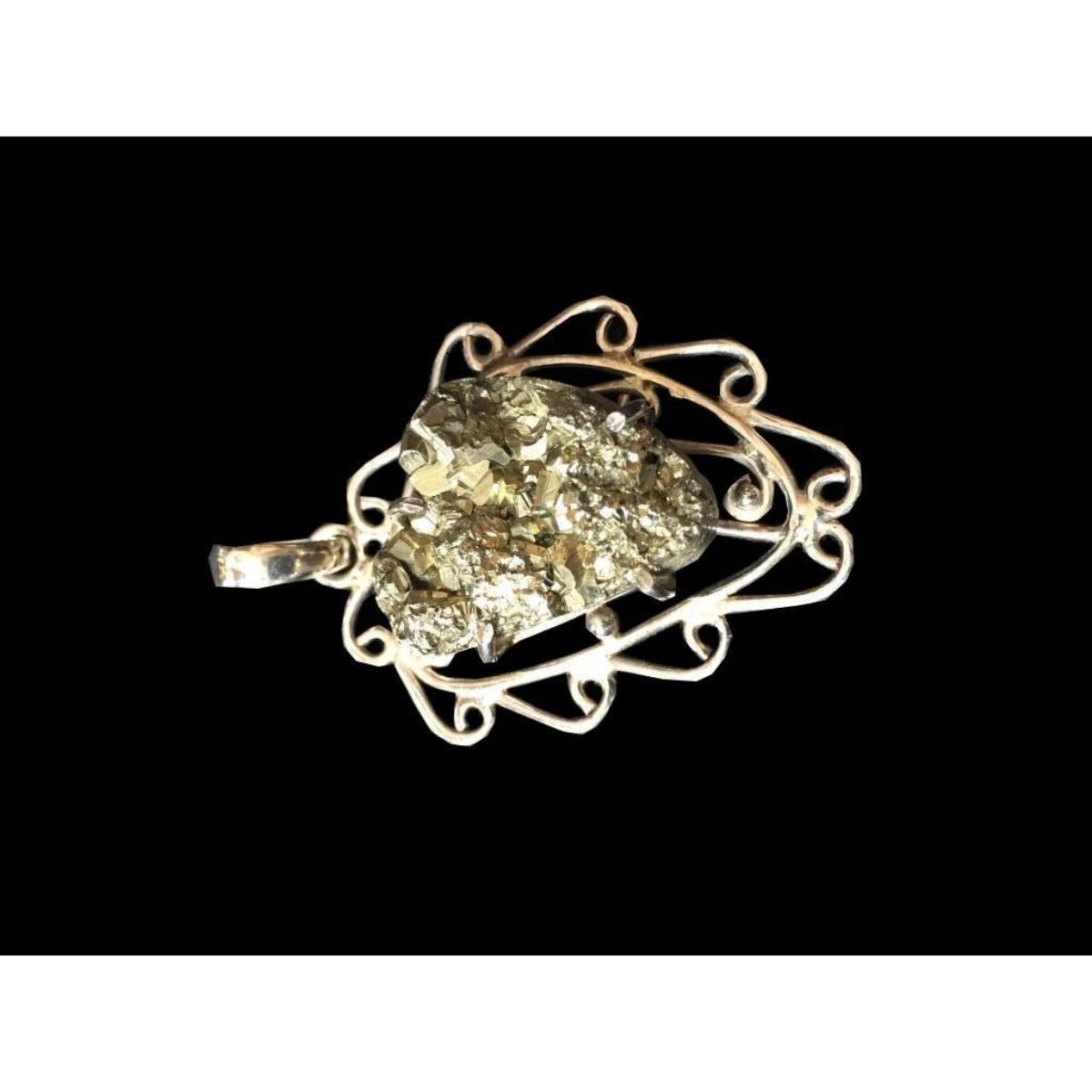 Abstract hand-crafted pendant, features a large chunk of "fool's gold" pyrite set into an organic shape, stamped .925 sterling silver, pendant setting. 2 1/4" L X 1 1/4" W. .7 oz weight.