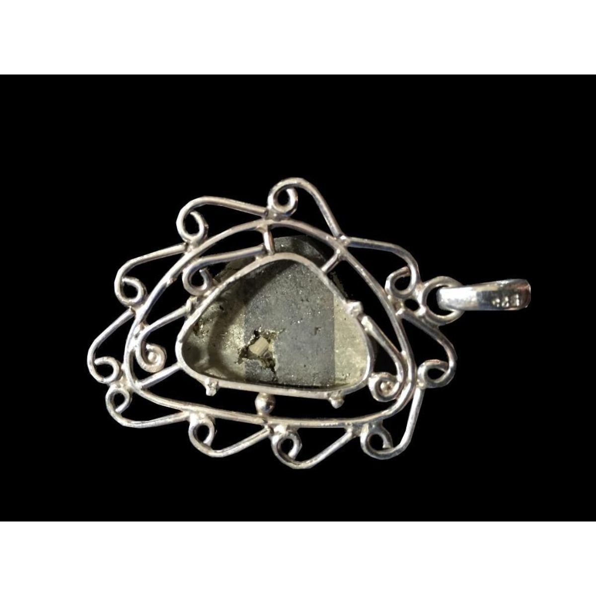 Abstract hand-crafted pendant, features a large chunk of "fool's gold" pyrite set into an organic shape, stamped .925 sterling silver, pendant setting. 2 1/4" L X 1 1/4" W. .7 oz weight.