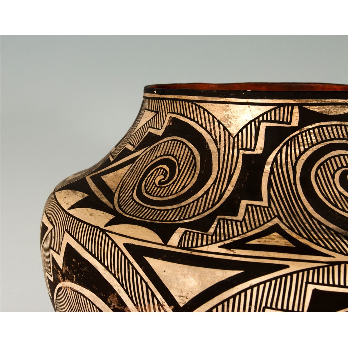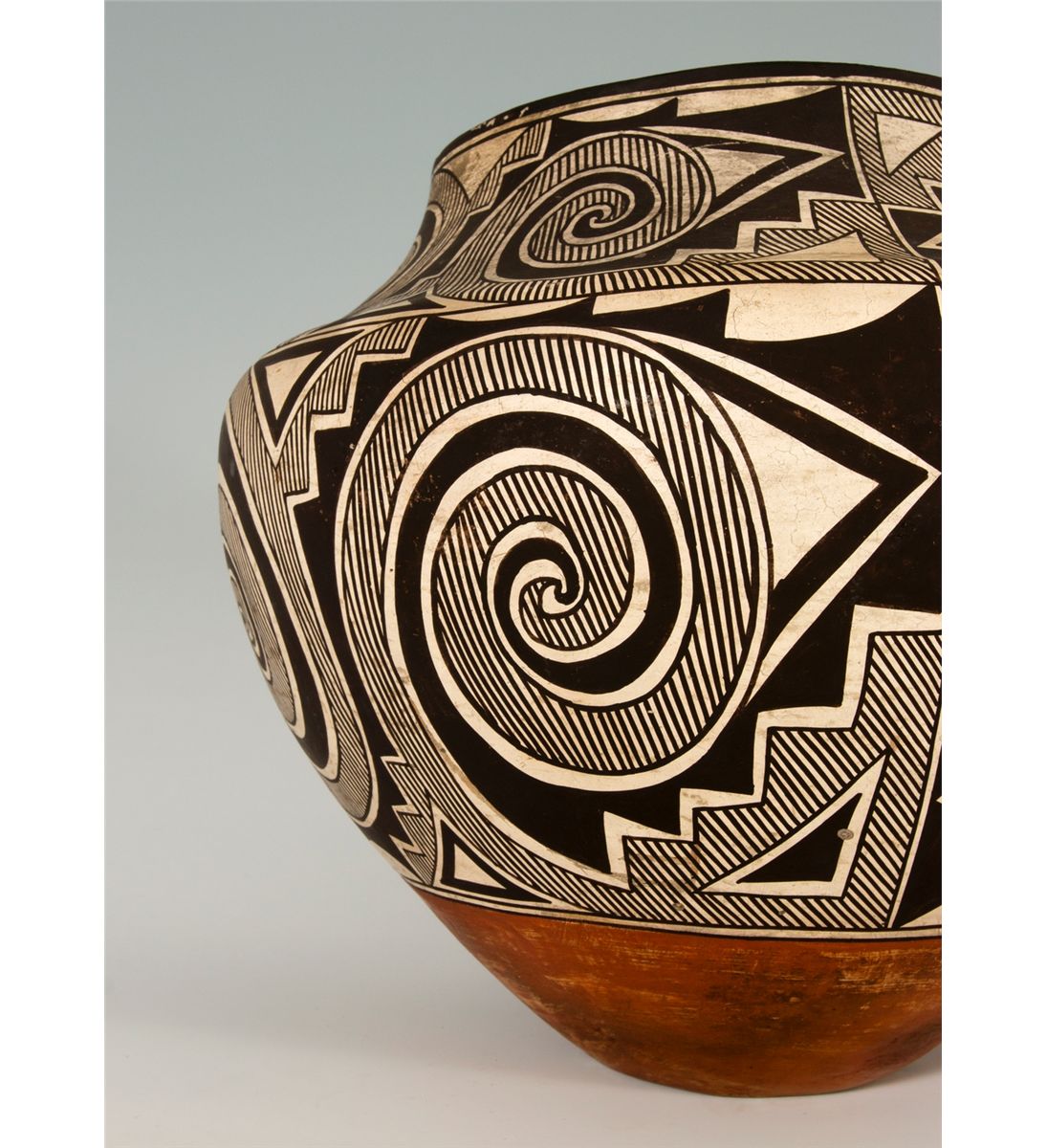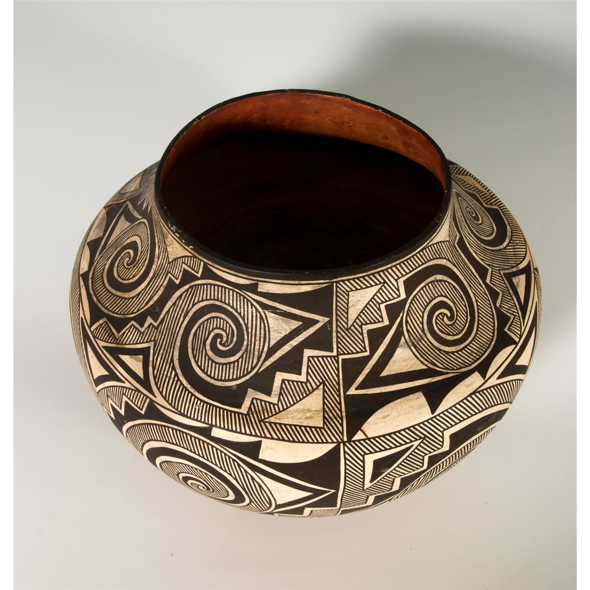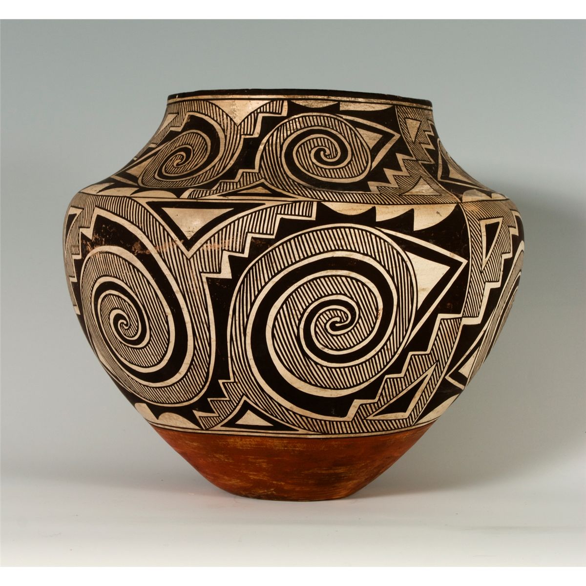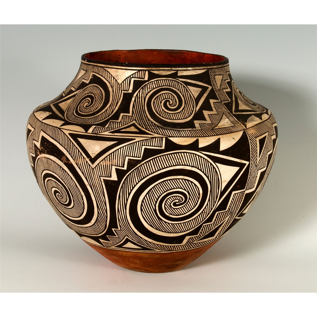 Large Acoma Olla. 11.5" tall, 14" diameter. Tularosa design in black and white with a red base and interior. Fine hatched and solid geometric layout. Late 19th century.