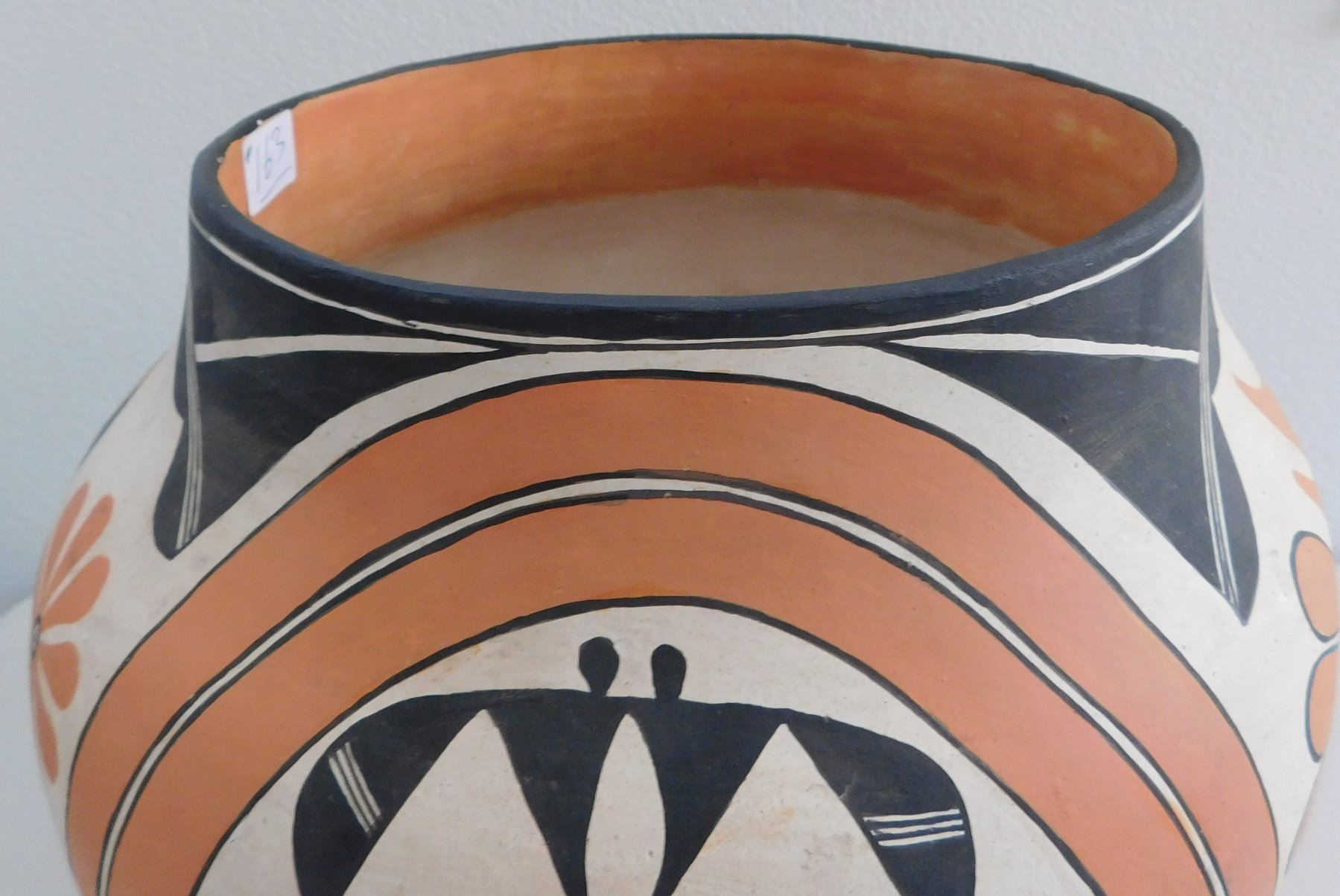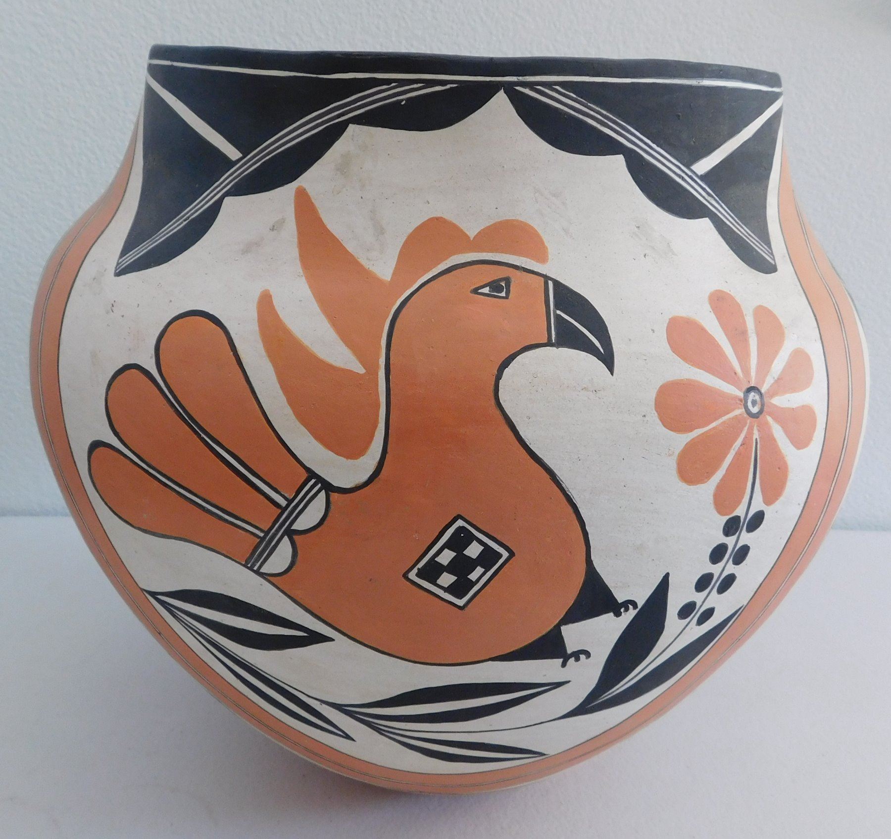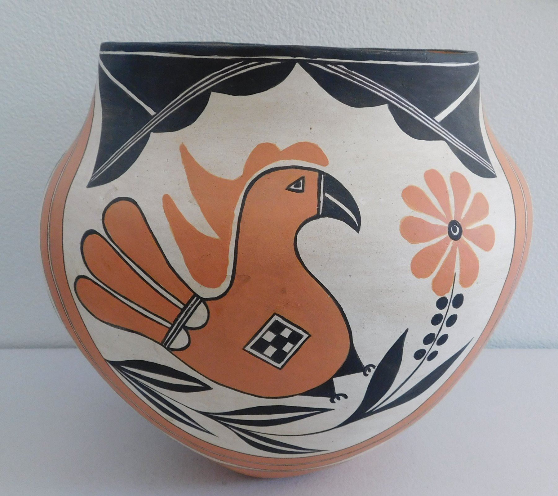 Large Acoma Pot, circa 1950s. Made of clay and paint, the item measures approx. 12" x 12" x 11". Acoma, New Mexico. Savah Garcia. Nice bird figures. Condition: Good, see images. Shipping: $60.00 USA estimate only, w/insurance and signature.
