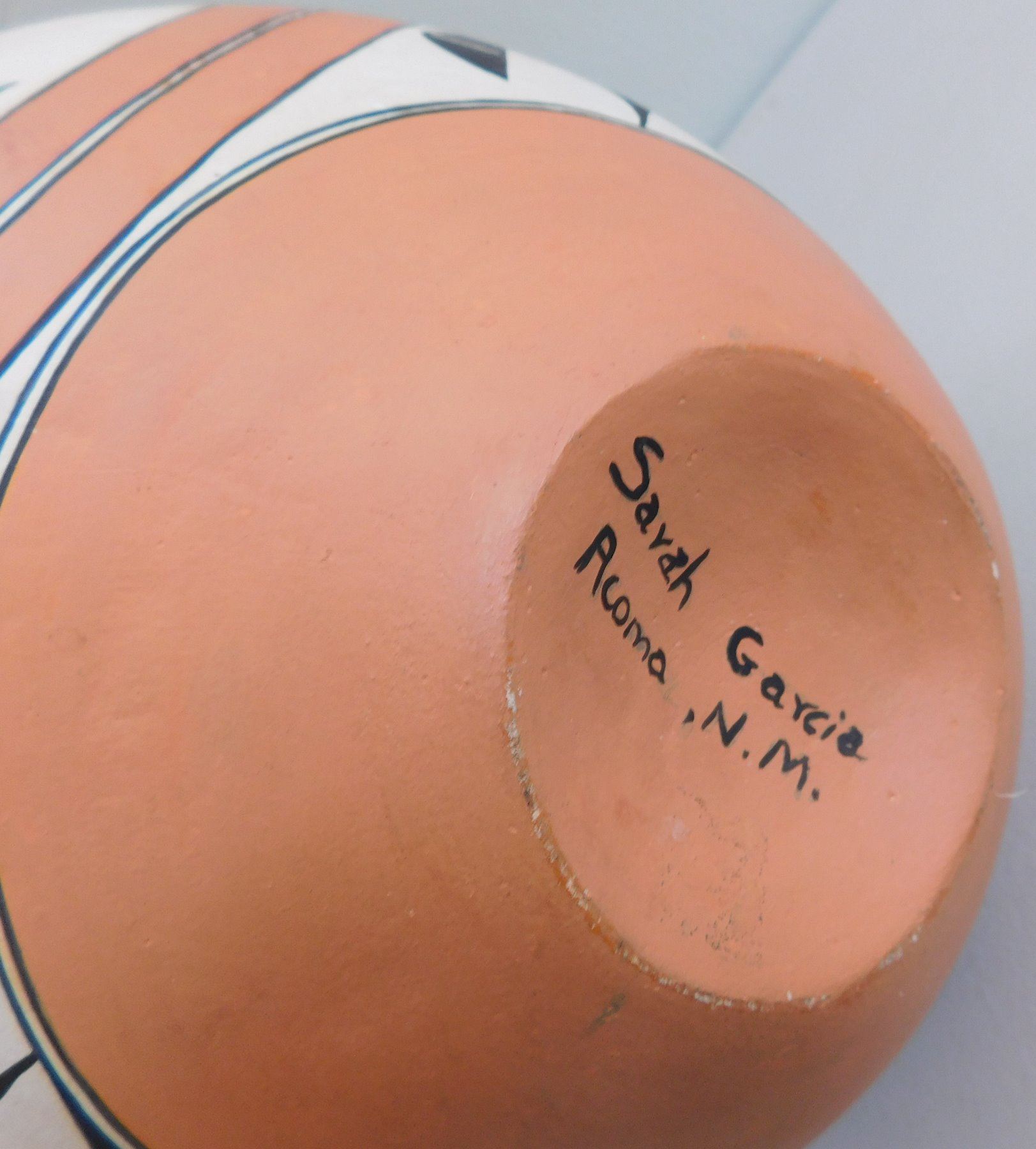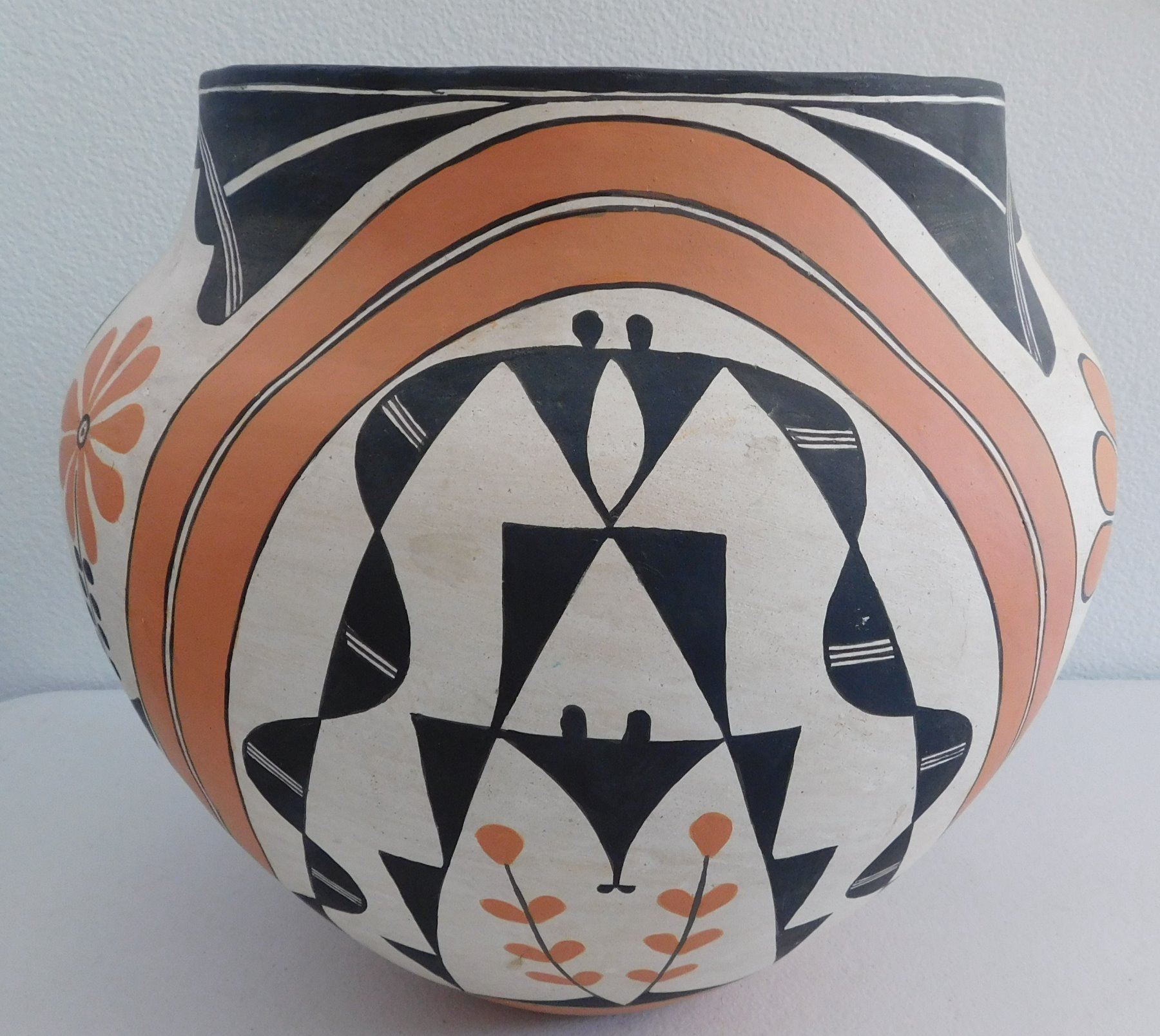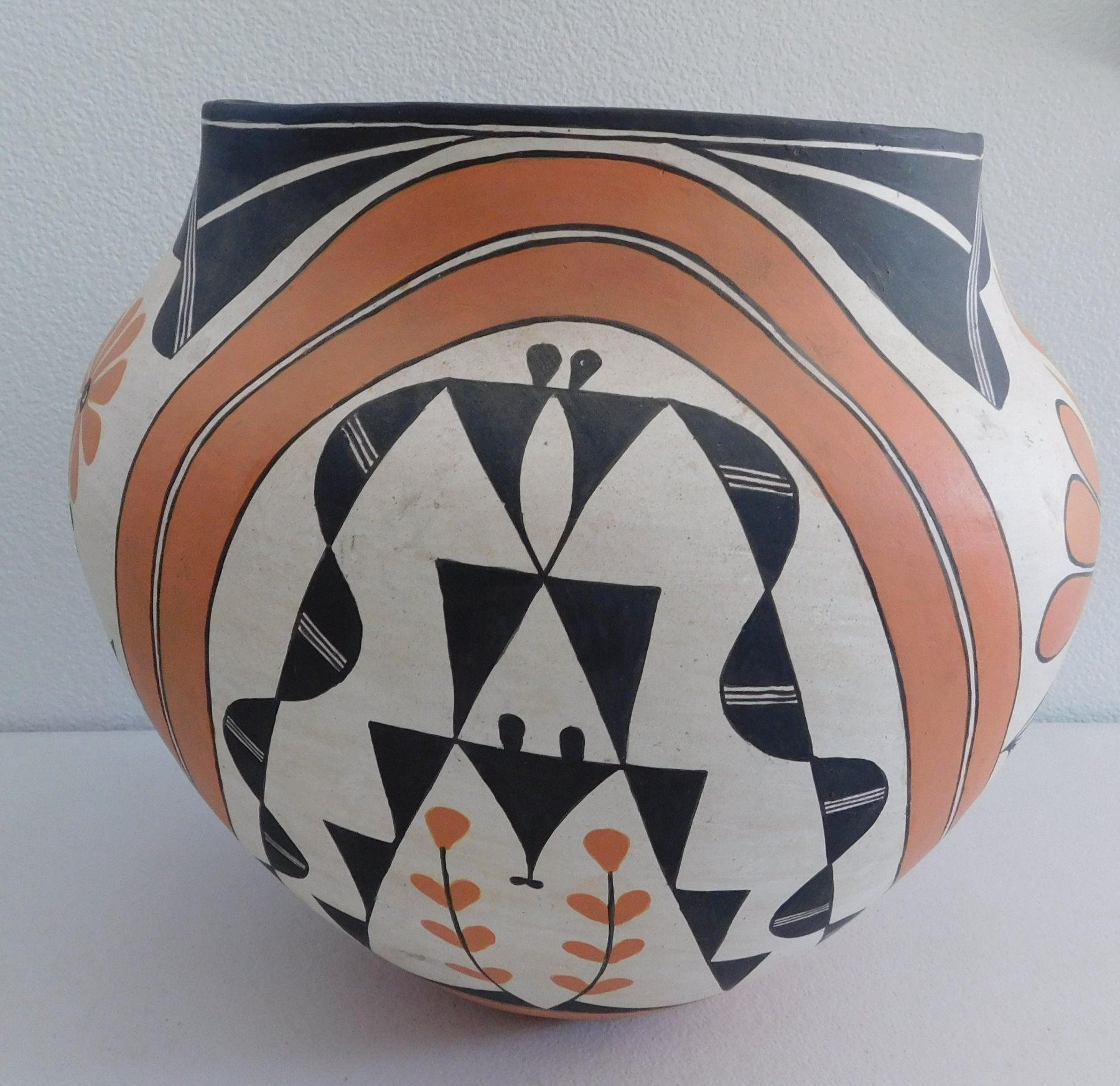 Large Acoma Pot, circa 1950s. Made of clay and paint, the item measures approx. 12" x 12" x 11". Acoma, New Mexico. Savah Garcia. Nice bird figures. Condition: Good, see images. Shipping: $60.00 USA estimate only, w/insurance and signature.