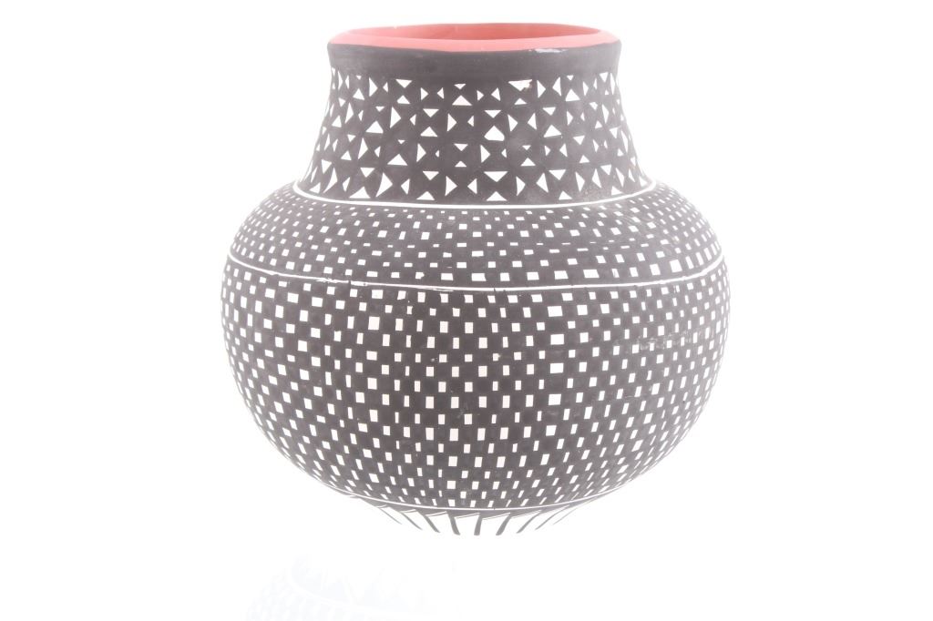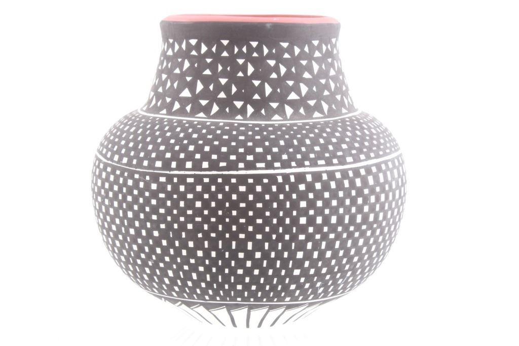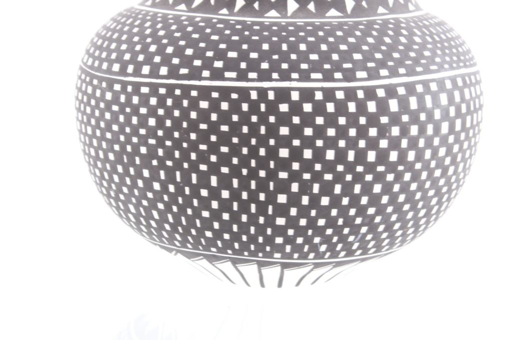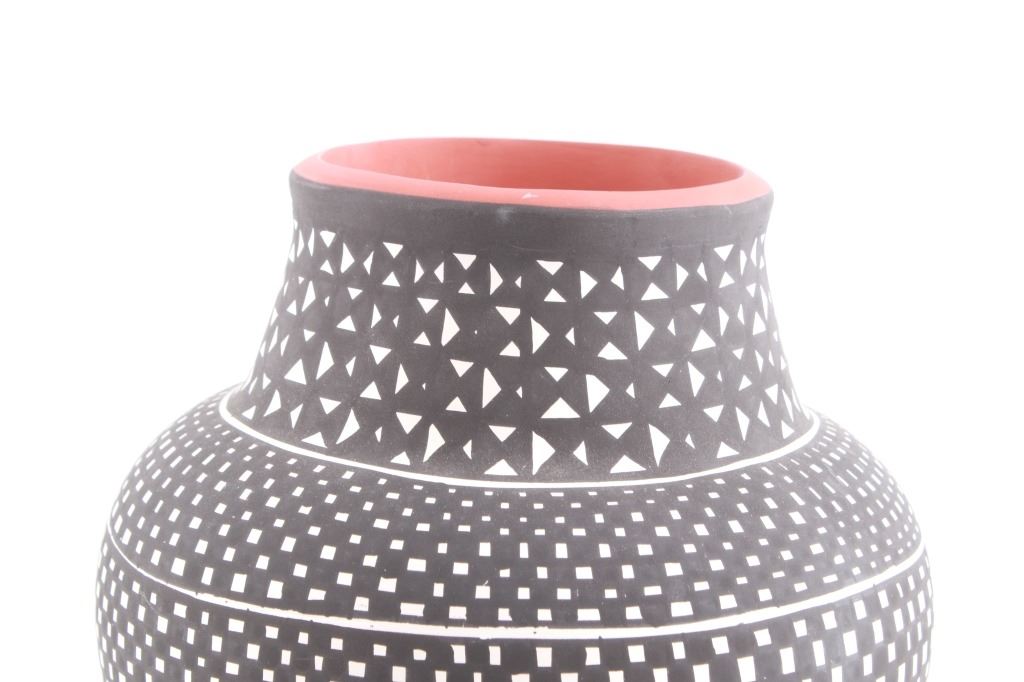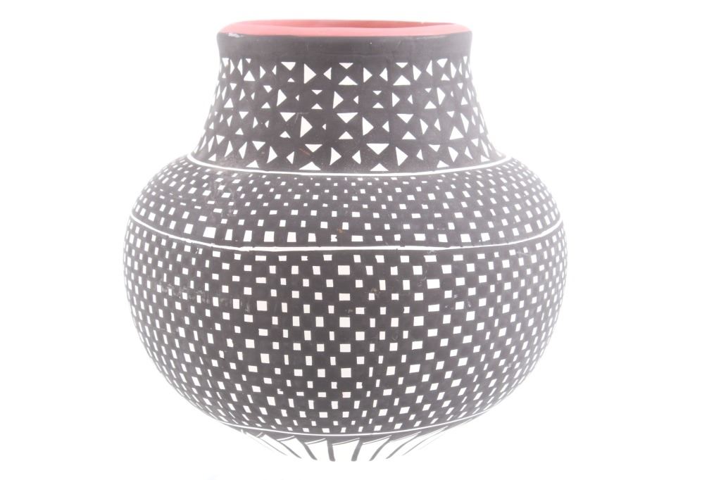 This is an outstanding and large piece of finely made and polychrome hand painted pottery by master artist Linda Concho of the Acoma Pueblo Native American Indians in New Mexico. This finely made piece consist of a large jar. Linda uses natural pigments and traditional Acoma designs when creating her pieces. The jar shows the amazing craftsmanship she is known for, making her work so highly collectable. The Acoma Pueblo is in New Mexico. Linda uses natural pigments and traditional Acoma designs and tools when creating her pieces. She uses Yucca leaves for a paint brush, the traditional way of painting Acoma pottery. This jar is quite striking in its size. The jar is made of the fine, slate-like clay the pueblo is famous for. The urn was hand painted with black geometric designs. Inside the mouth of the jar is painted red. Linda signed the bottom of this jar in her "crossword" style. The jar is 7 1/4" tall and 25 1/2" around.