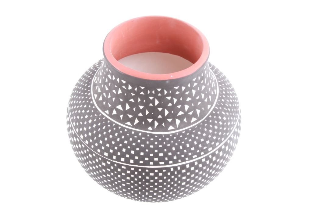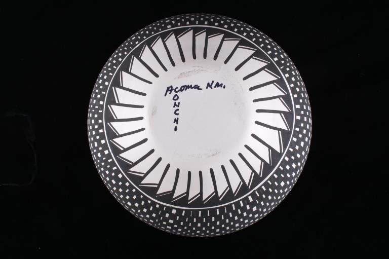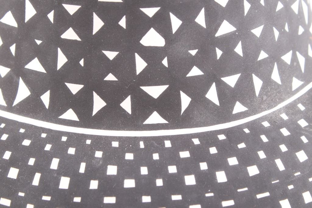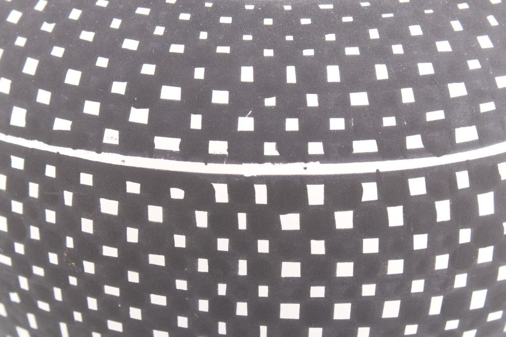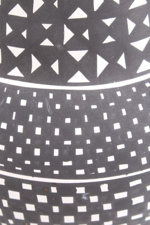 This is an outstanding and large piece of finely made and polychrome hand painted pottery by master artist Linda Concho of the Acoma Pueblo Native American Indians in New Mexico. This finely made piece consist of a large jar. Linda uses natural pigments and traditional Acoma designs when creating her pieces. The jar shows the amazing craftsmanship she is known for, making her work so highly collectable. The Acoma Pueblo is in New Mexico. Linda uses natural pigments and traditional Acoma designs and tools when creating her pieces. She uses Yucca leaves for a paint brush, the traditional way of painting Acoma pottery. This jar is quite striking in its size. The jar is made of the fine, slate-like clay the pueblo is famous for. The urn was hand painted with black geometric designs. Inside the mouth of the jar is painted red. Linda signed the bottom of this jar in her "crossword" style. The jar is 7 1/4" tall and 25 1/2" around.