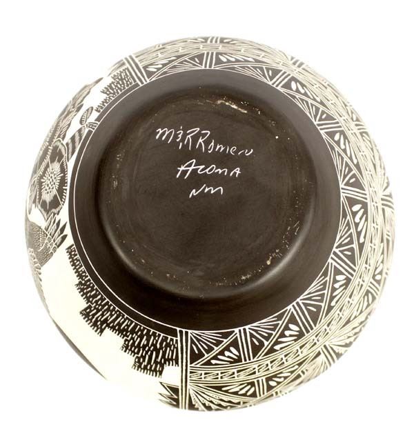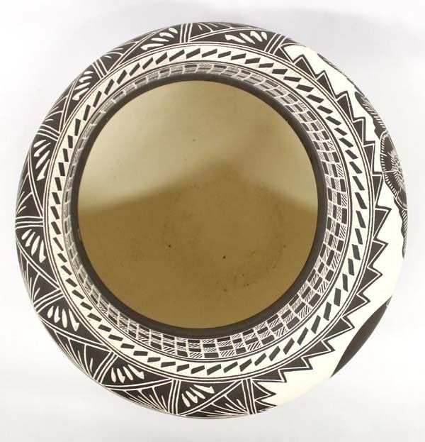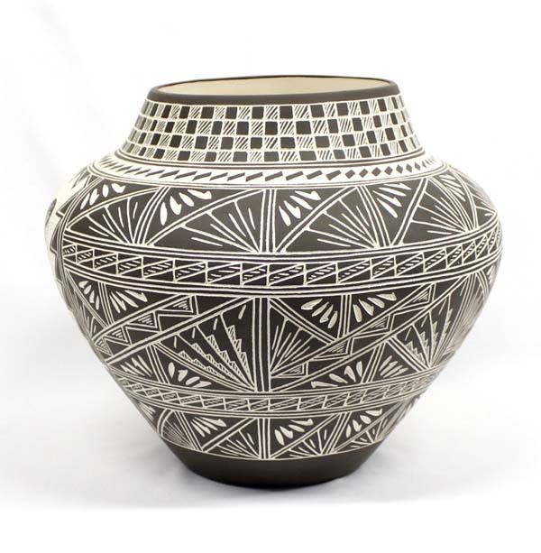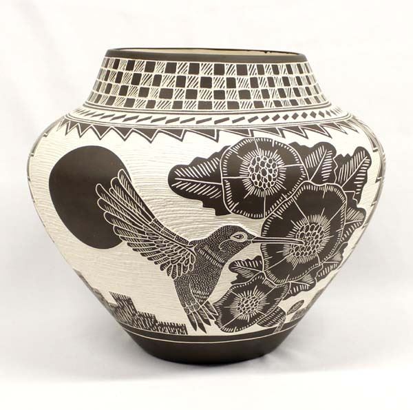 Large Native American Acoma Sgraffito Olla by Michael and Robin Romero, measures 14.5''D x 12.5''H, signed by artists, beautifully rendered pottery jar with white slip featuring flowers with hummingbird, stylized feathers, checkerboard, and geometric lines and designs, exquisite workmanship in this piece, truly a gorgeous piece of art