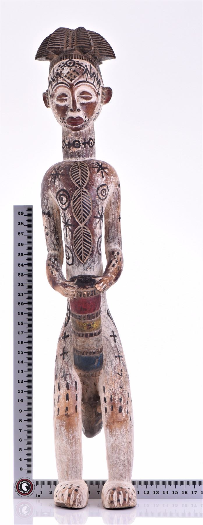 Large African Igbo Wood Power Figure, Nigeria. Carved From One Piece of Solid Wood. Estimated more than 50 yrs. old. African art is a term typically used for the art of Sub-Saharan Africa. A few of the most popular traditional African art was produced by the tribal people of the Fang, Dan, Baoule, Dogon, Senufo, Makonde, Bambara, and San. Most African sculpture was historically in wood and other natural materials that have not survived from earlier than a few centuries ago; older pottery figures can be found from a number of areas. Masks are important elements in the art of many peoples, along with human figures, often highly stylized and in vast variety of styles. Sculpture is most common among "groups of settled cultivators in the areas drained by the Niger and Congo rivers. Direct images of deities are relatively infrequent, but masks in particular were made for religious ceremonies. Later West African cultures developed bronze casting for reliefs, like the Benin Bronzes, to decorate palaces and for highly naturalistic royal heads from around the Yoruba town of Ife, in terracotta as well as metal, from the 12th to 14th centuries. Akan gold weights are a form of small metal sculptures produced over the period 1400–1900; some apparently represent proverbs, contributing a narrative element rare in African sculpture; and royal regalia included impressive gold sculptured elements. Many West African figures are used in religious rituals and are often coated with materials placed on them for ceremonial offerings. Eastern Africans, in many areas shorter of large timber to carve, are known for Tinga Tinga paintings and Makonde sculptures. There is also tradition of producing textile art. Modern Zimbabwean sculptors in soapstone have achieved considerable international success. Southern Africa's oldest known clay figures date from 400 to 600 AD and have cylindrical heads with a mixture of human and animal features. (Wikipedia) Size and/or Weight: See Measurement Photo. (Photos Represent The Lot Condition, Pangaea Auctions)
