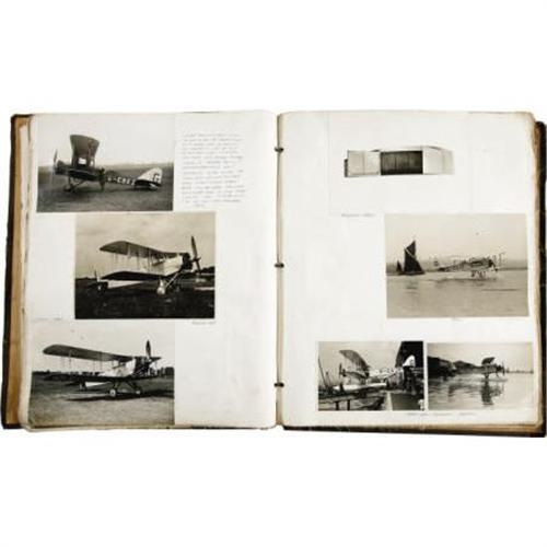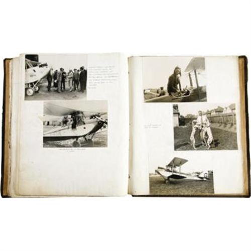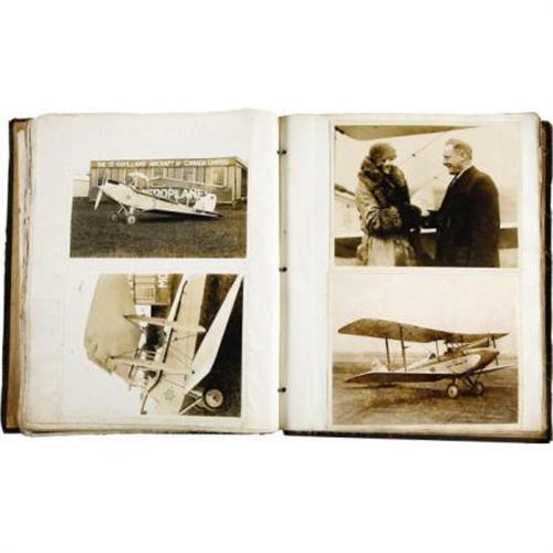 <B>Large Photograph Album Devoted to the de Havilland Moth Aircraft.</B></I> The album measures 14" x 17" and contains original photographs of various early models of the de Havilland Moth and many of the aviators who made their reputations in the Moth. The photos include: Captain Sir Geoffrey and Lady de Havilland, Sir Samuel Hoare, Vicomtess de Sibour, Lady Mary Westenra Bailey, Miss W. E. Spooner, Lady Heath, Amelia Earhart, Air Marshal W. Safton Brancker, Captain W. L. Hope, and others. Besides the variations of the Moth, there are also photos of the D.H.61 with folding wing, D.H.65 Hound with a Napier Lion - Series XI engine, D.H. Hercules Air Liner, and other aircraft. There are close up photos of engines, landing gear, and de Havilland production facilities in Britain, Canada and, Lowell, Massachusetts. A very fine early de Havilland archive of approximately 150 photos. Various sizes.<BR><BR><b>Shipping:</b> Books & Catalogs (<a target="_blank" href="http://www.heritageauctions.com/common/shipping.php">view shipping information</a>)