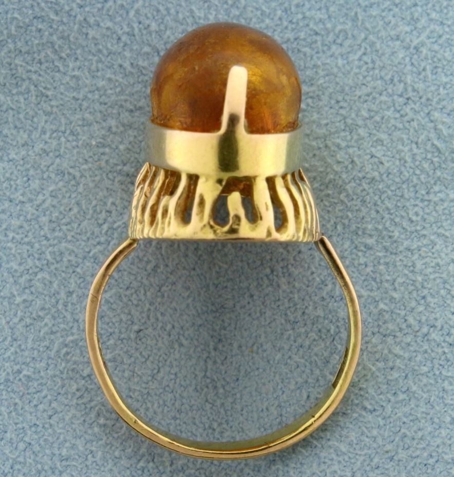 In 14k yellow gold, containing a 24x10mm Amber gemstone in a very unique setting. Size 6 1/2. 6.0g.