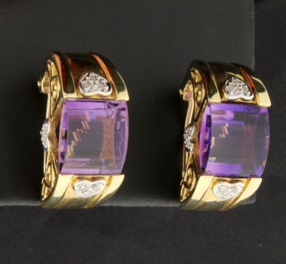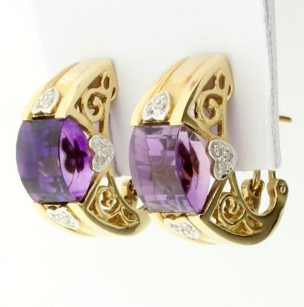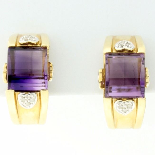 In 10K yellow & white gold, they are 3/4 inch long and have safety backs. Each earring contains a 10x8.5mm amethyst and twelve 1/2pt diamonds. 9.9g