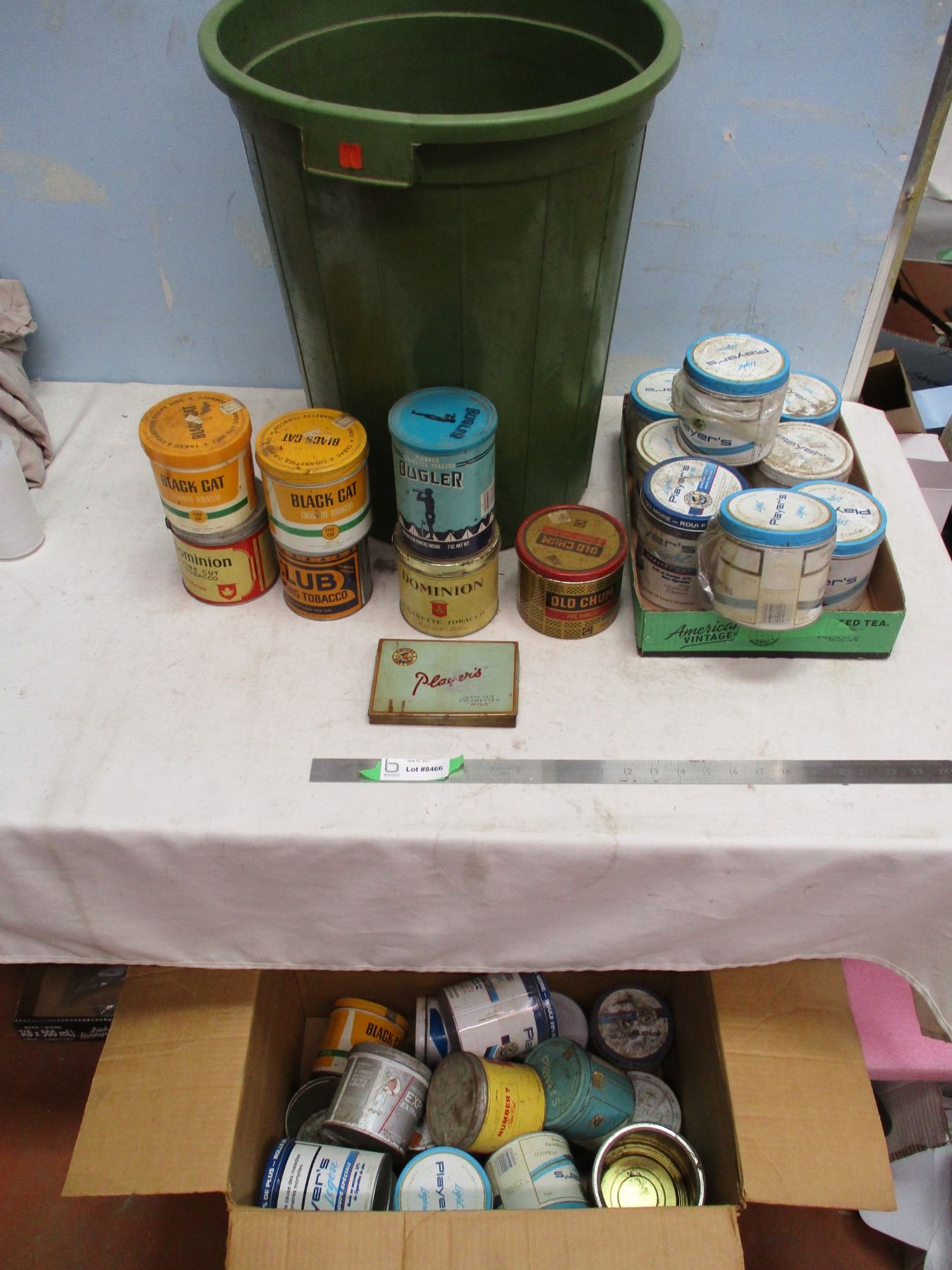 Large Amount of Round Tobacco Tins and Plastic Garbage Can