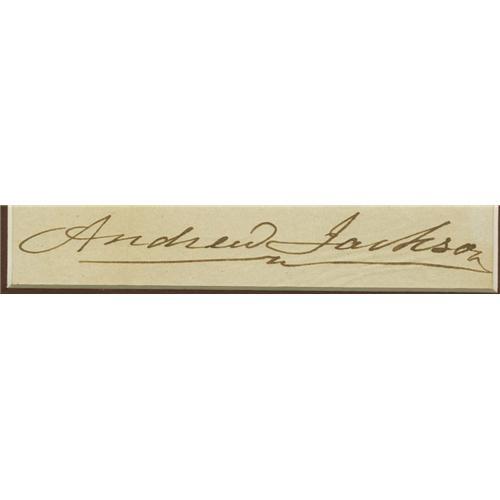 <B>Andrew Jackson Signature,</B></I> 5.25" x 1", likely clipped from a larger document. Huge and impressive. Professionally matted beneath an engraving of General Jackson. Excellent condition.<BR><BR><b>Shipping:</b> Flat Material, Small (<a target="_blank" href="http://www.heritageauctions.com/common/shipping.php">view shipping information</a>) <BR><BR><B>Important notice:</