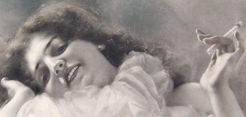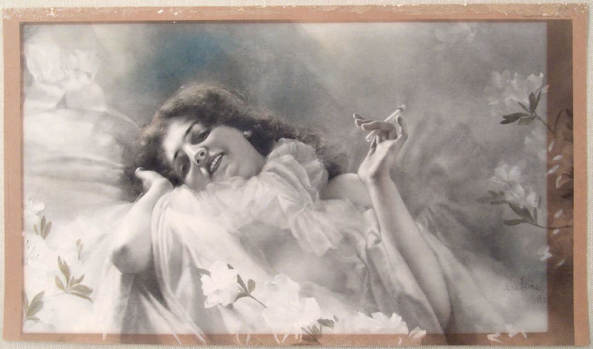This is an antique 1900 print, hand-colored and signed/dated by the artist, depicting a fashionable & sassy Victorian girl holding a cigarette. An unusual image for the era - especially in this size. SIZE: Approx. 22" x 13".