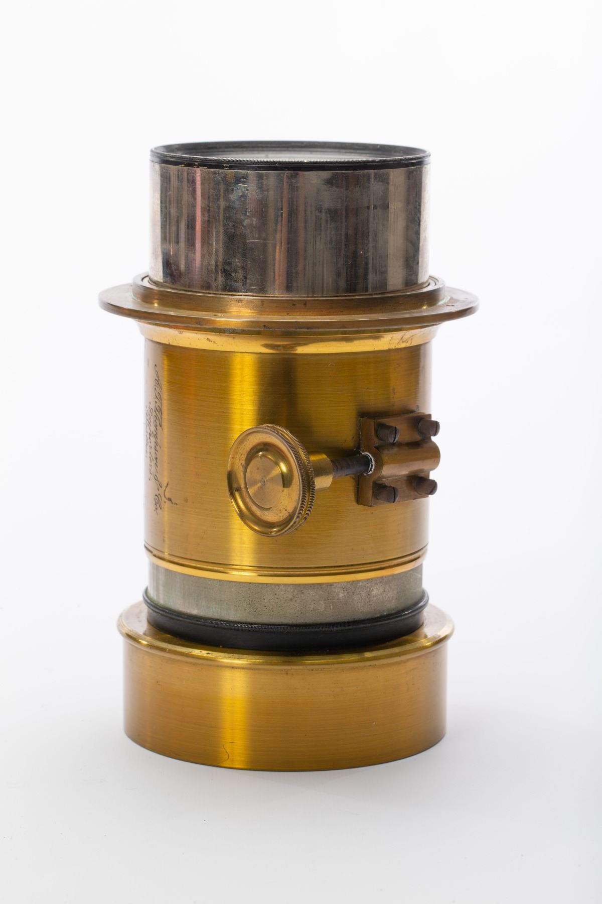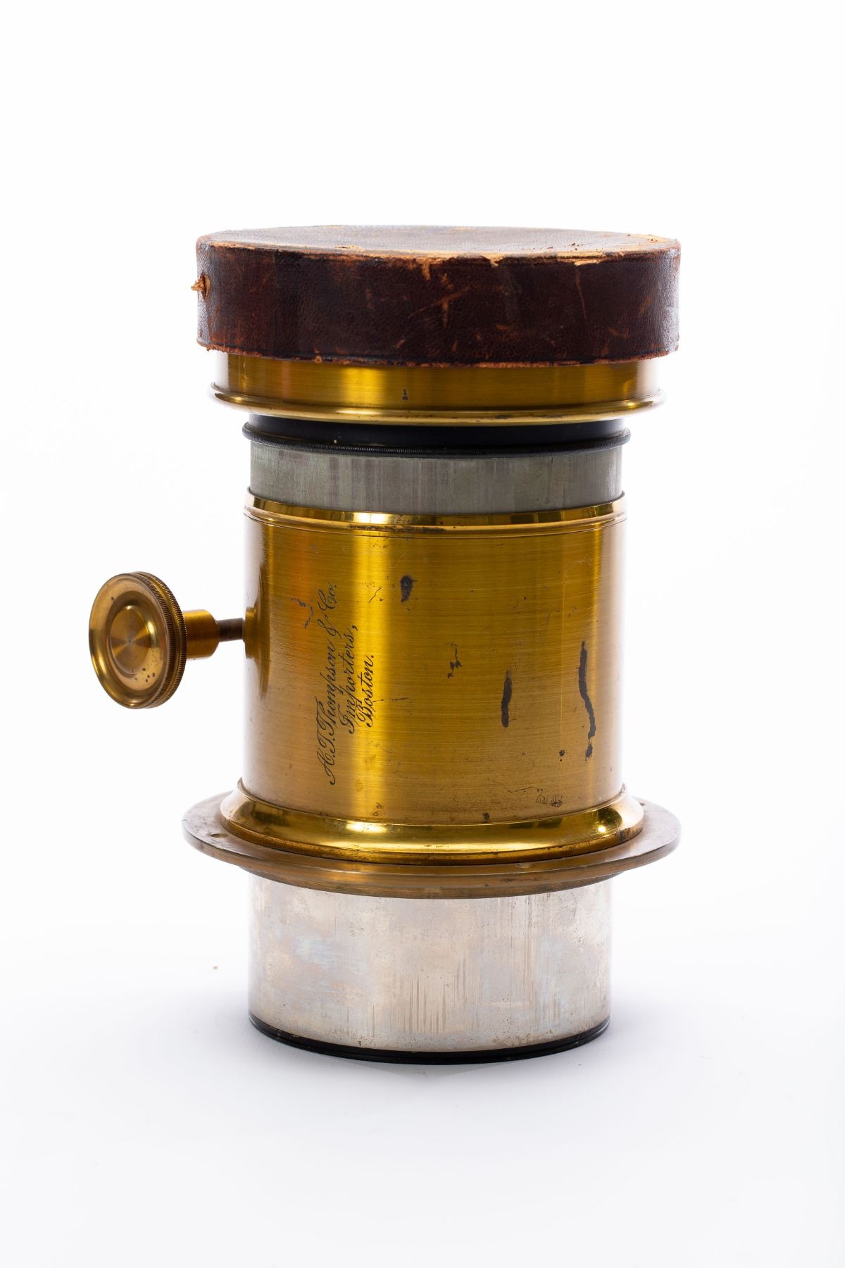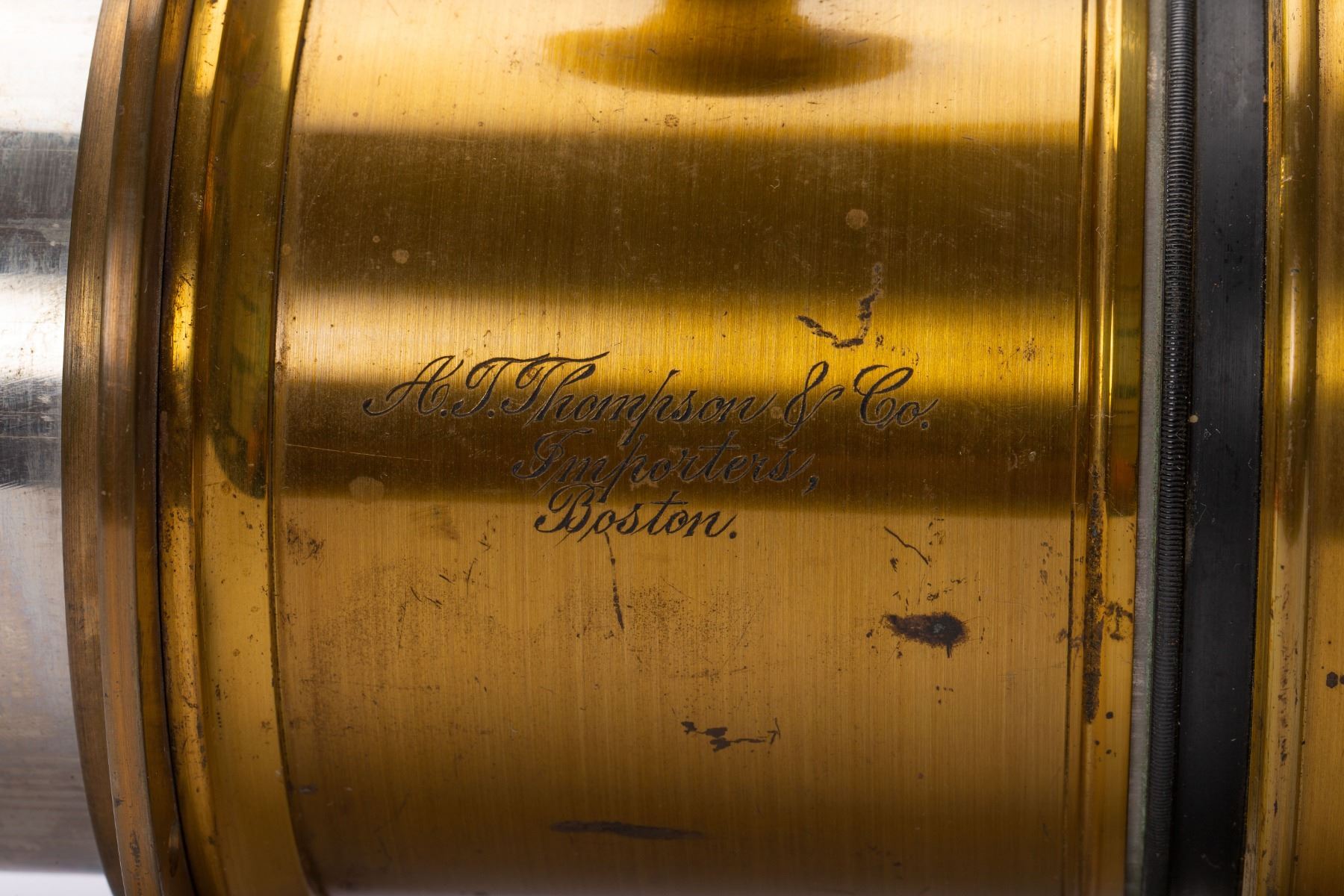 Large antique brass Petzval lens by A. T. Thompson & Co., measuring 8? long and 4.5? in diameter, engraved on the side, "A. T. Thompson & Co., Importers, Boston." Includes a period lens cap. In fine condition, with some small flecks and spots to the glass. A robust optical piece.