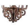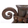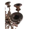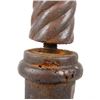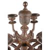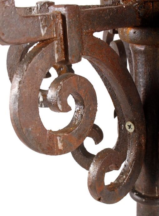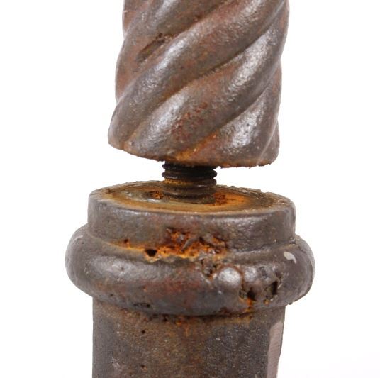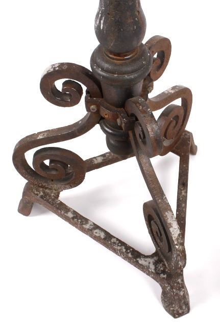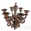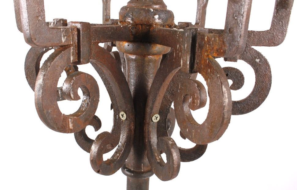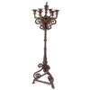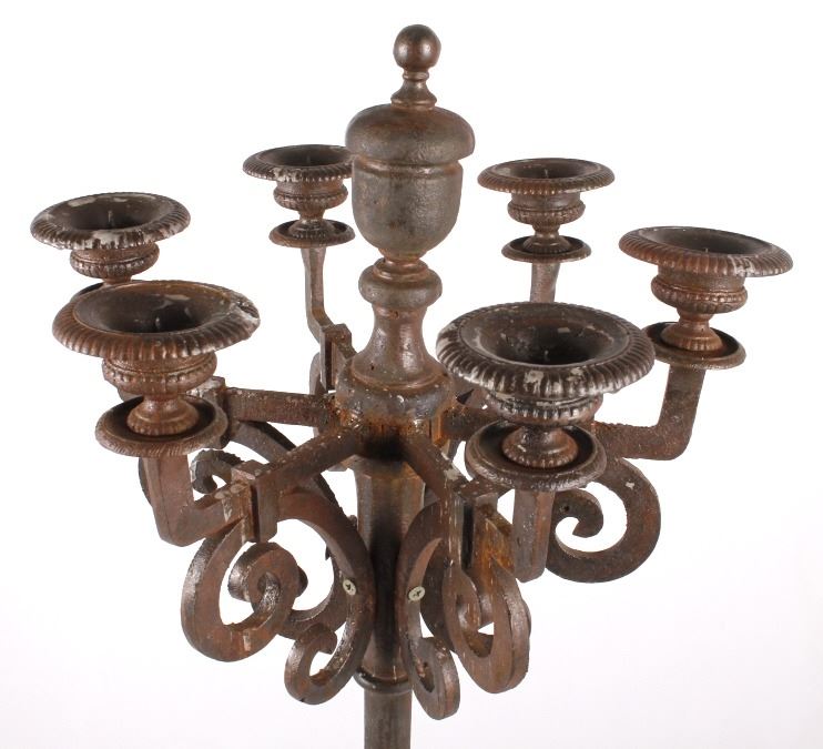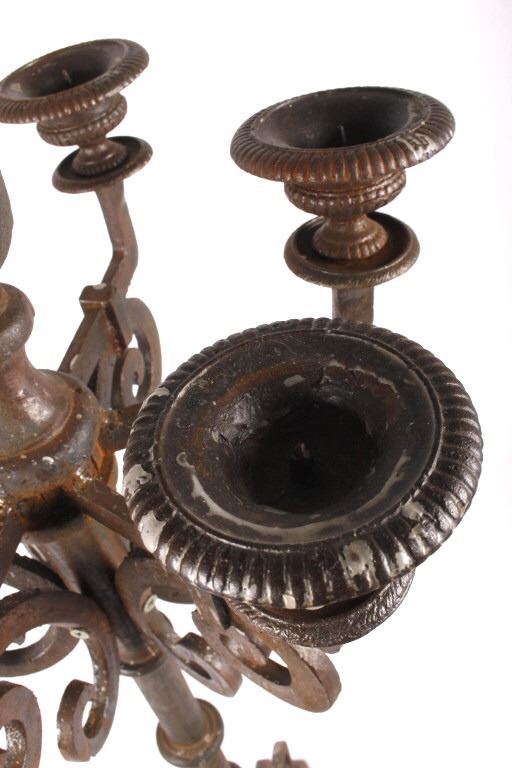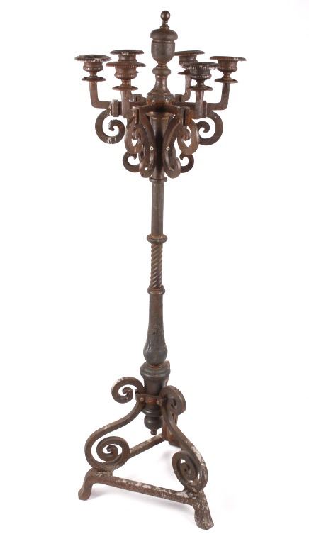 Offered for bidding in this lot is an antique cast iron candelabrum. The fine candelabrum shows two piece construction, tapped and threaded in the middle - at the bottom of the spiral portion of the stand. At the top of the candelabrum, there is a decorative central finial, flanked by six ornate cast candle holders. Each candle holder utilizes a central spike to securely hold your candles. The candelabrum stands steadfast on a three point base, each leg showing gorgeous spiral accents. The piece measures 57 1/4" tall, and 17" wide and deep.