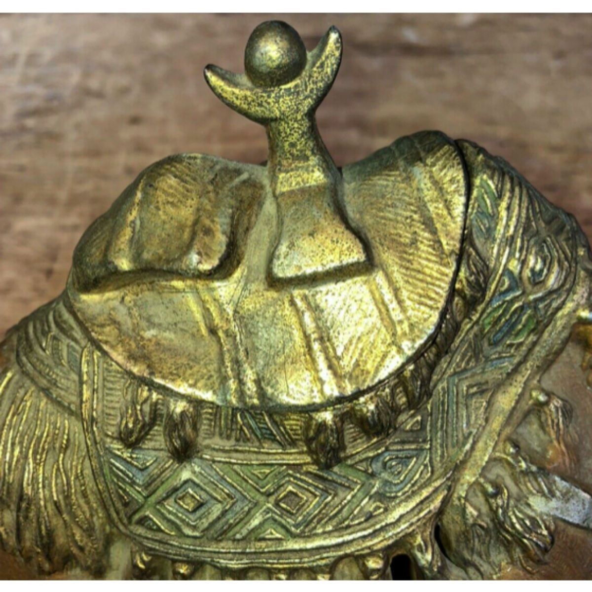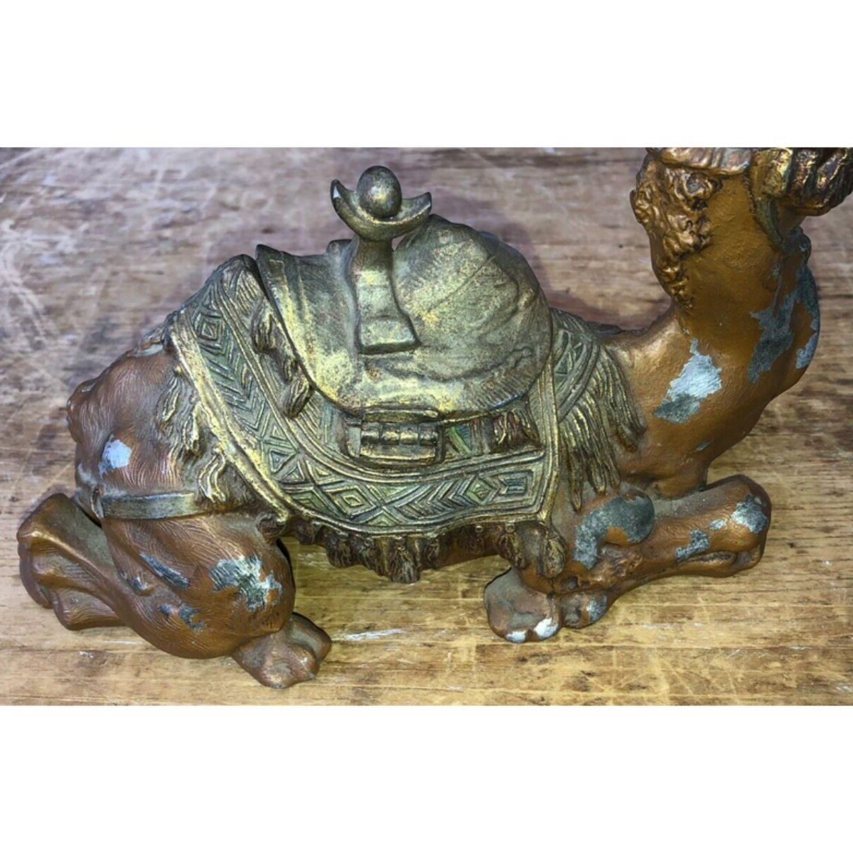 Cold painted cast metal inkwell, in the form of a camel. The hump of the camel lifts to reveal a glass metal inset for holding ink or could be used to store trinkets. Â 9" L X 6" H.