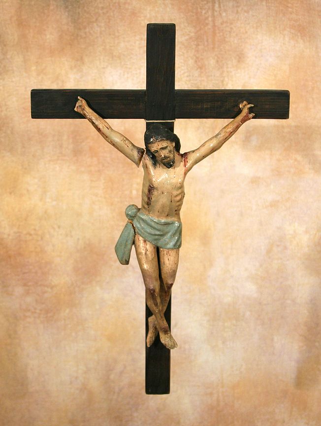 Large Antique Crucifix. 28" x 18" beautifully carved & painted Jesus on the cross. 19th century. (est. $800-1,200). Provenance: The Ralph & Rowena Meyers Collection. CONDITION REPORTS: www.auctioninsantafe.com/docs/cr2012.pdf
