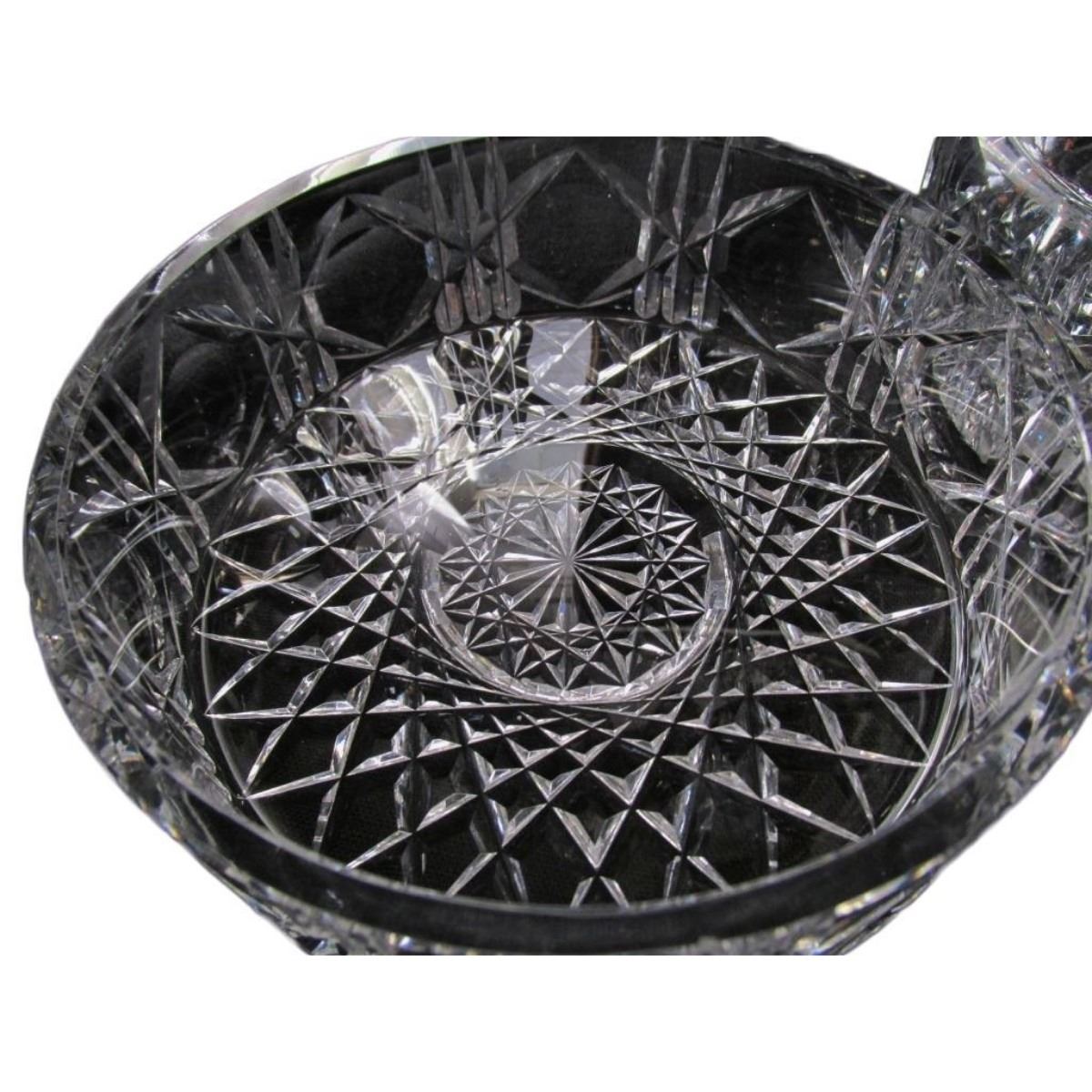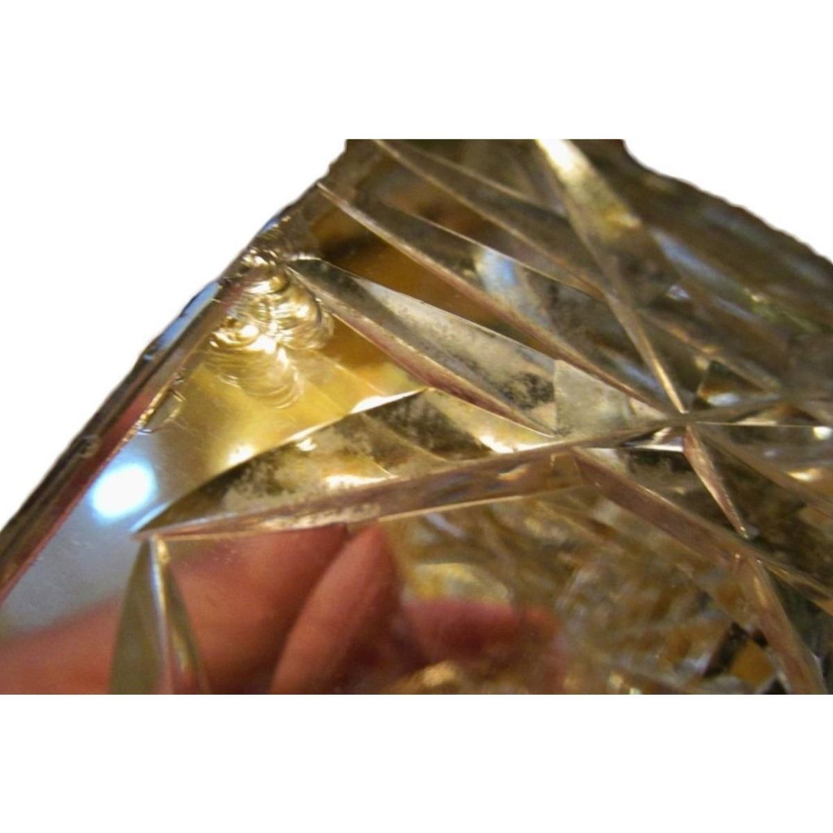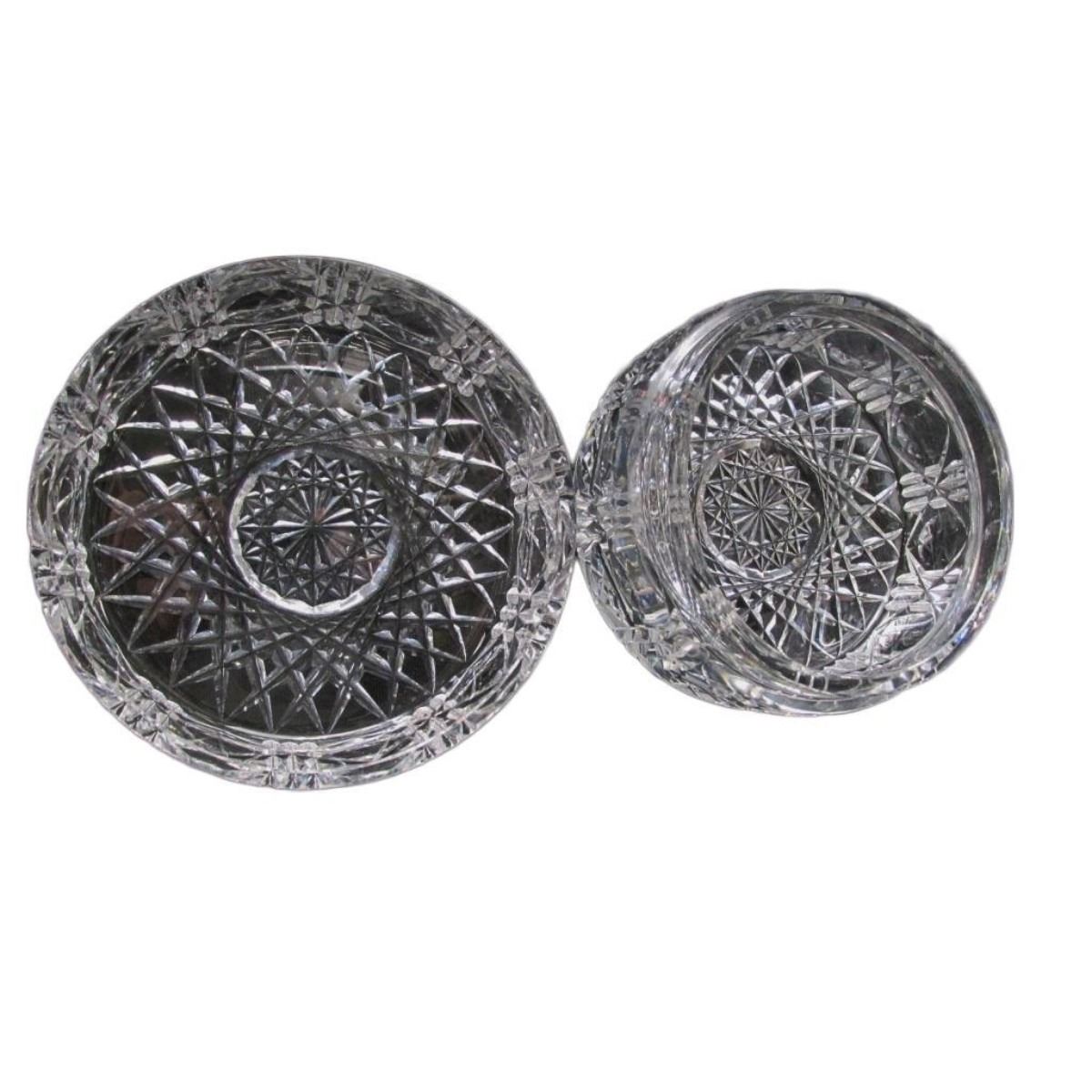 Large & gorgeous cut glass dresser box. Small shell shaped chip to edge of top that is hard to detect, otherwise terrific condition. 5" D X 3" H.