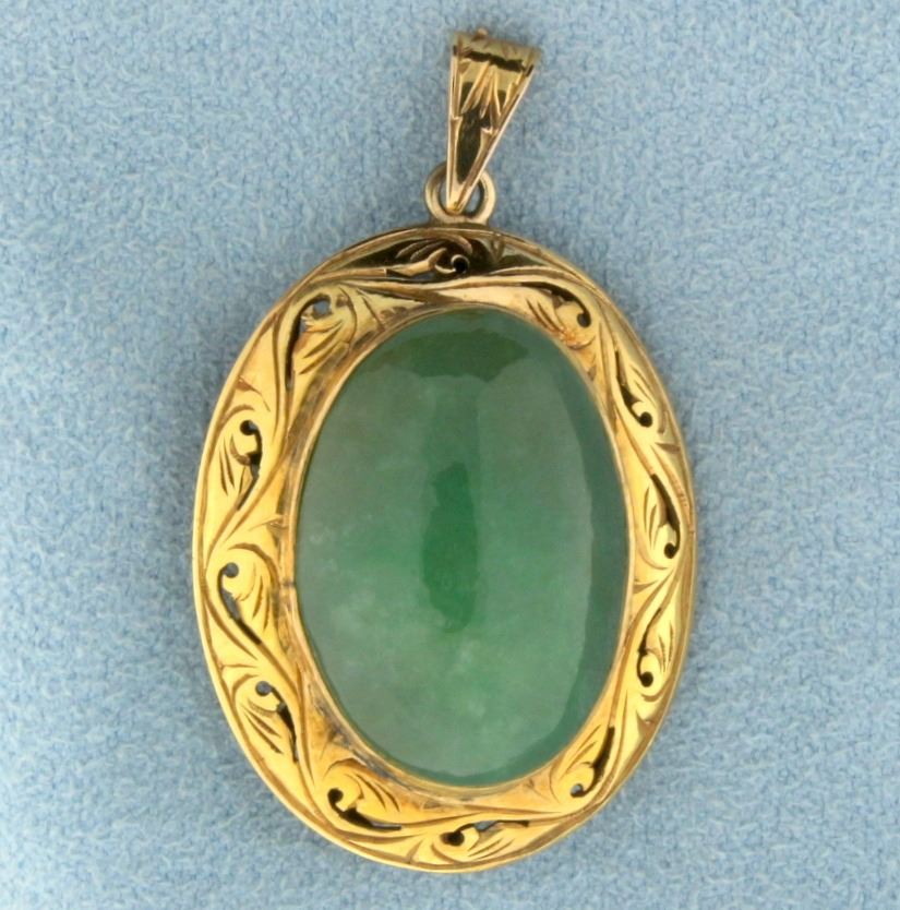 In 14k yellow gold. With fantastic detail on the pendant and an excellent quality 20x14mm jade gemstone with excellent green color. 1 3/8 inches long with bale. 7.6g.