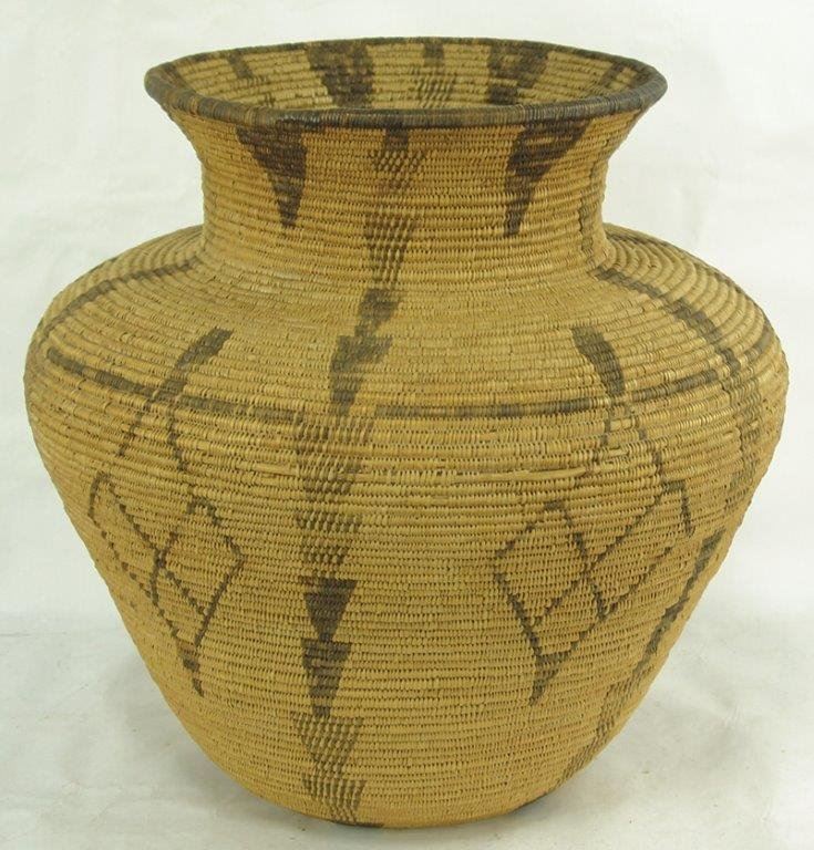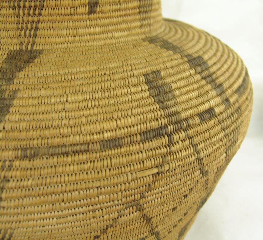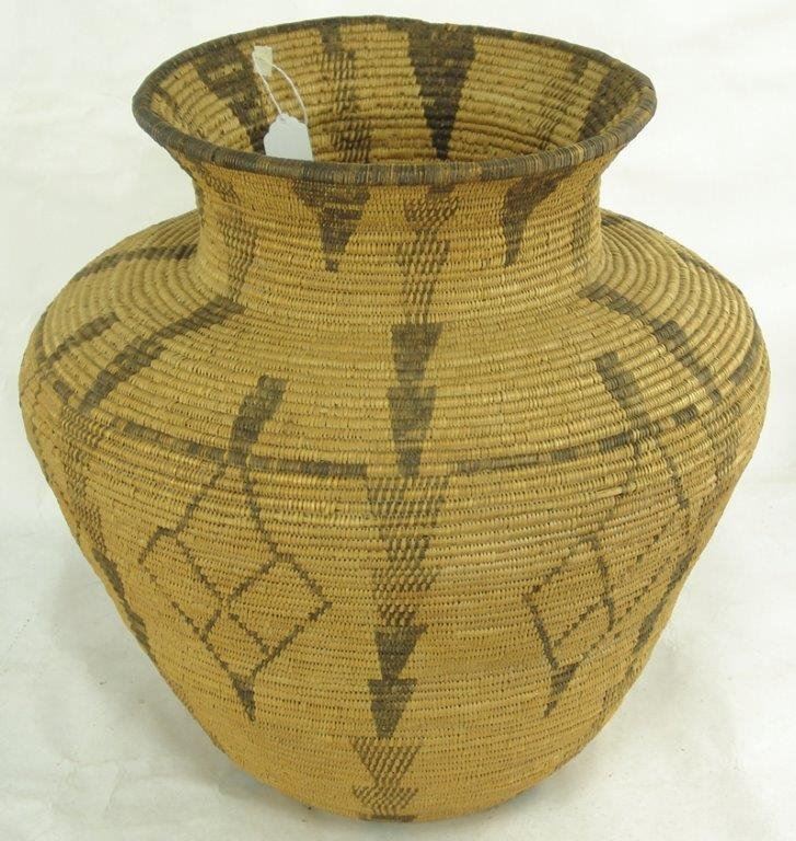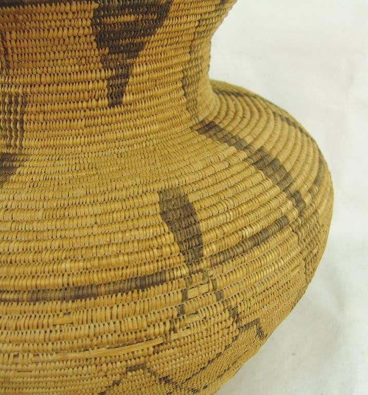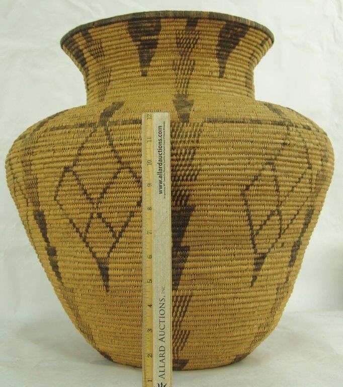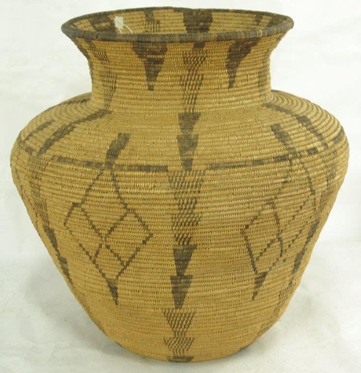 Ca.1930s-1940s, Large and impressive wider-bodied woven basketry olla with repeating diamond blocks and vertical rows of solid and checkered down-pointing arrows. Very good condition, minor stitch loss around shoulder. Visually stunning. 18" x 18"