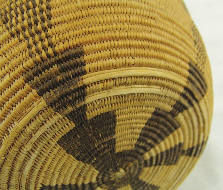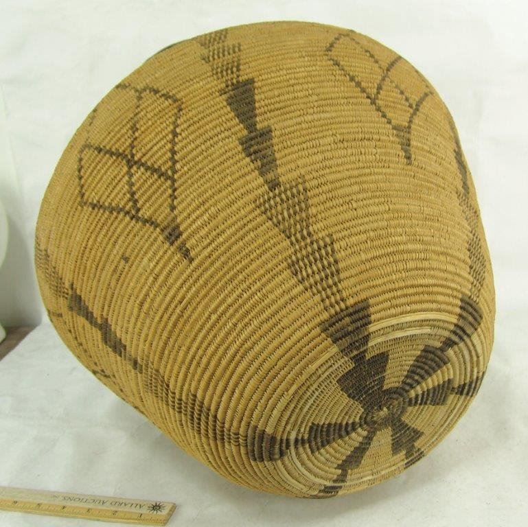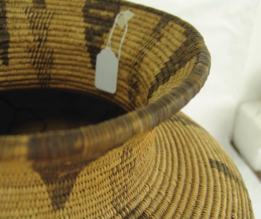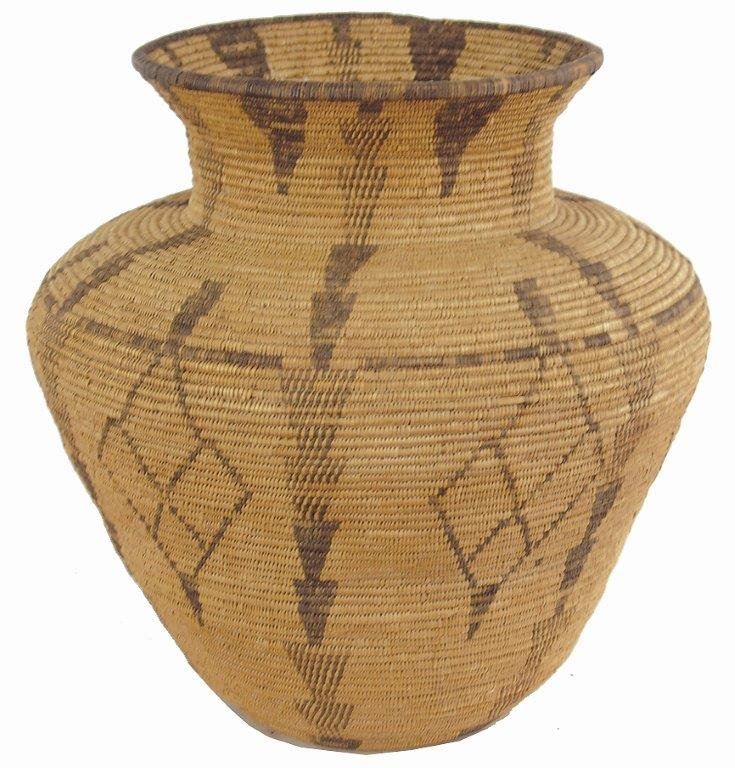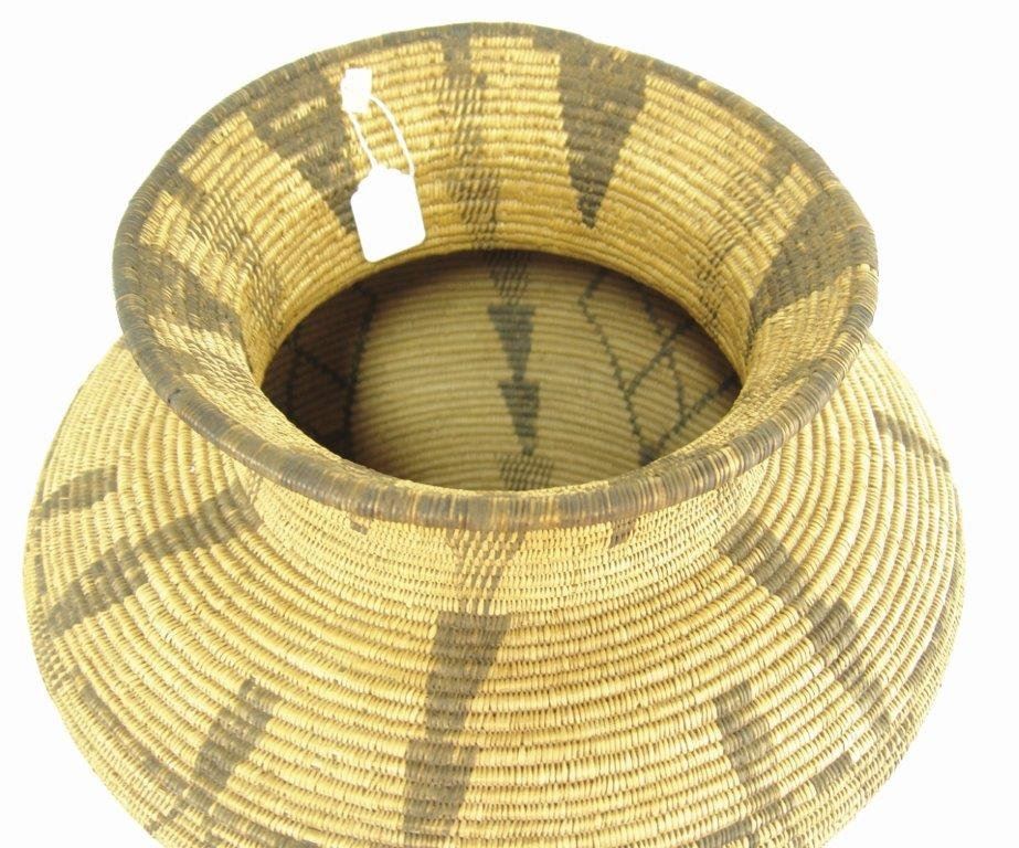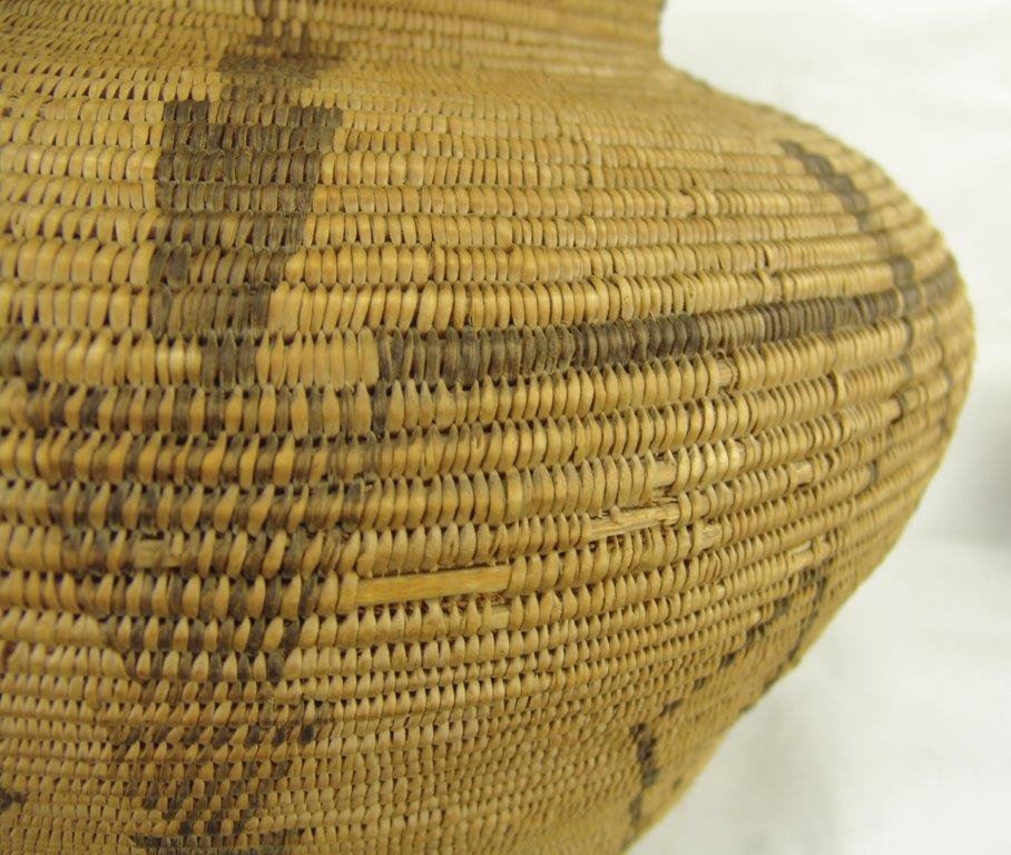 Ca.1930s-1940s, Large and impressive wider-bodied woven basketry olla with repeating diamond blocks and vertical rows of solid and checkered down-pointing arrows. Very good condition, minor stitch loss around shoulder. Visually stunning. 18" x 18"