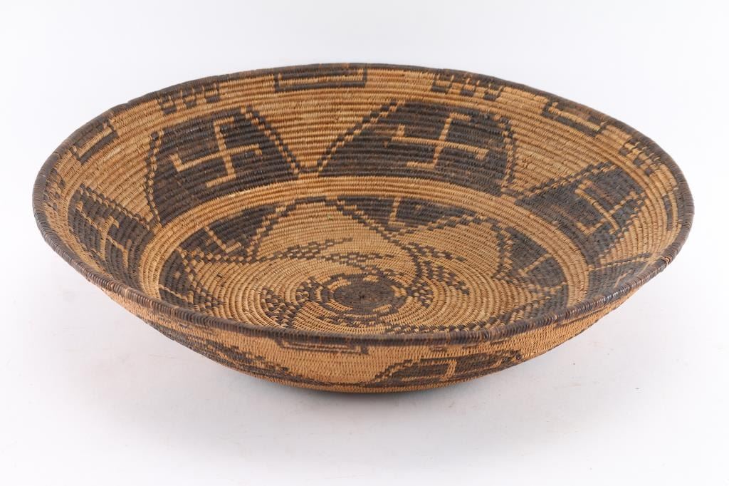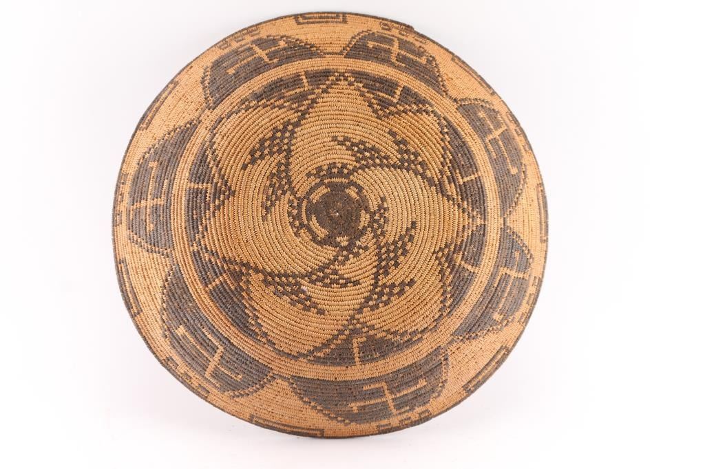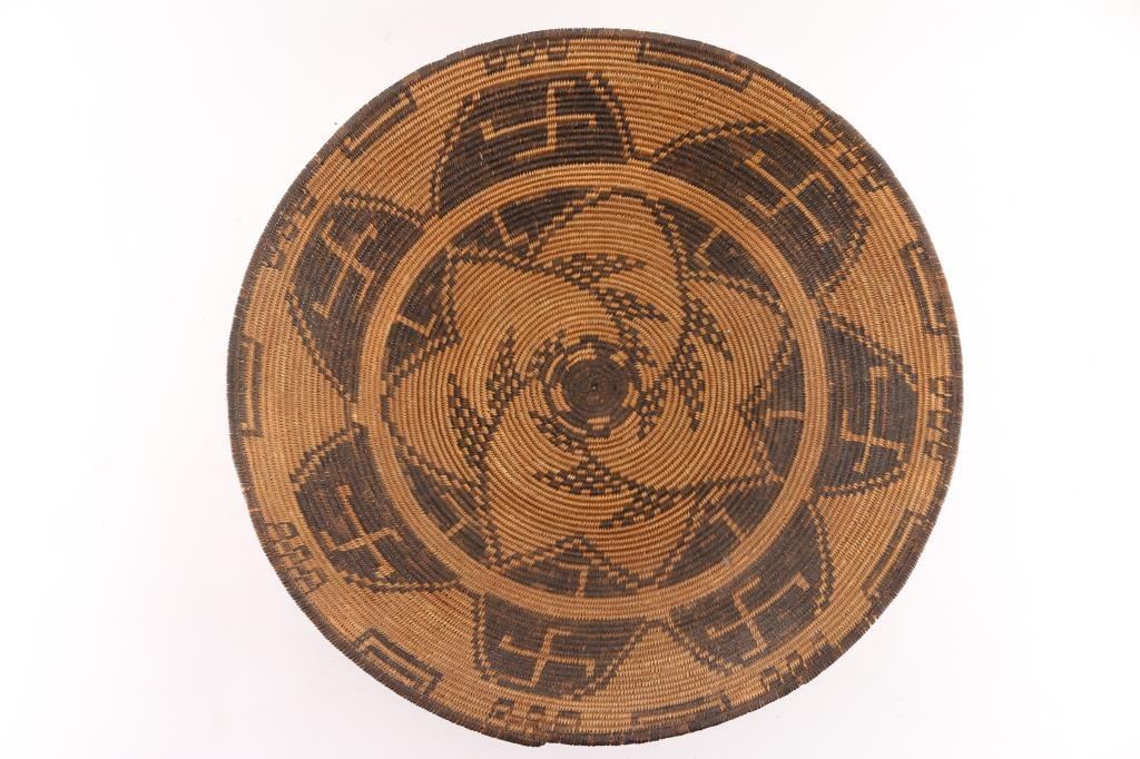 With rolling good luck symbols inside of star pattern, measures 18" diameter, 3 1/2" tall. In overall good condition. Scattered, very miniscule age losses. From the Steve Goldstein Collection, Scottsdale, AZ.