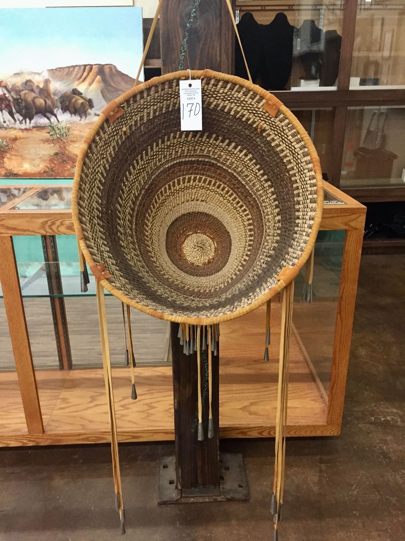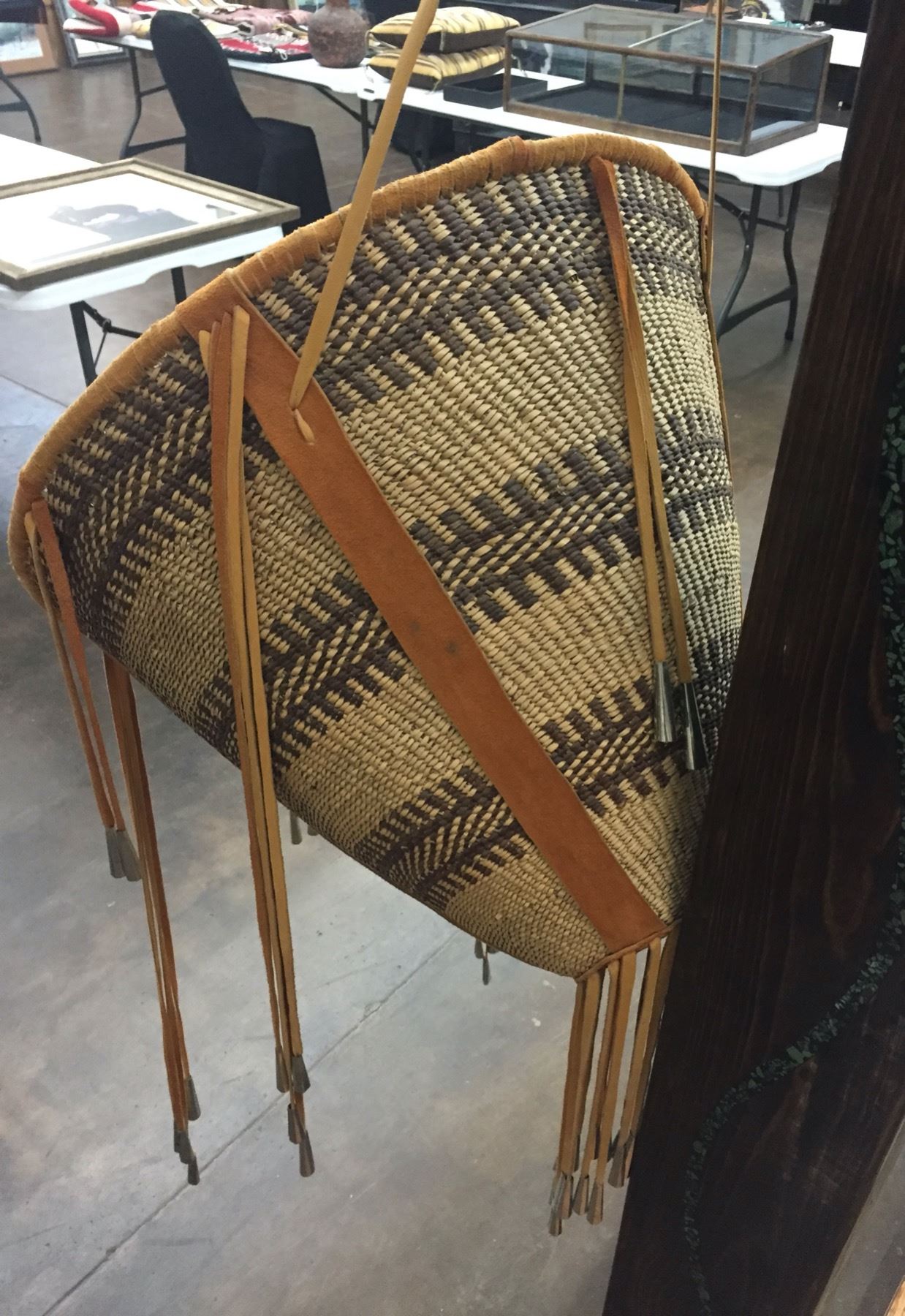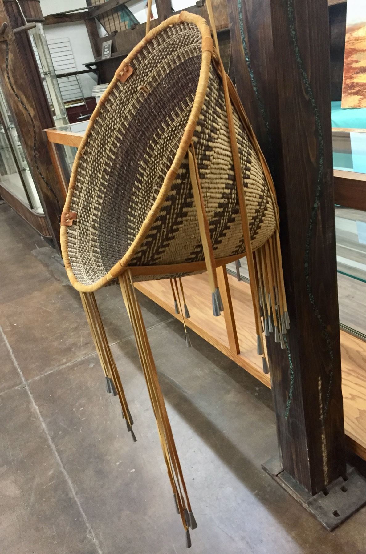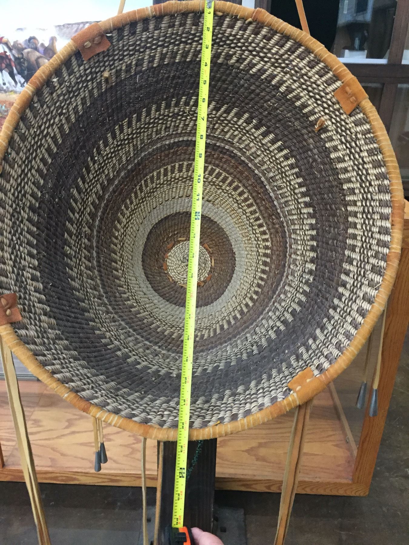 Description: For sale in this lot we have a large Apache burden basket. It is a well made basket with banded geometric designs and jingle cones on leather fringes. Maker: Unknown Apache weaver. Approx. Age: Vintage. Size: 20-1/2 inches wide x 18 inches deep. Condition: Good for its age, normal wear expected. Please look closely at the pictures - they are an important part of our description. Shipping: There will be a $10 handling, packaging fee for shipping this lot. The actual cost of postage will be added on top of that.