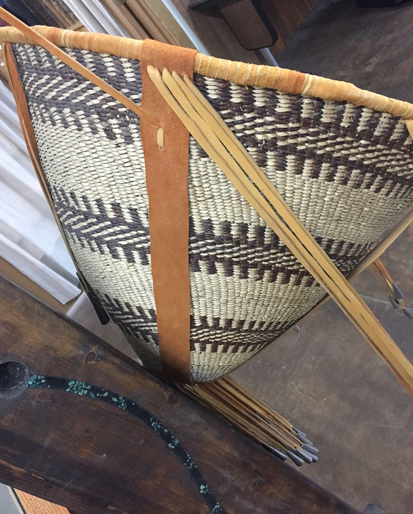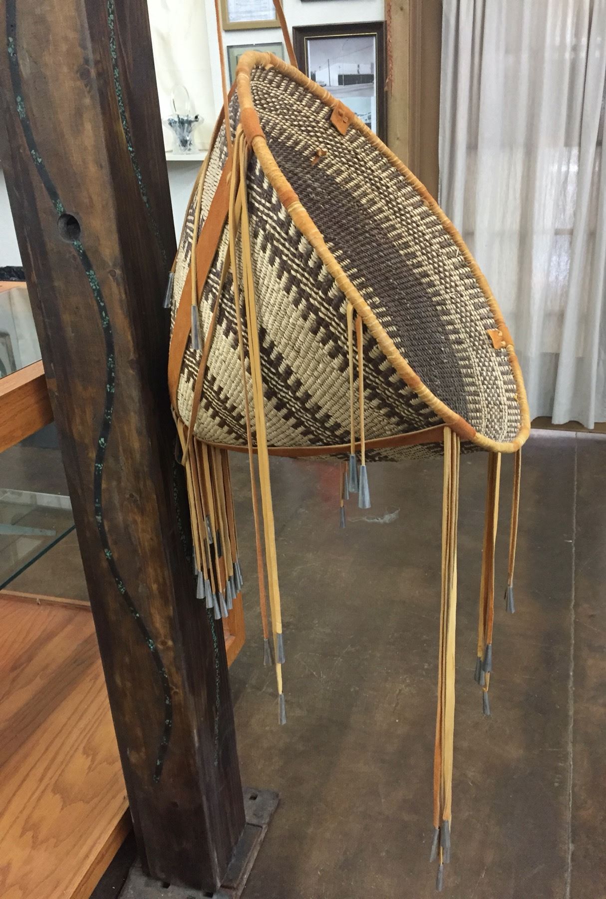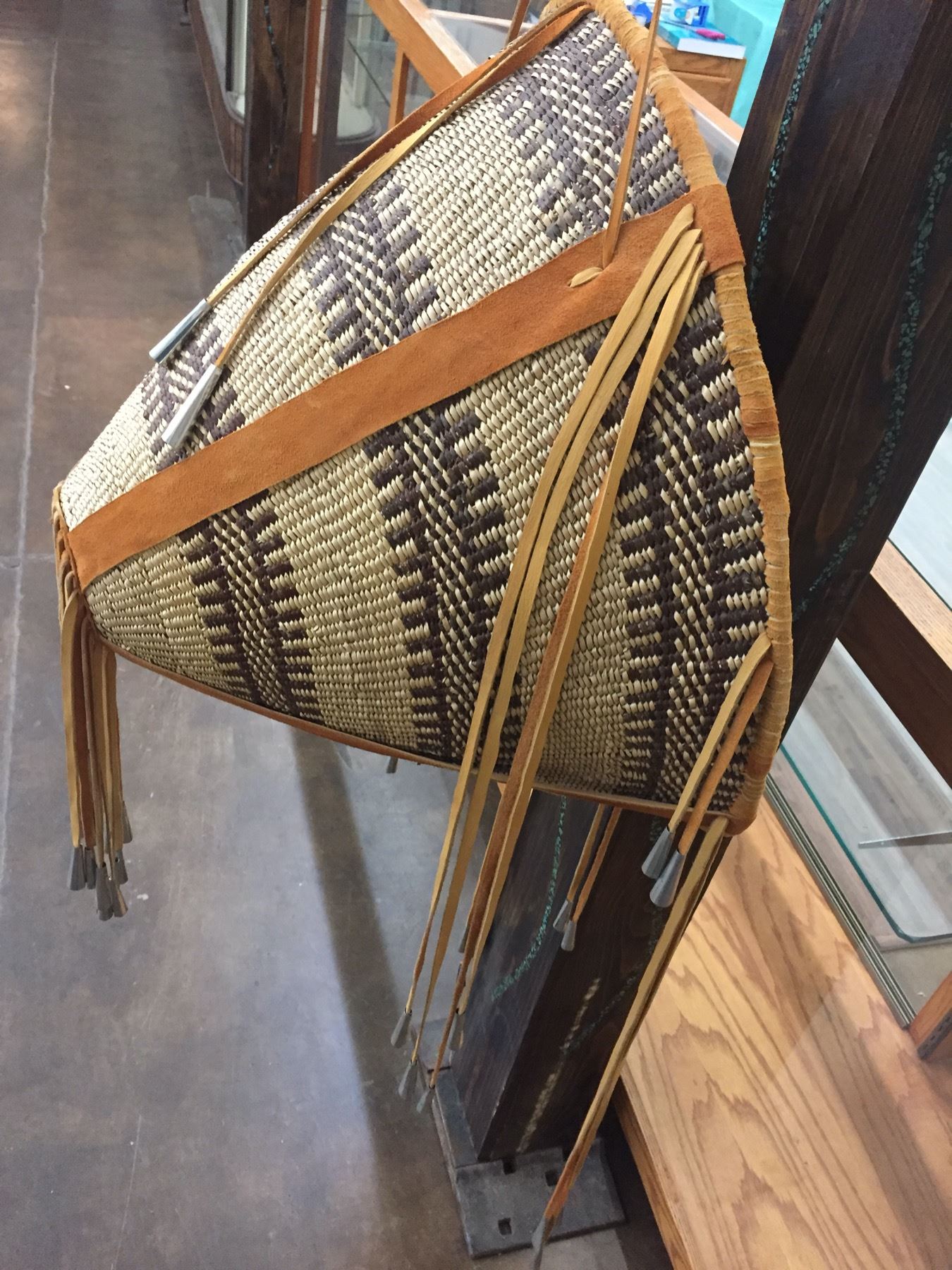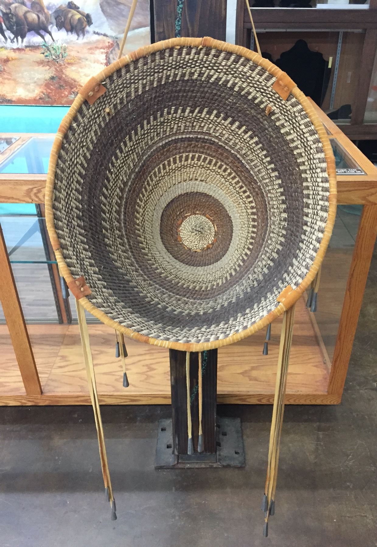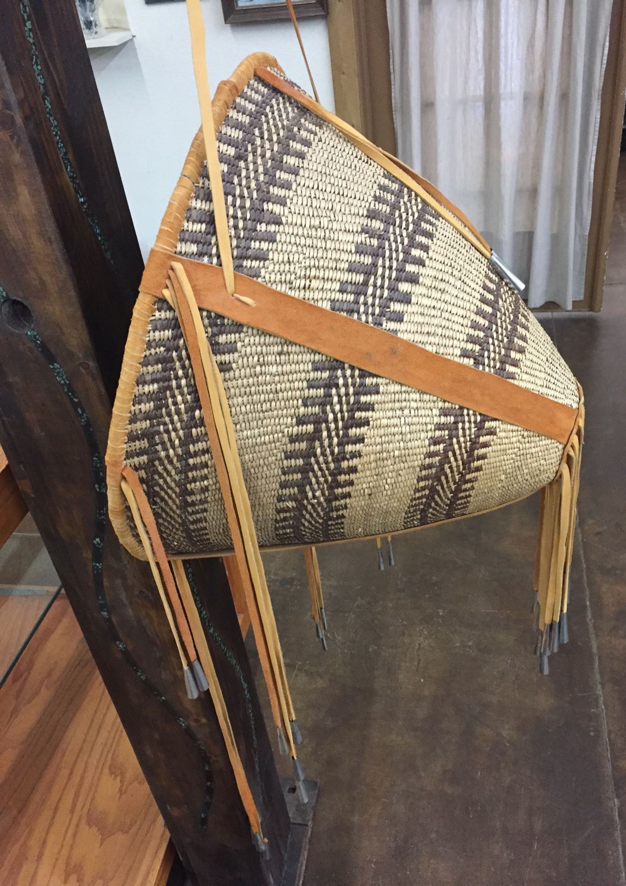 Description: For sale in this lot we have a large Apache burden basket. It is a well made basket with banded geometric designs and jingle cones on leather fringes. Maker: Unknown Apache weaver. Approx. Age: Vintage. Size: 20-1/2 inches wide x 18 inches deep. Condition: Good for its age, normal wear expected. Please look closely at the pictures - they are an important part of our description. Shipping: There will be a $10 handling, packaging fee for shipping this lot. The actual cost of postage will be added on top of that.