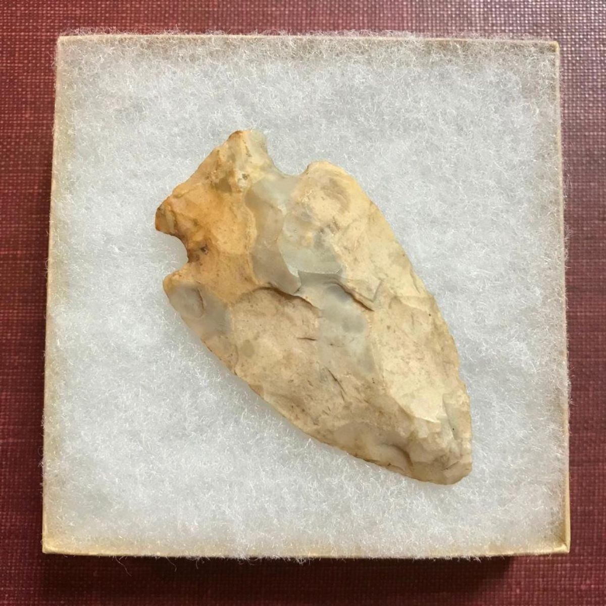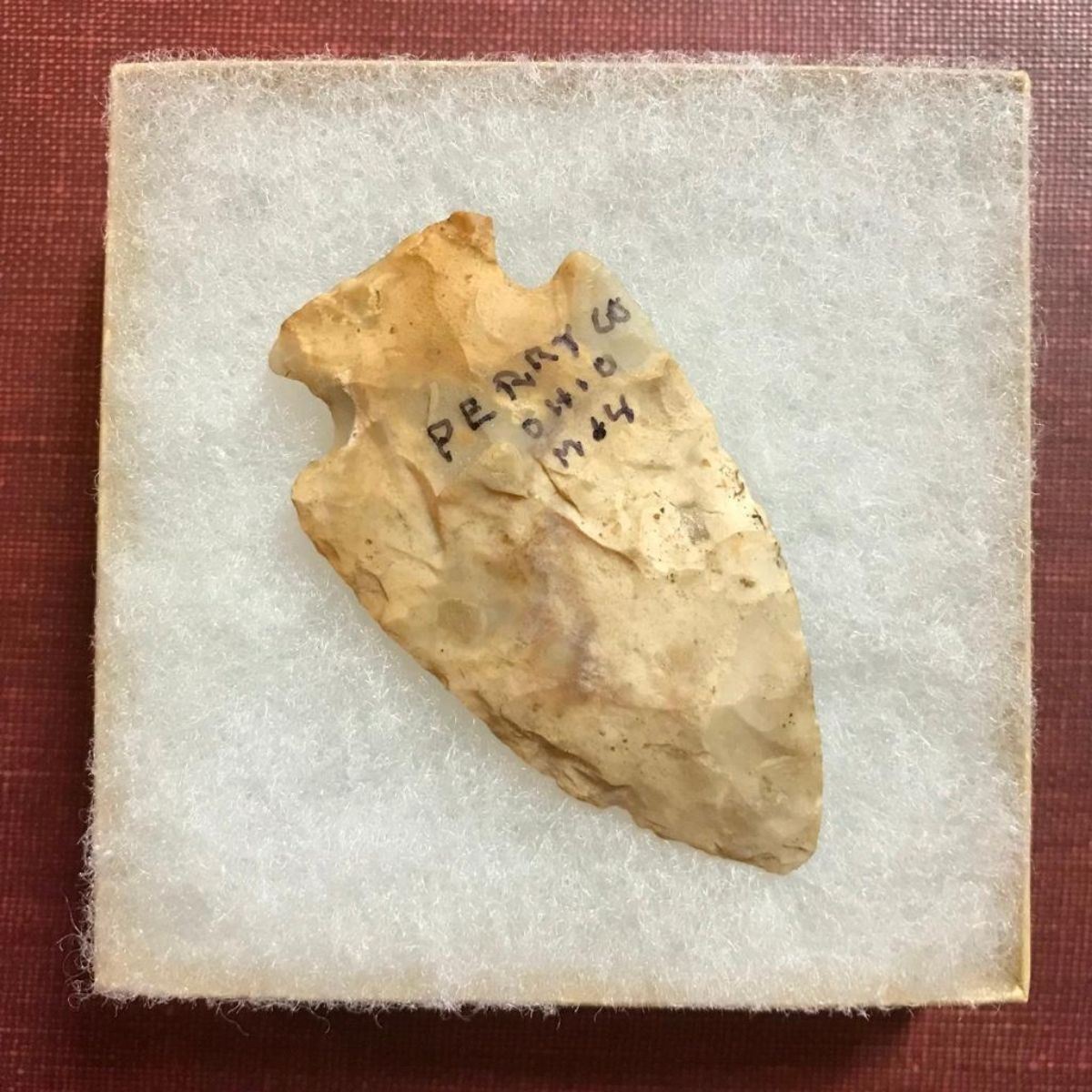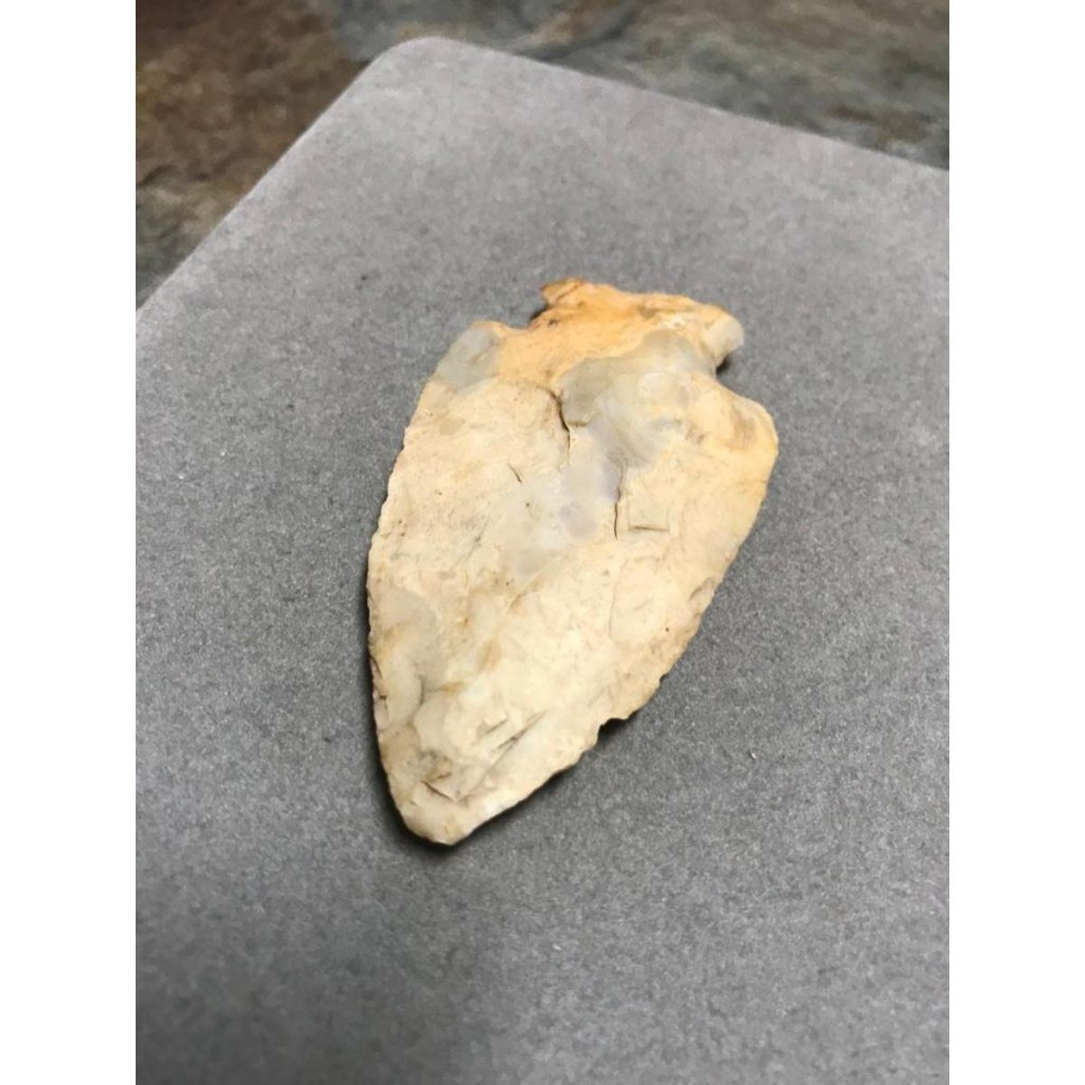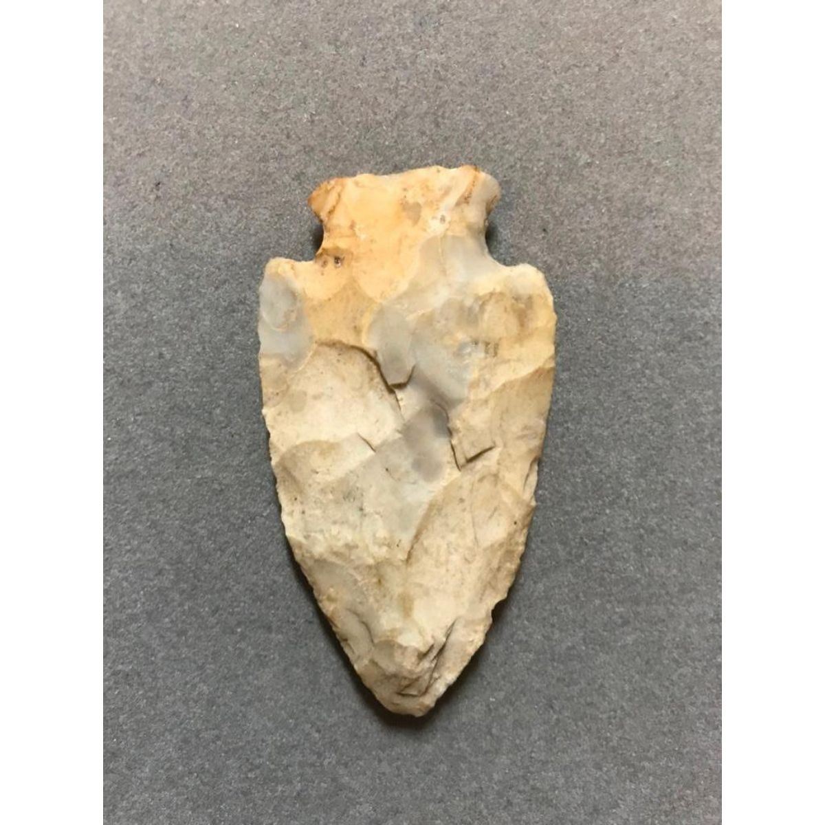Large size, Native American flint arrowhead, projectile point artifact. Big Sandy, corner notch. Cultural period - Early Archaic, Glacial period - Early Holocene. 10,000 - 8,000 B.P. Found in Perry County Ohio & marked as such, with date of 1974, on the back side. 2 7/8" X 1 5/8".