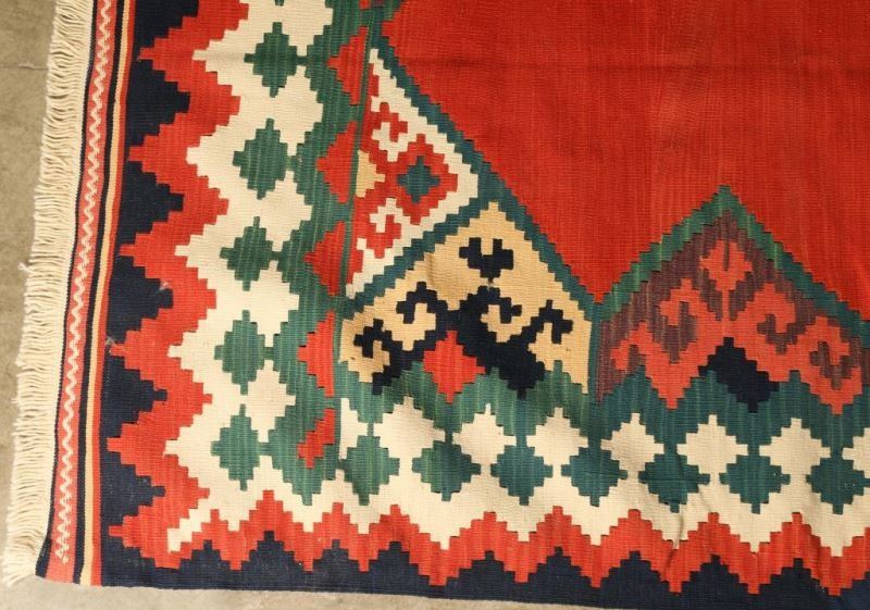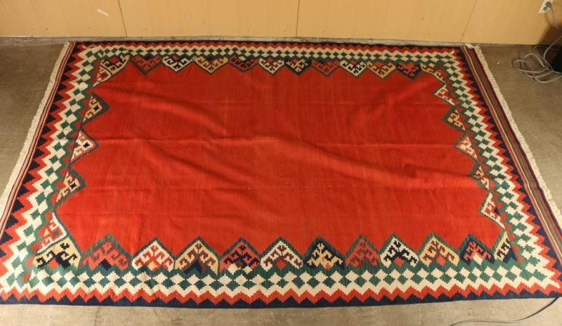 Orange red rug with geometric border in cream, gold, blue, brown and green. Good condition. Measures 78"w x116"l