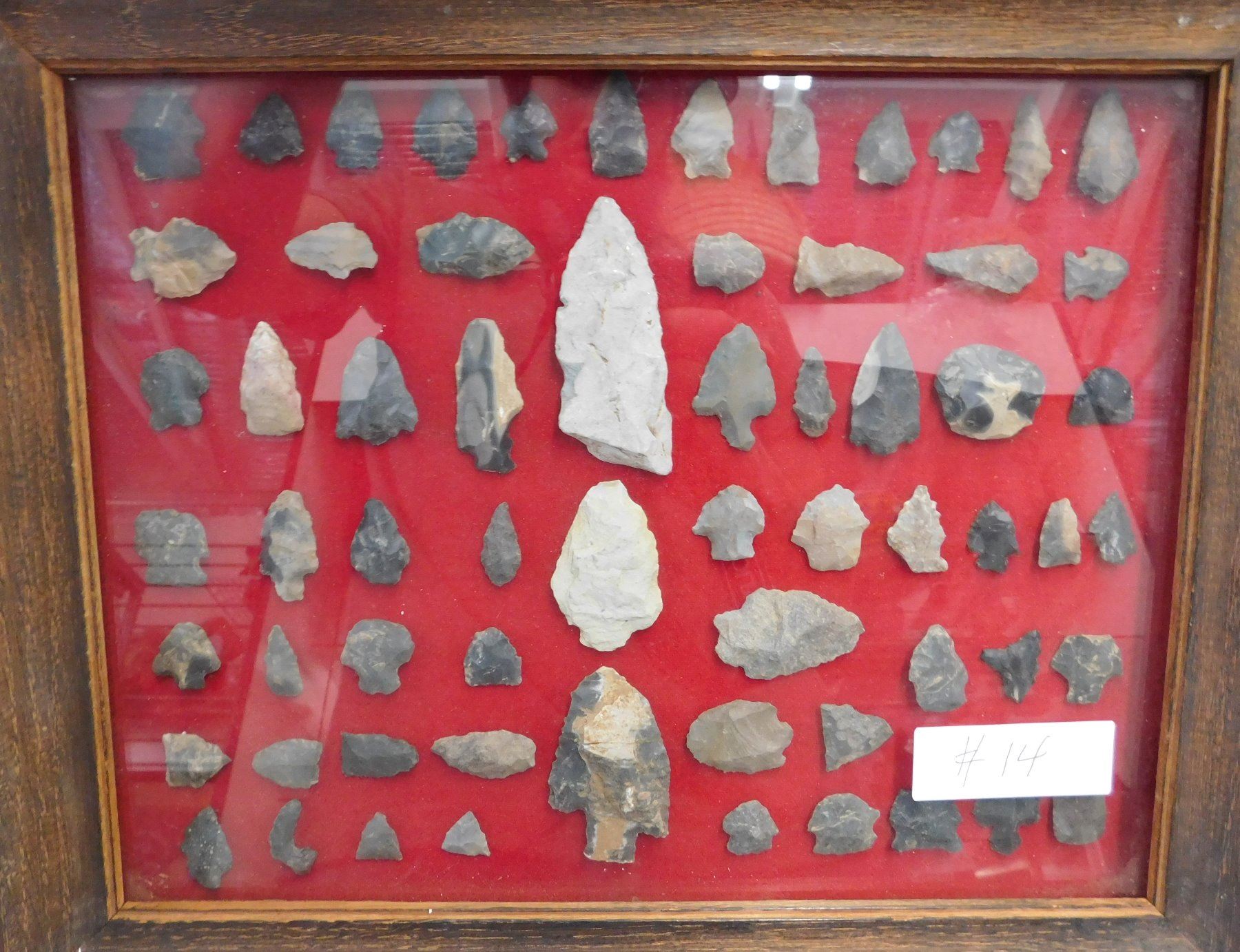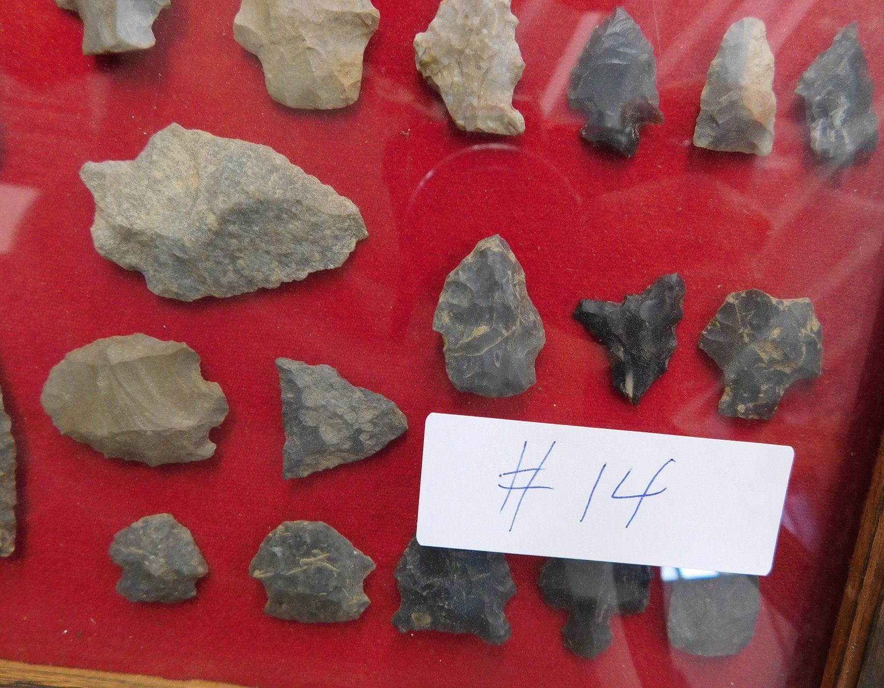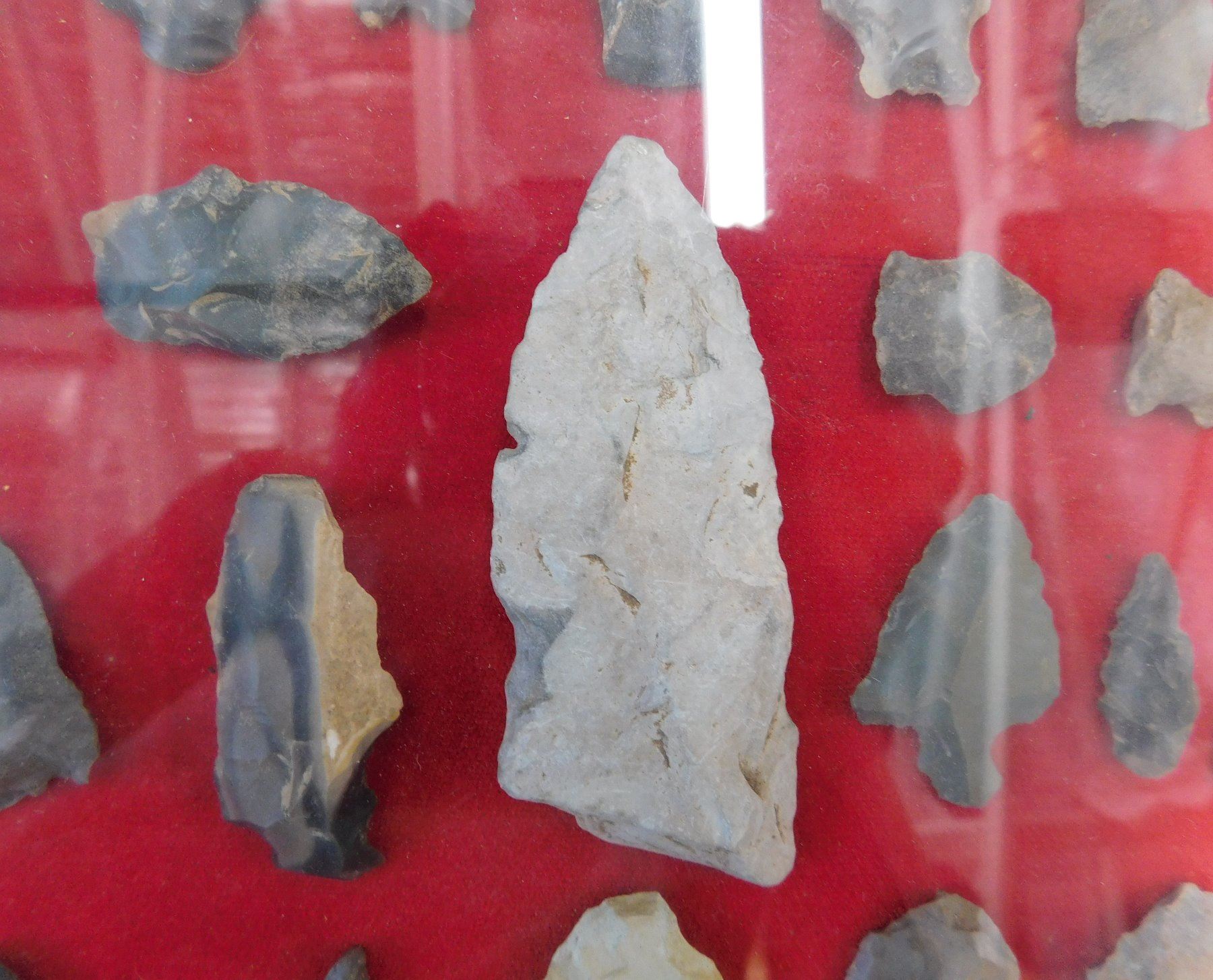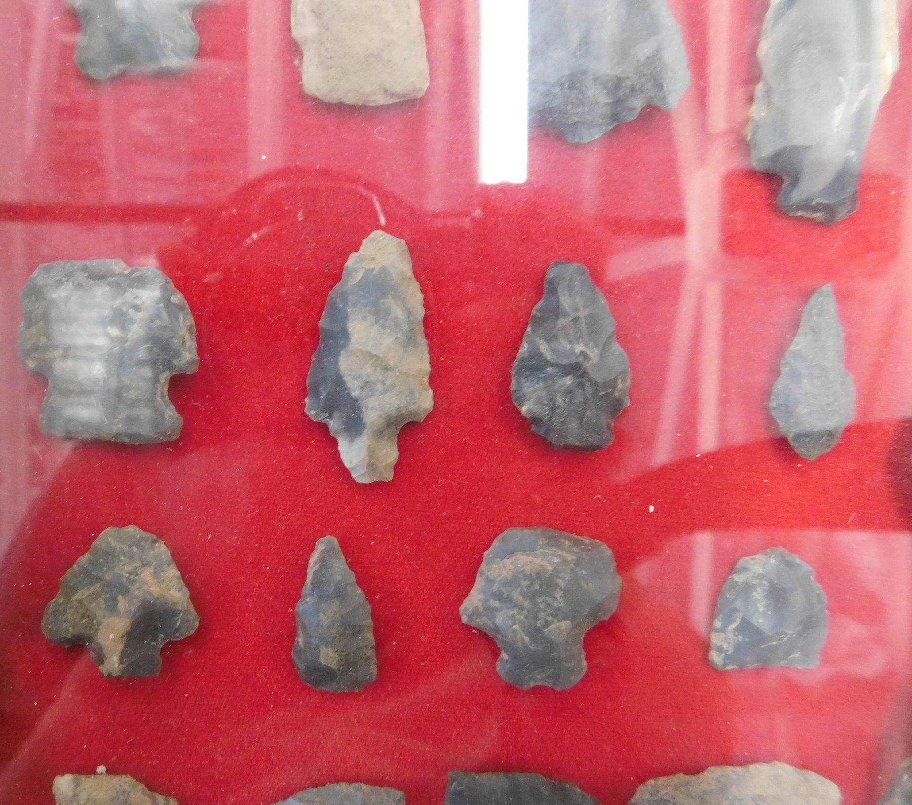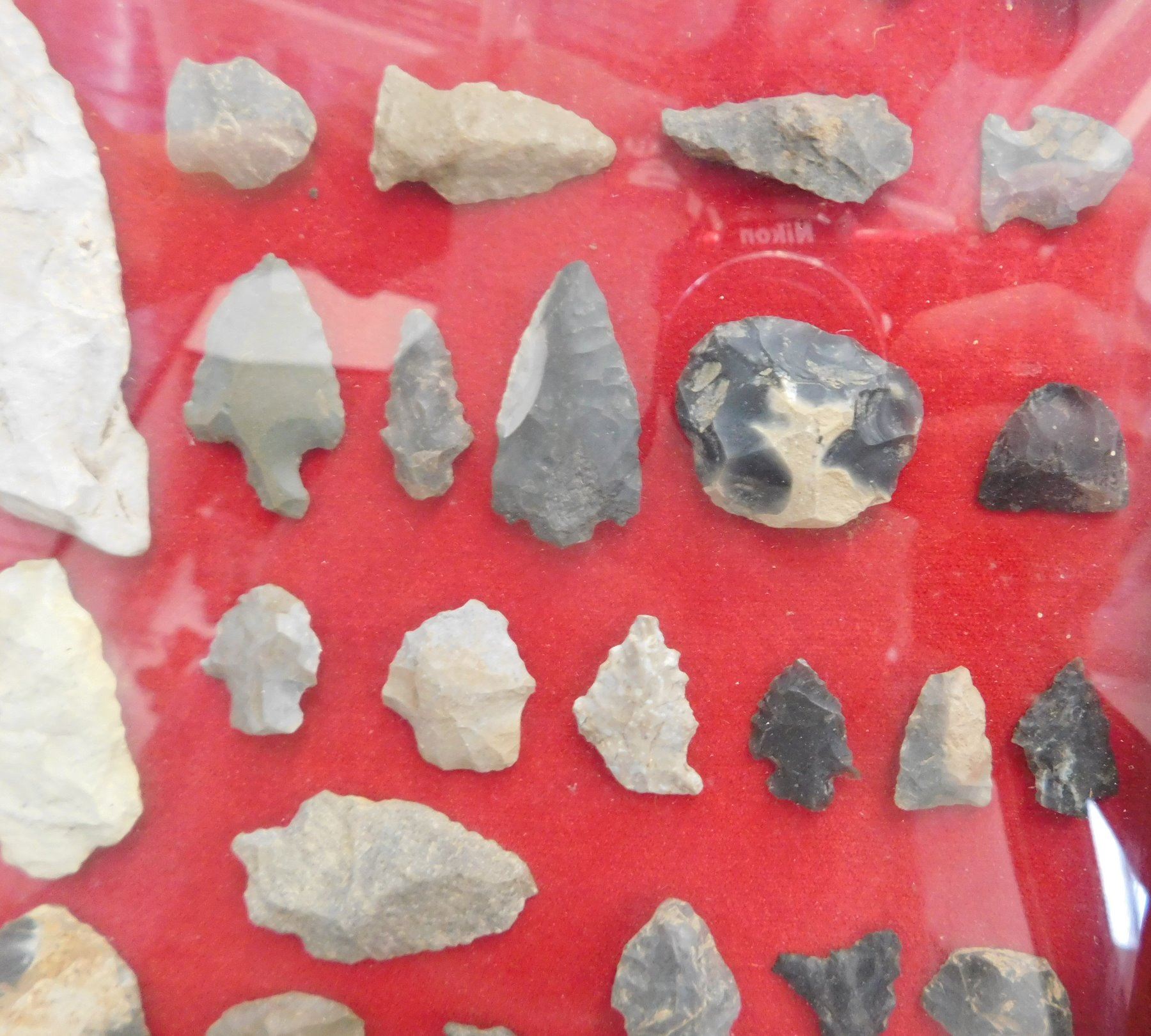 Large Arrowhead Frame, pre-historic items. Made of chert, the items measure from 1/2" to 3 1/4" long. Northeastern USA. Frame not included. Condition: As found, see images. Shipping: $22.50 w/insurance and signature.