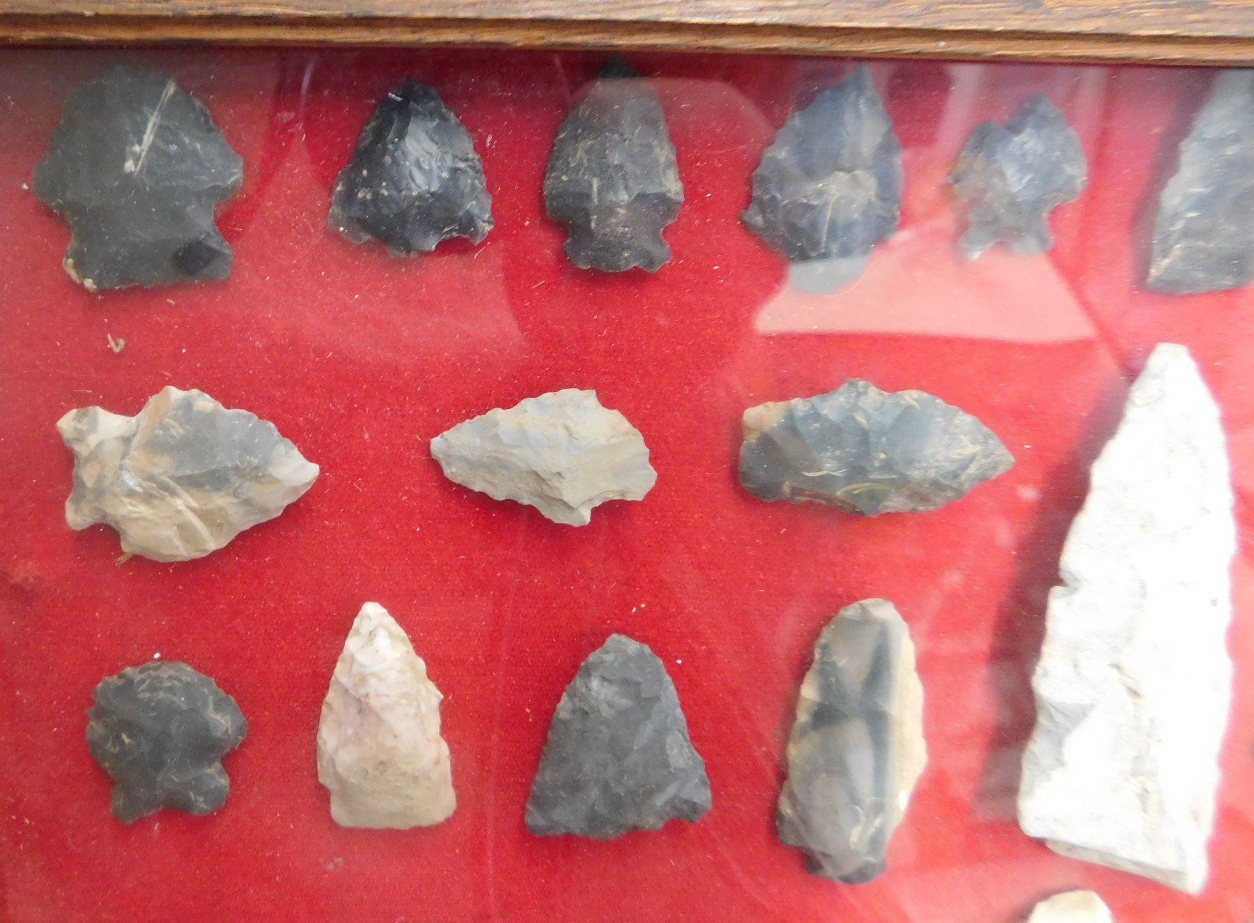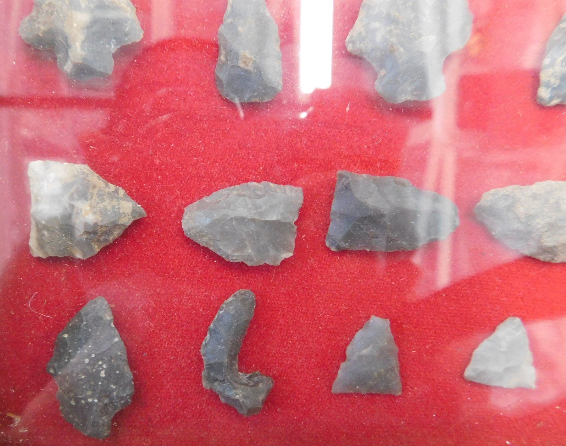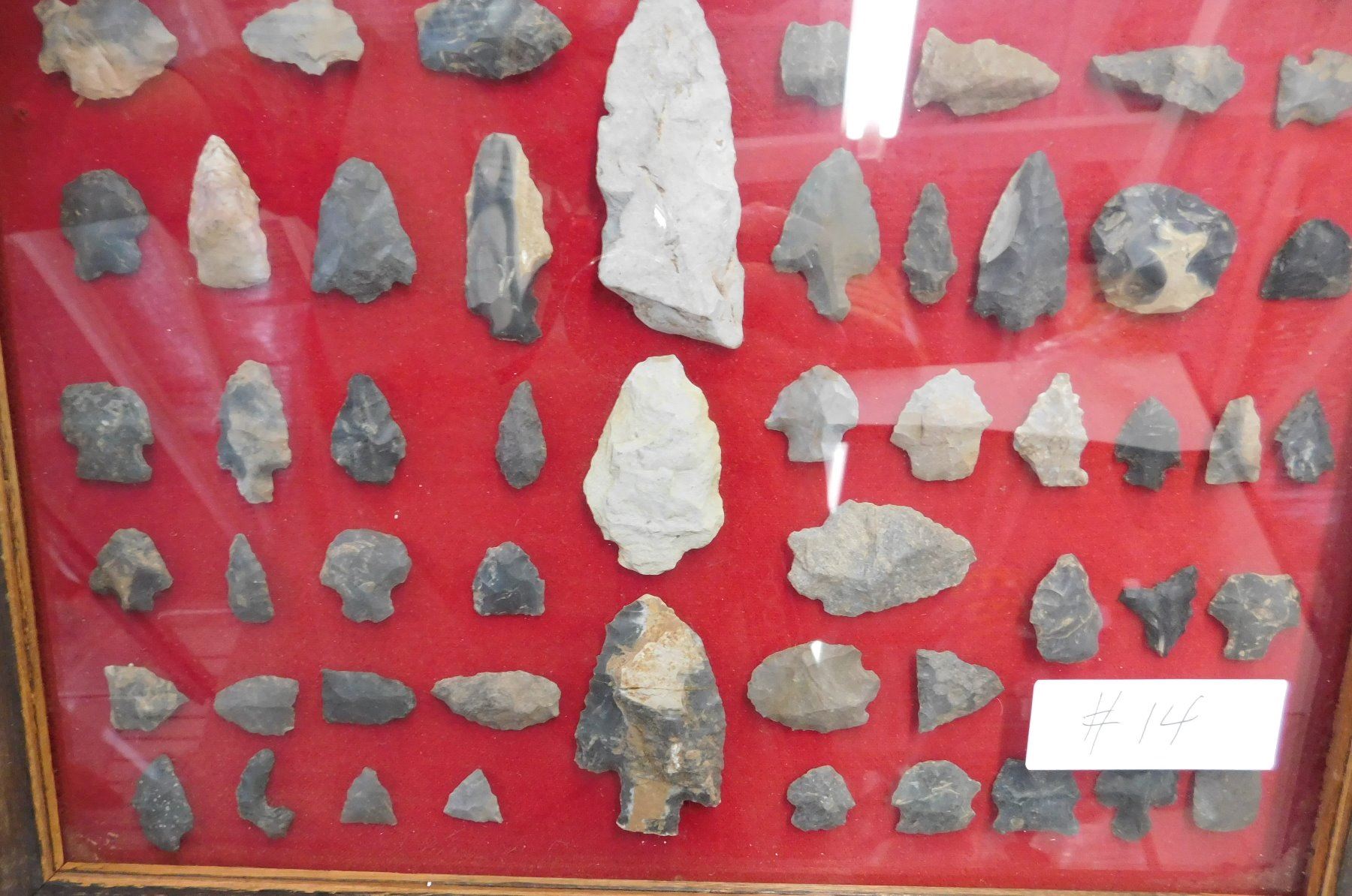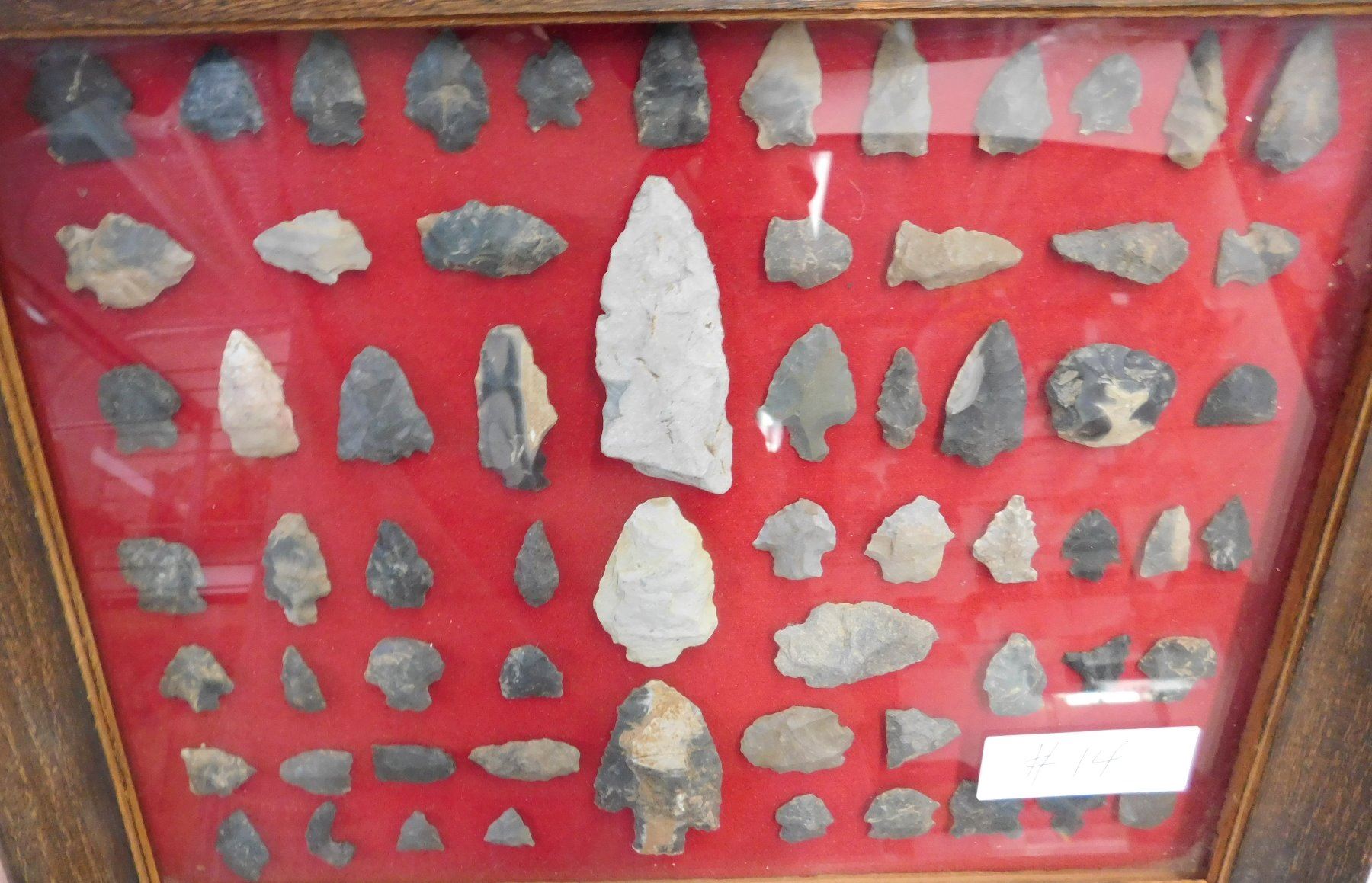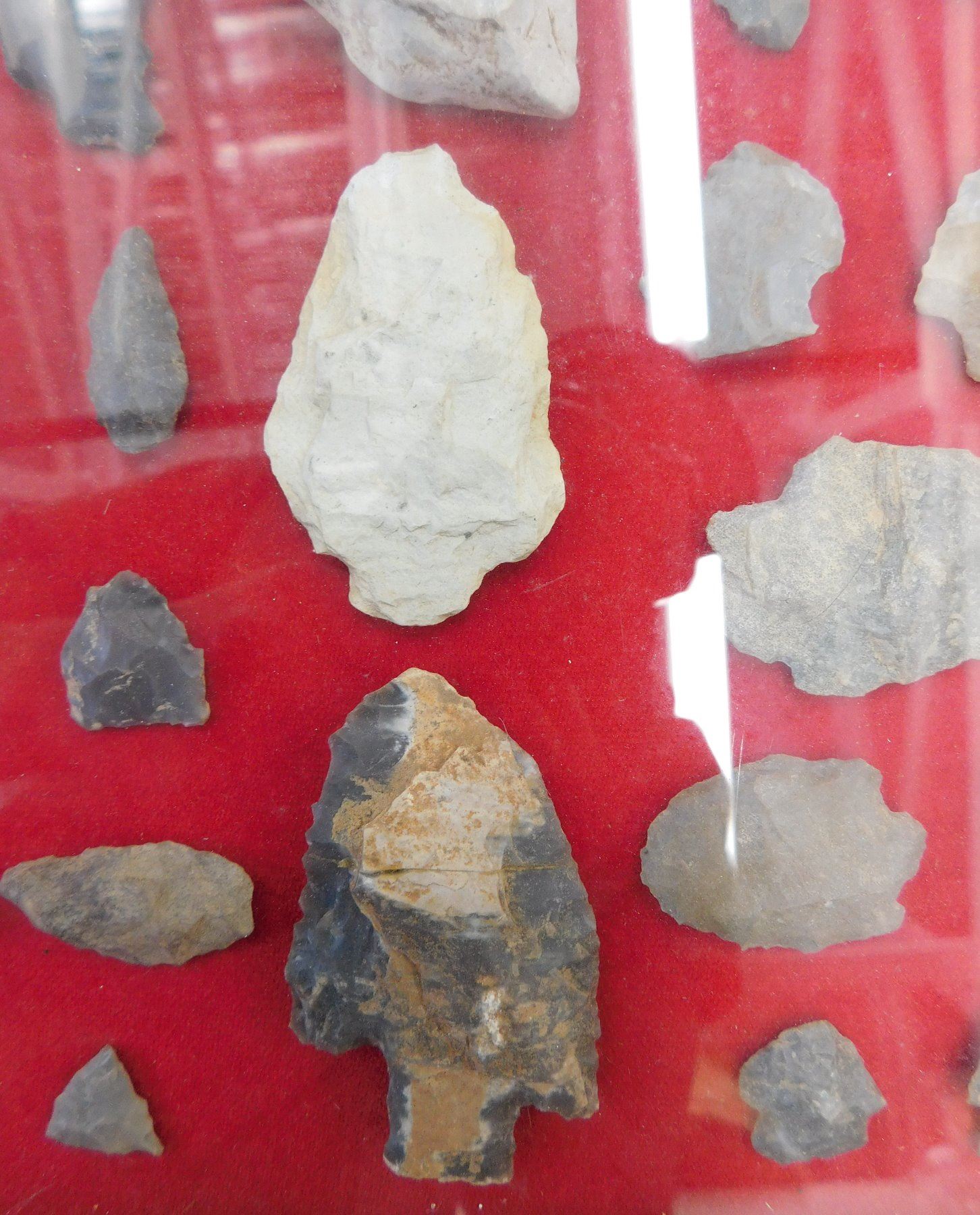 Large Arrowhead Frame, pre-historic items. Made of chert, the items measure from 1/2" to 3 1/4" long. Northeastern USA. Frame not included. Condition: As found, see images. Shipping: $22.50 w/insurance and signature.