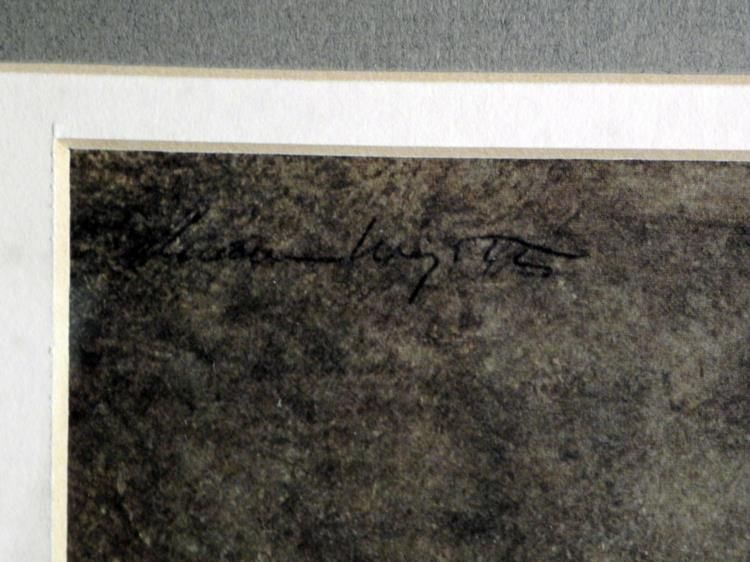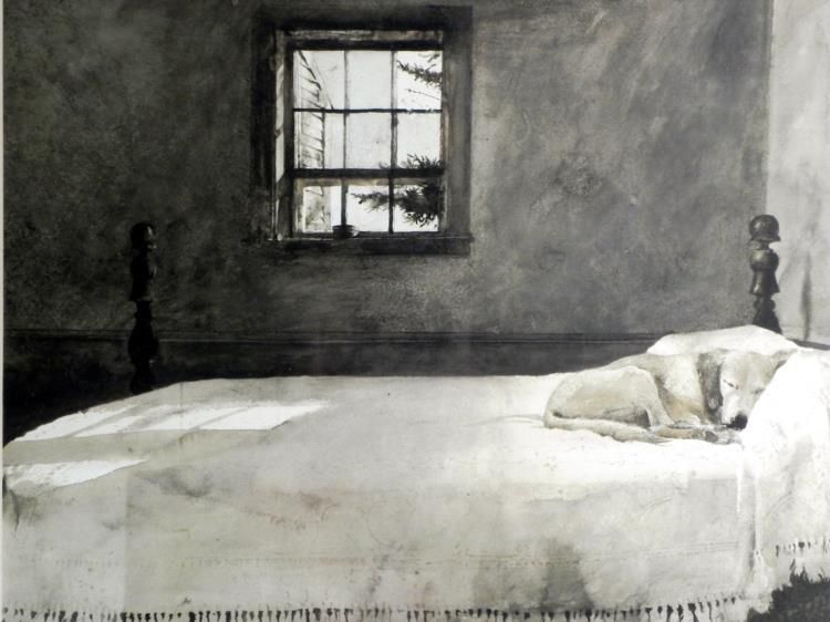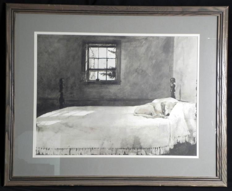 We are offering this very nicely framed print of an unknown work. It shows a nicely done bedroom with a dog on the bed. There is a signature, but it is unreadable. ---Medium: Print -Frame: Wood with Glass Covering - Image Size: 23.5" x 17.5" -Frame Size: 32.25" x 26.75" -Image Condition: Excellent -Frame Condition: Excellent