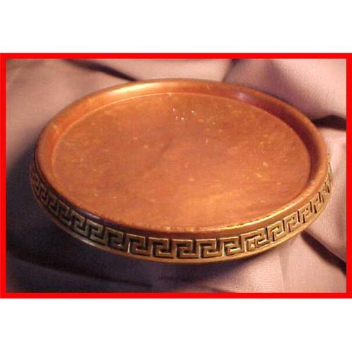 This 9-1/4" in diameter hammered copper low dish has a Greek Key decoration band around the perimeter rim. I have taken the felt off the bottom(SEE PHOTO); but cannot find any markings. Fair condition with some denting and slightly loose decoration band(SEE PHOTO). Found patina. This Arts & Crafts period copper item was found at a local estate auction.