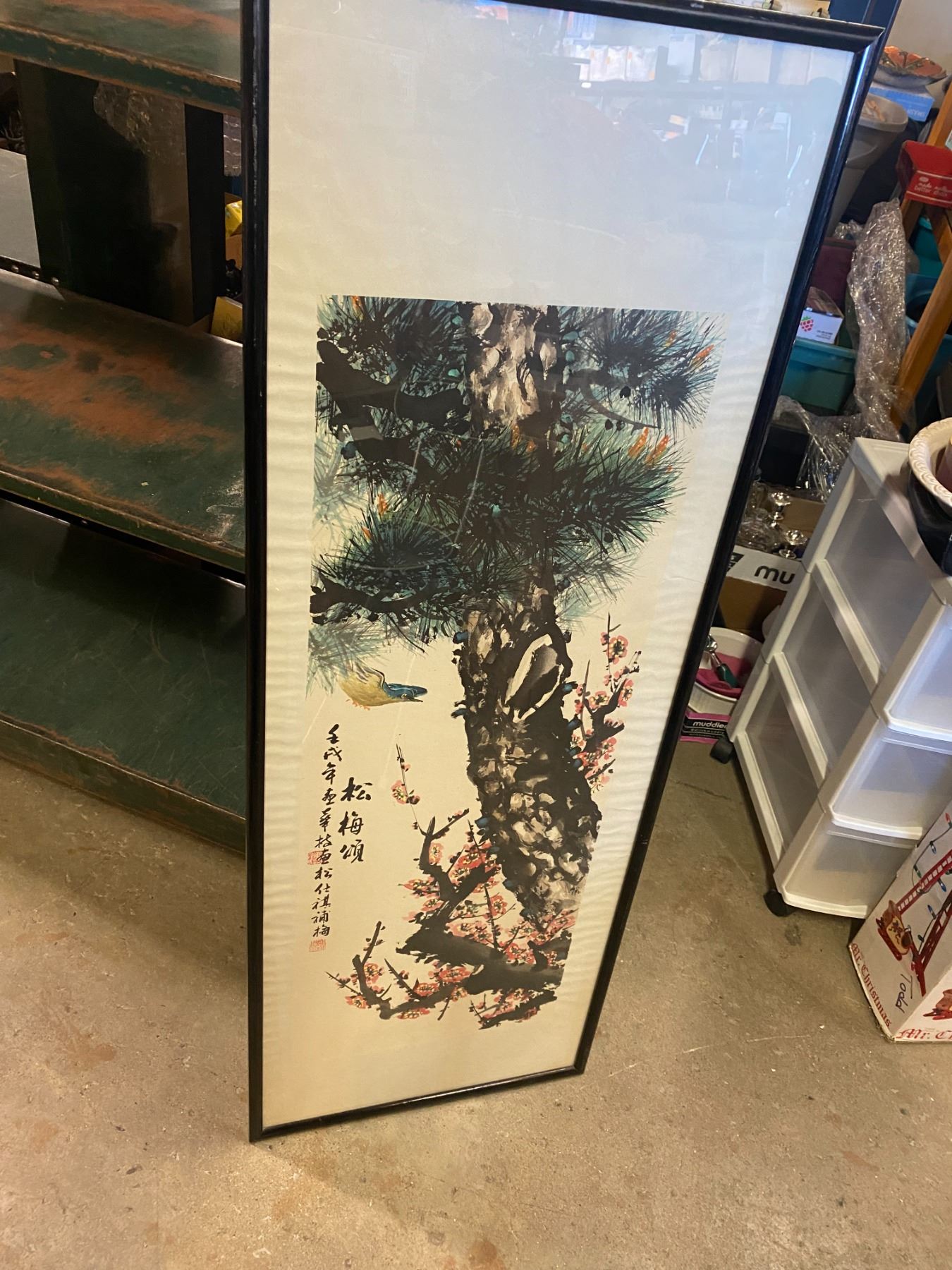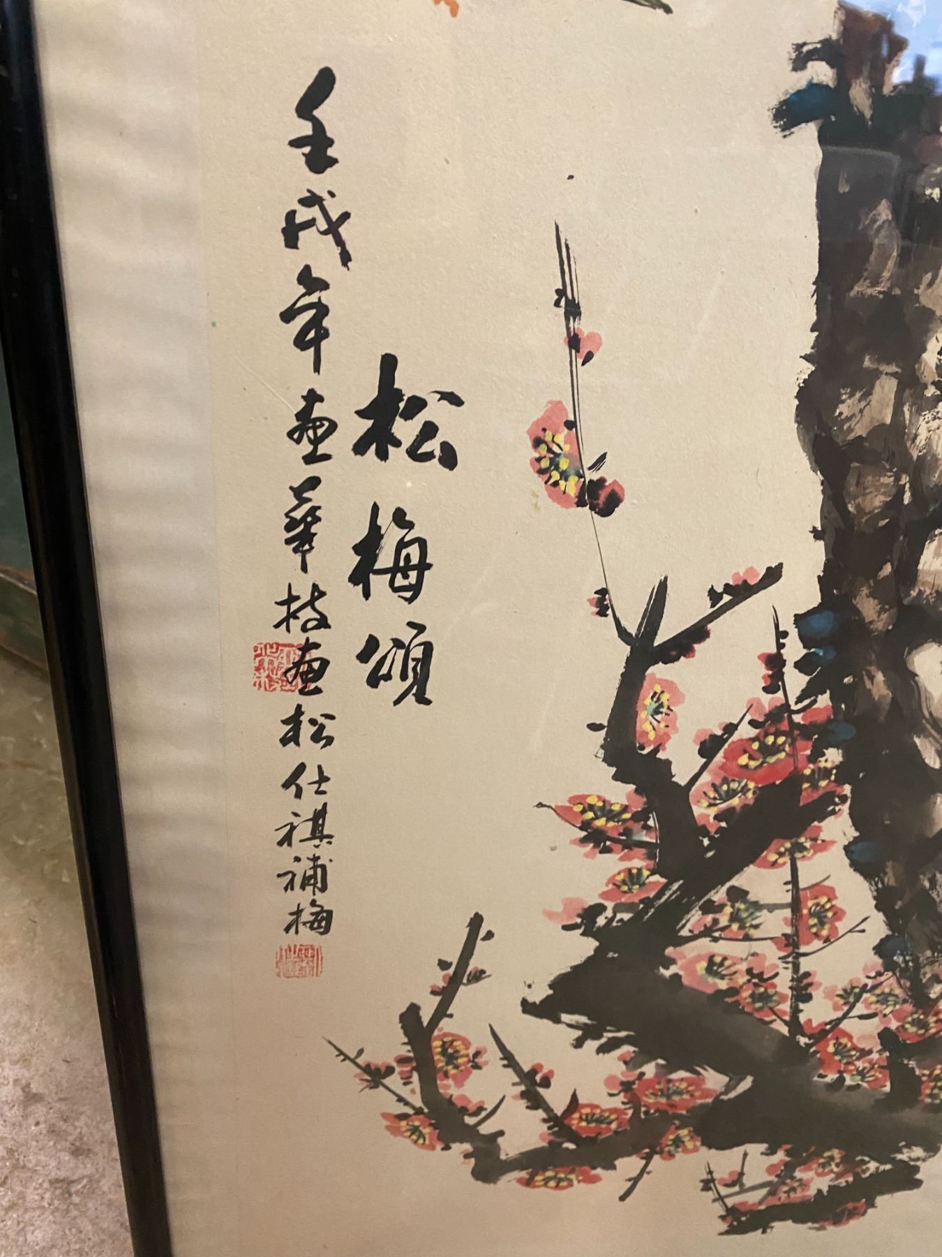 Large Asian "Pine & Blossom " signed painting 18 by 49 inches